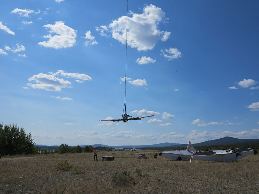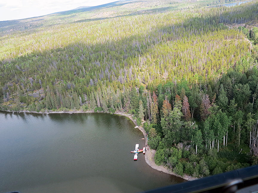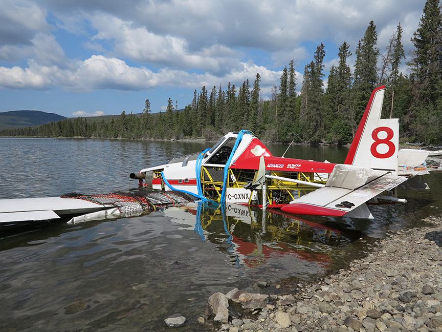 On 14 August 2014, an Air Tractor AT-802A on amphibious floats, C-GXNX, was carrying out wild fire fighting operations off Chantslar Lake, British Columbia along with 3 other aircraft of the same model. C-GXNX was second in the formation on a touch-and-go maneuver to pick up water. Upon lift-off, a control issue occurred and the aircraft struck the water, separated from the floats but remained upright and subsequently sank. The pilot was wearing a helmet, a personal floatation device (PFD) and a 4-point safety harness. The pilot received minor injuries, exited the aircraft on his own and inflated the PFD.