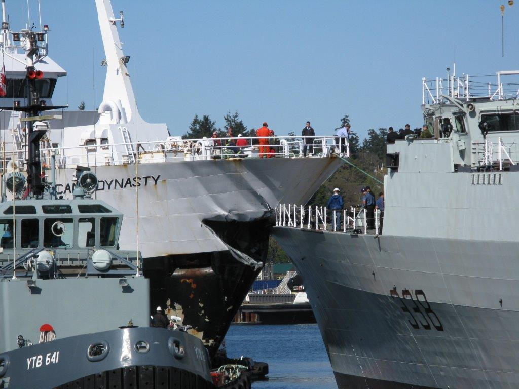 On 23 April 2013, the fishing trawler American Dynasty struck the HMCS Winnipeg while being towed to the graving dock in Esquimalt, British Columbia. There were injuries reported on the HMCS Winnipeg.