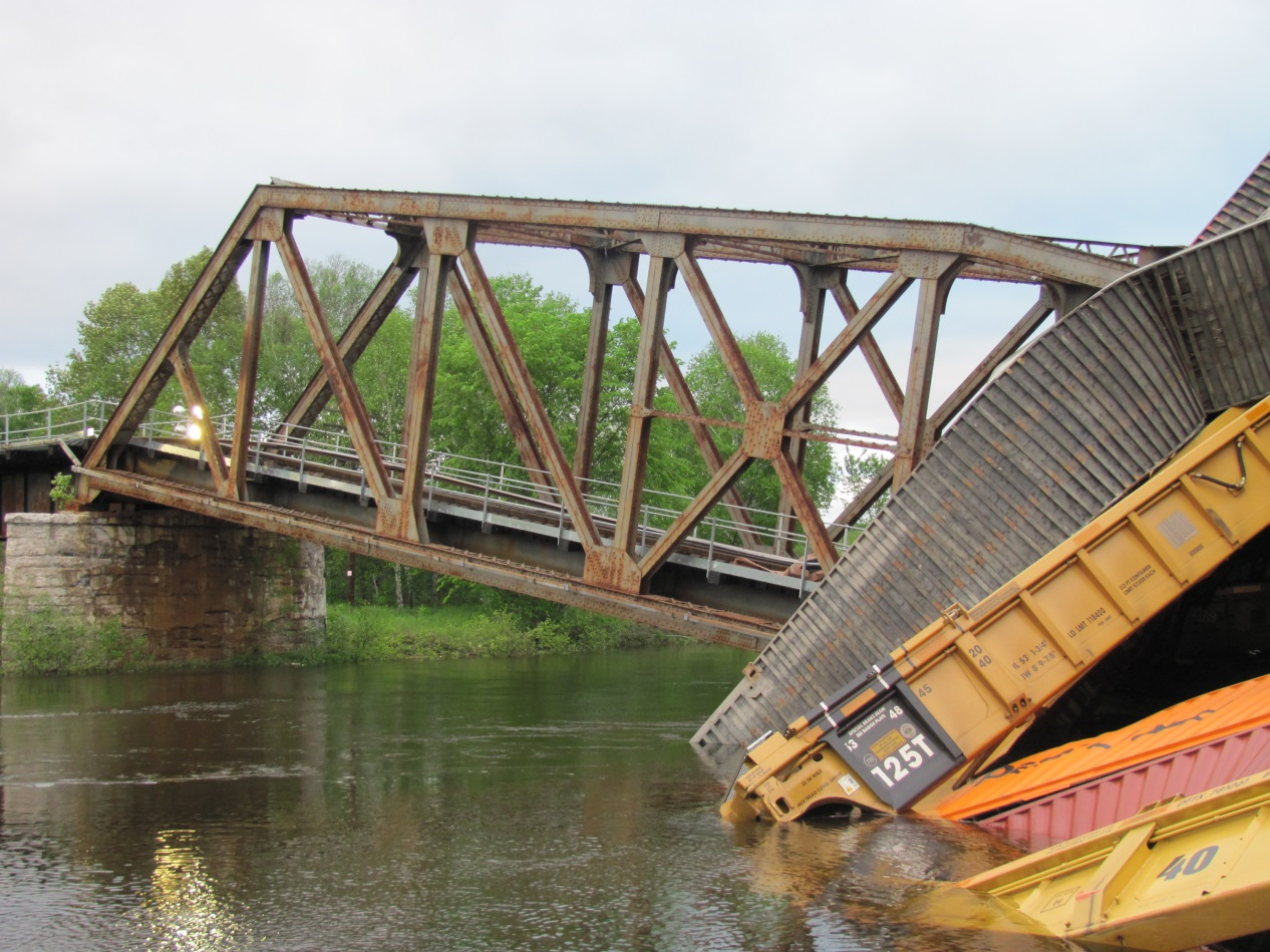 On 02 June 2013, at about 1000 Eastern Daylight Time, Canadian Pacific Railway freight train 119-01 was proceeding northward at 35 mph when 6 cars (including 12 car bodies and 20 containers) derailed. Some of the derailed cars struck the railway bridge that traversed the Wanapitei River (Mile 112.80 on the Parry Sound Subdivision) near Wanup, Ontario. As a result of the impact, the bridge collapsed and 7 containers, some carrying dangerous goods, fell into the river. Two containers sunk to the bottom of the river and the other 5 containers remained afloat. There were no injuries, and no dangerous goods were released.