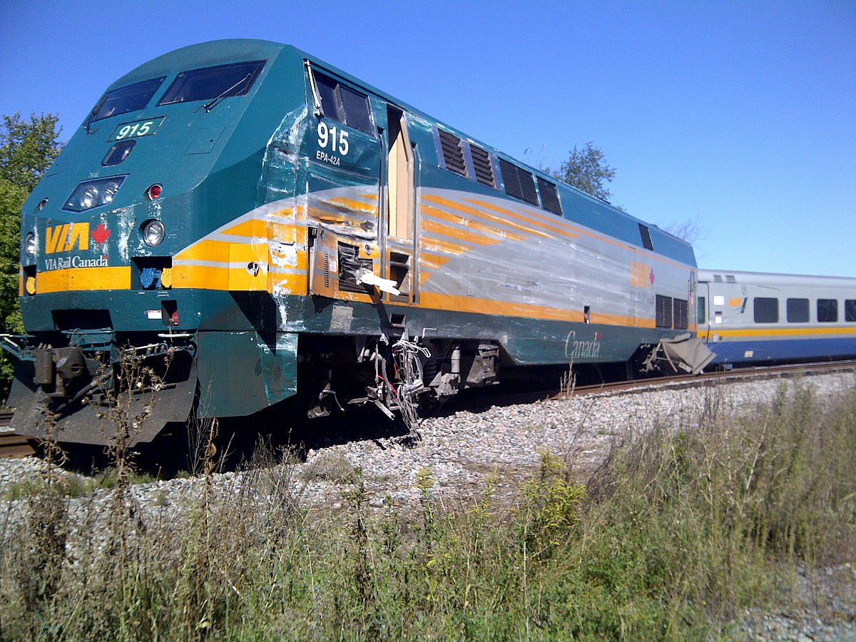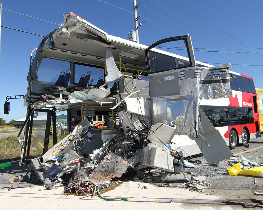 On 18 September 2013, at about 0832 Eastern Daylight Time, westward VIA Rail Canada Inc. (VIA) passenger train No. 51 departed from the VIA Ottawa Station on time and proceeded en route to Toronto. At 0847:27, OC Transpo double-decker bus No. 8017 departed from the Fallowfield Station on the OC Transpo bus Transitway. At 0848:06, while proceeding at about 43 mph, the train entered the OC Transpo Transitway crossing, located at Mile 3.30 of VIA’s Smiths Falls Subdivision. At the time, the crossing lights, bells and gates were activated. The northbound bus was travelling at about 5 mph with the brakes applied when it struck the train. As a result of the collision, the front of the bus was torn off. The train, comprising 1 locomotive and 4 passenger cars, derailed but remained upright. Among the bus occupants, there were 6 fatalities and 9 serious injuries, and about 25 minor injuries were reported. No VIA crew members or VIA passengers were injured.