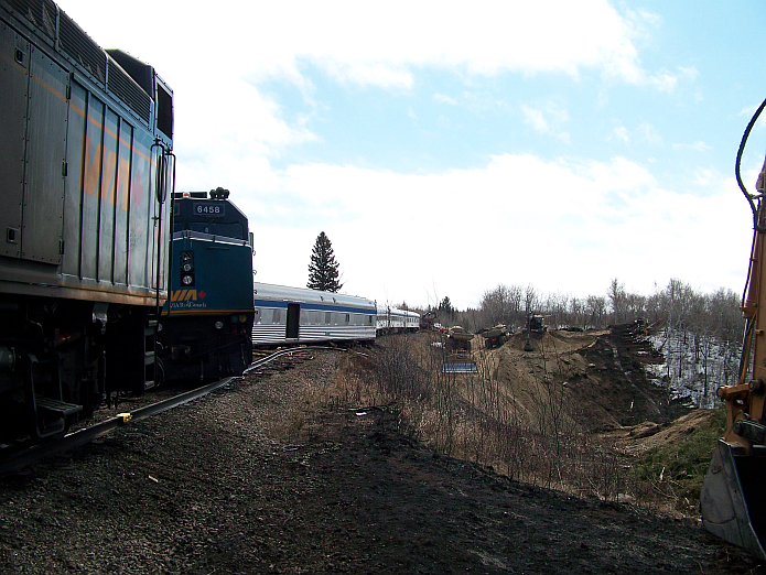 On 28 April 2013, at approximately 1840 Central Standard Time, VIA Rail northward passenger train No. P69341-28 encountered a roadbed slump at Mile 83.55 of the Canadian National Railway Togo Subdivision, near Togo, Saskatchewan. The two locomotives and the two leading cars derailed. The fuel tanks on both locomotives ruptured, leaking diesel fuel that ignited and burned until it dissipated into the subgrade material. There were no injuries.