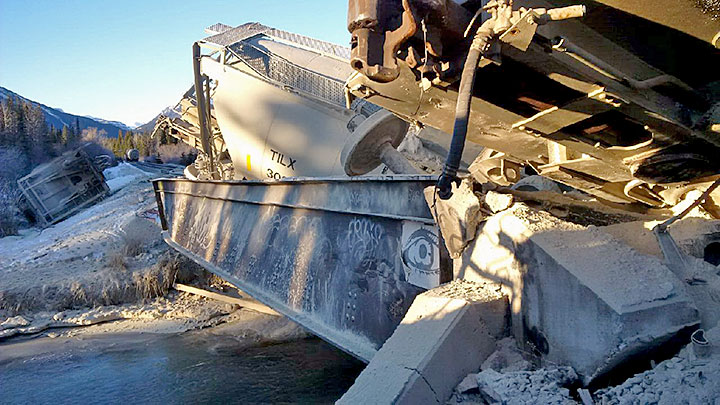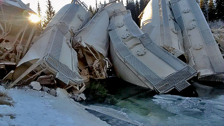 On , at 0052 Mountain Standard Time, westbound Canadian Pacific train 205-25 derailed 15 cars at Mile 82.1 on the Laggan Subdivision, near Banff, Alberta. The derailment destroyed the bridge over Forty Mile Creek and cars loaded with fly ash, soybeans and lentils were breached, spilling product into the waterway. No injuries were reported. However, a crew member sought medical attention for fly ash inhalation.