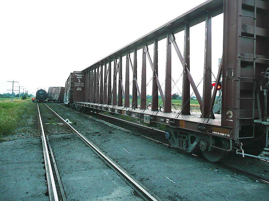 On , at about 1412 Eastern Daylight Time, Canadian National (CN) freight train M36831-01 (CN 368) was proceeding eastward on the north main track of the CN Kingston Subdivision when it experienced a train-initiated emergency brake application and derailed at Mile 153.92. The CN crew immediately made an emergency radio broadcast as the train slowed. At about the same time, VIA Rail Canada Inc. (VIA) passenger train No. 47 (VIA 47) was proceeding westward on the south main track when its crew observed that CN 368 was derailed. Upon hearing the emergency radio broadcast, the VIA crew initiated an emergency brake application. As the 2 trains were slowing to a stop, a derailed centre beam bulkhead flat car struck VIA 47’s lead locomotive and then scraped along the north side of the 5 VIA coaches. The tail-end 6 cars on CN 368 derailed and were damaged. As a result, the front of the VIA locomotive and the north side of the VIA coaches sustained impact damage. The fuel tank on the VIA locomotive was punctured and released about 1000 litres of diesel fuel. There were no injuries.
