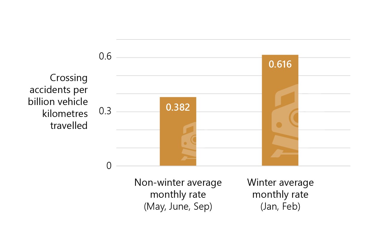 Every year, approximately 23 people are killed and another 28 seriously injured in railway crossings in Canada. In 2019, 29% of crossing accidents resulted in fatal or serious injuries, making them one of the deadliest types of rail accidents. To improve transportation safety in Canada and internationally, it is important for the TSB to identify and communicate safety deficiencies that contribute to these accidents so that effective safety defenses can be developed. This SII aims to augment results of prior analyses (see Figure 1) demonstrating a seasonal pattern in level crossing accidents involving motor vehicles by statistically comparing the factors contributing to level crossing accidents in winter months to those contributing to accidents in non-winter, non-vacation months.