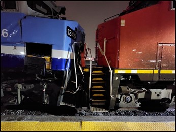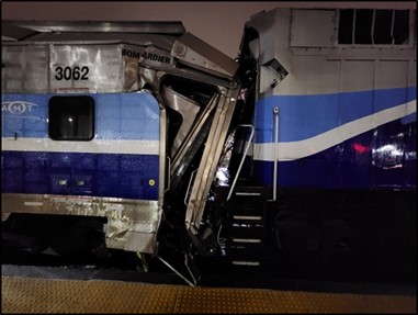 After receiving a restricting signal at the previous intermediate signal, the locomotive engineer of a CN freight train on the same track noticed the stopped commuter train in front of him. Even though the emergency brake was applied immediately, the CN train collided with the rear portion of the commuter train and pushed it approximately 110 feet before coming to rest. Both CN locomotives sustained major damage, but it was the locomotive and one of the derailed EXO train cars that sustained the most damage.