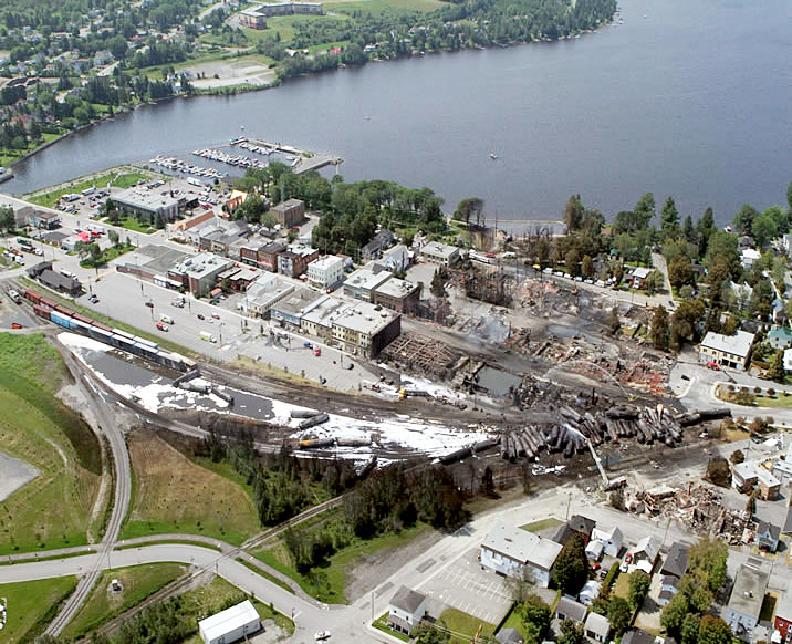 On 6 July 2013, at approximately 0115 Eastern Daylight Time (EDT), Montreal, Maine & Atlantic (MMA) freight train MMA-002 rolled uncontrolled and derailed loaded tank cars of crude oil in the town of Lac-Mégantic, Quebec. Most of the derailed tank cars lost their contents as a result of the accident, which contributed to a large fire that burned for several days. There were 47 fatalities, and approximately 32 buildings were destroyed. The crude oil leaked into the river and caused serious environmental pollution.