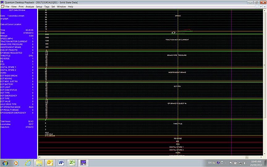 The downloaded LER records covered 5 days since 2 July, and totalled 2191 pages of data. A compressed graphic of all of the records is shown in Figure 3. By placing tags at designated moments, the period between the train coming to a stop at Nantes and the final stop after the accident was zoomed in (Figure 4). Further zoomed graphics for the period of engine shutdown, runaway, and last backward (westward) movement are shown in Figures 5−7.