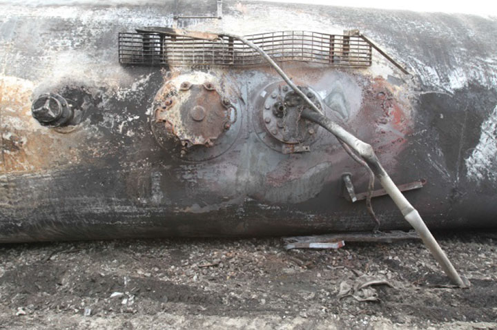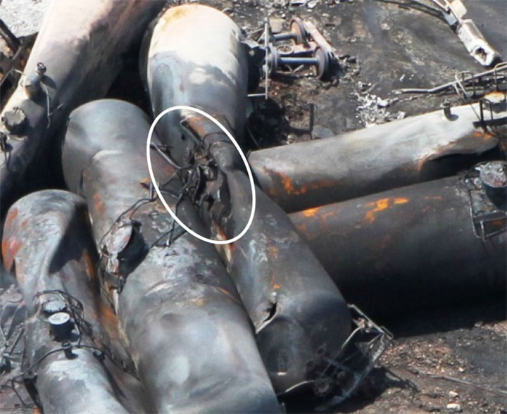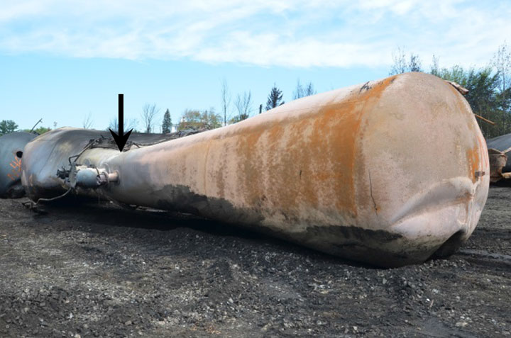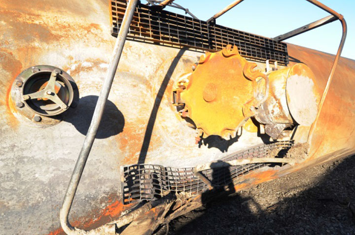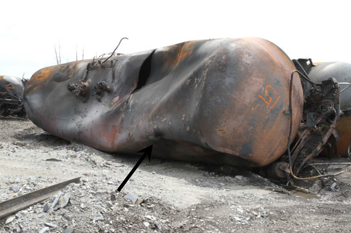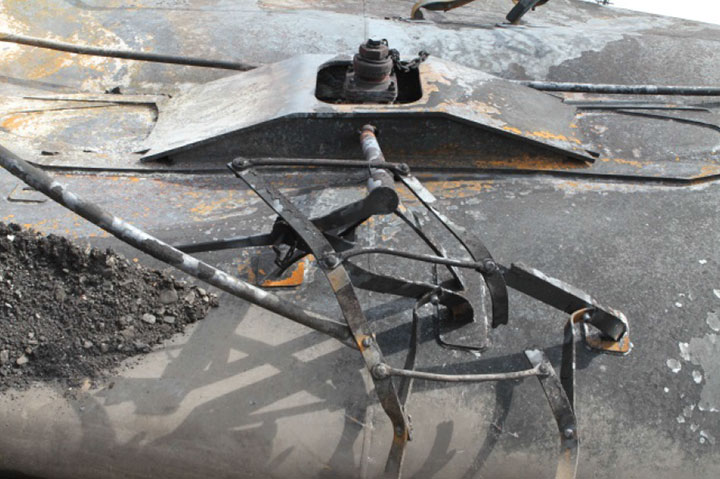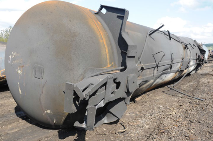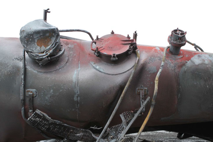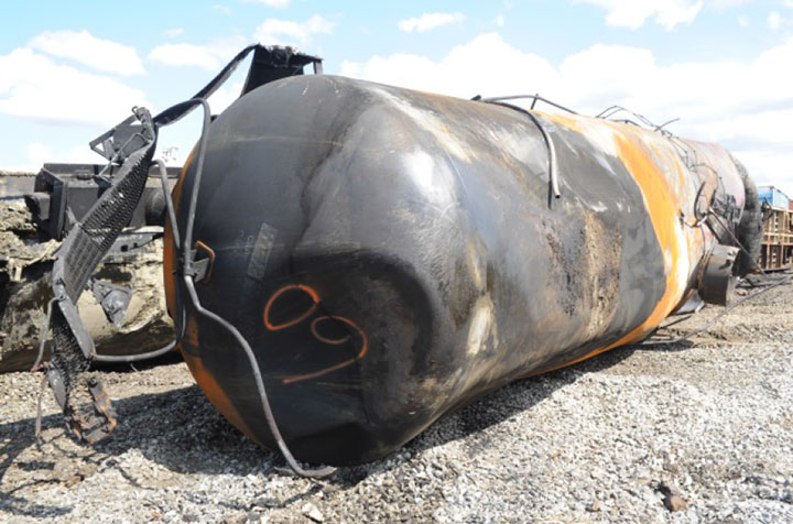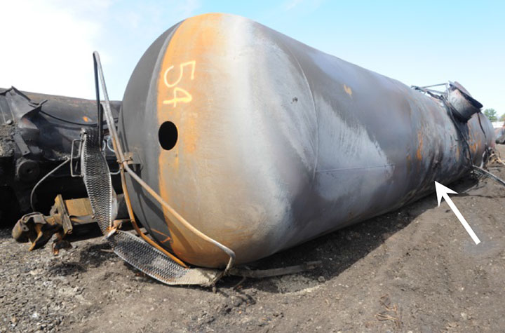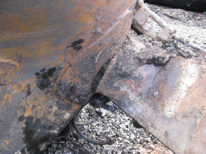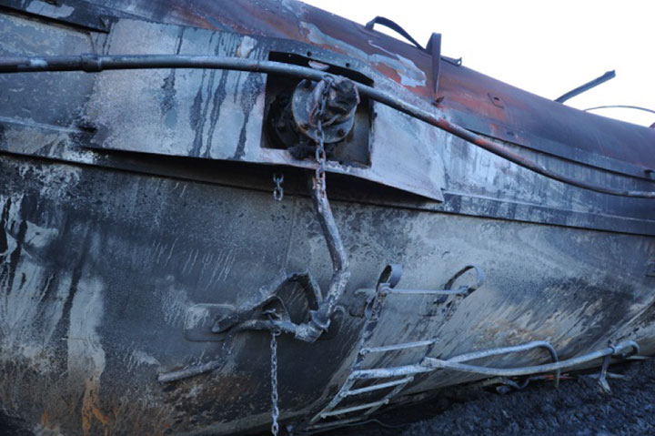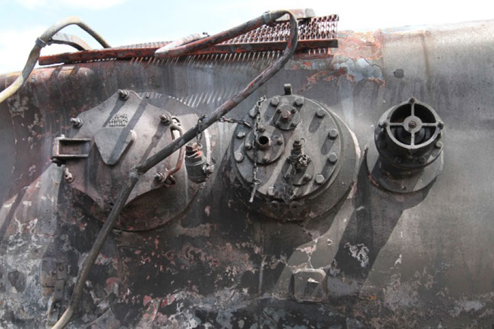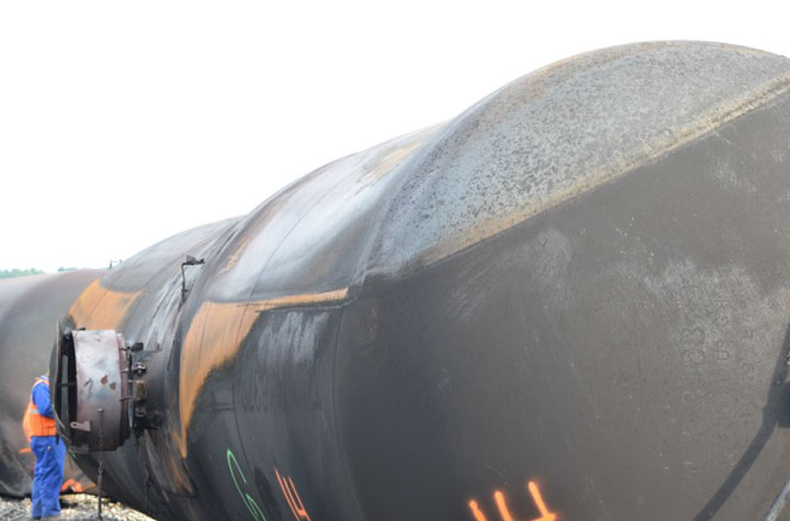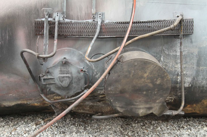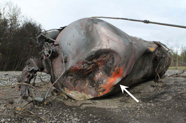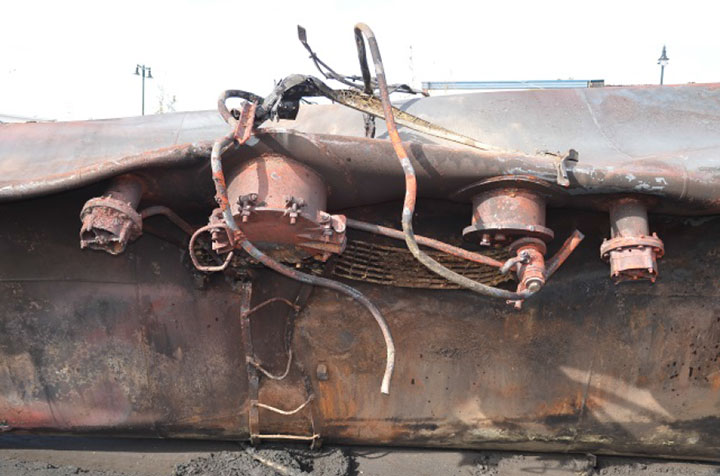 In some Tank cars, a “liquid-vapour line” was noted. This liquid-vapour line corresponds to a difference in the extent of fire damage sustained by the top and bottom portions of the tank as it came to rest. The top portion would have been in the vapour space during the post-derailment fire and thus more oxidized. The bottom portion was in the liquid space and had less fire damage due to the cooling effect of the liquid.