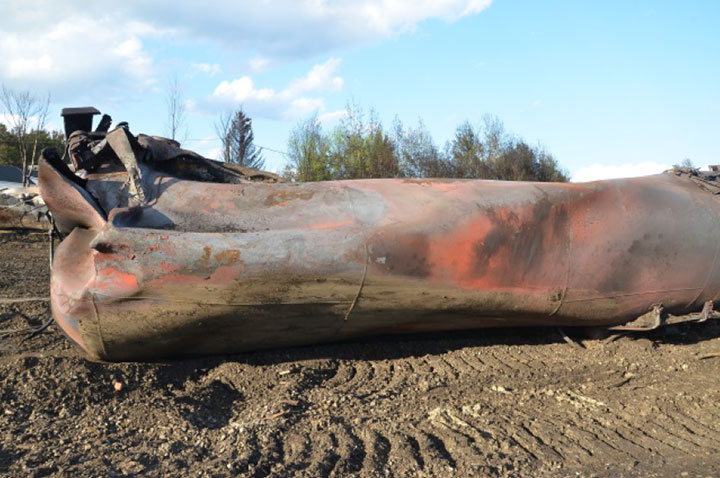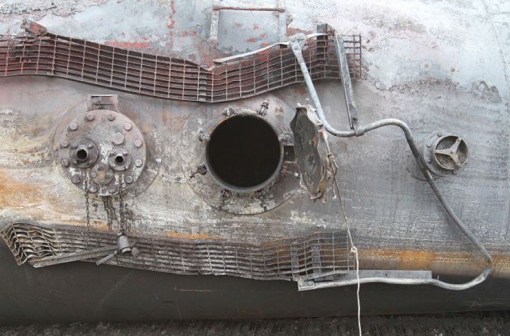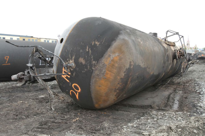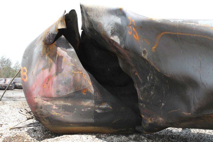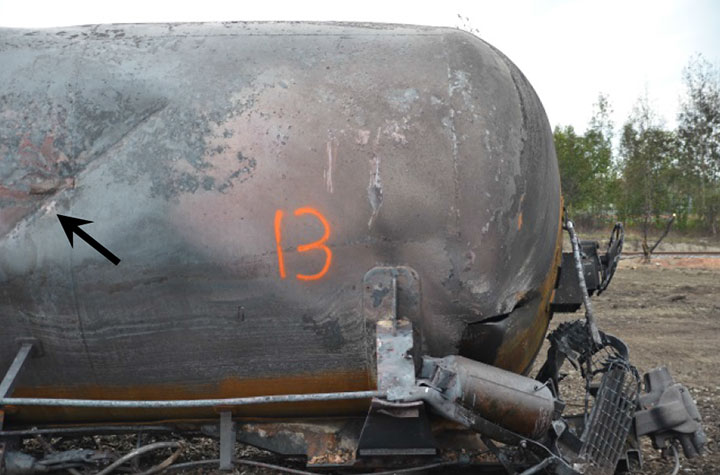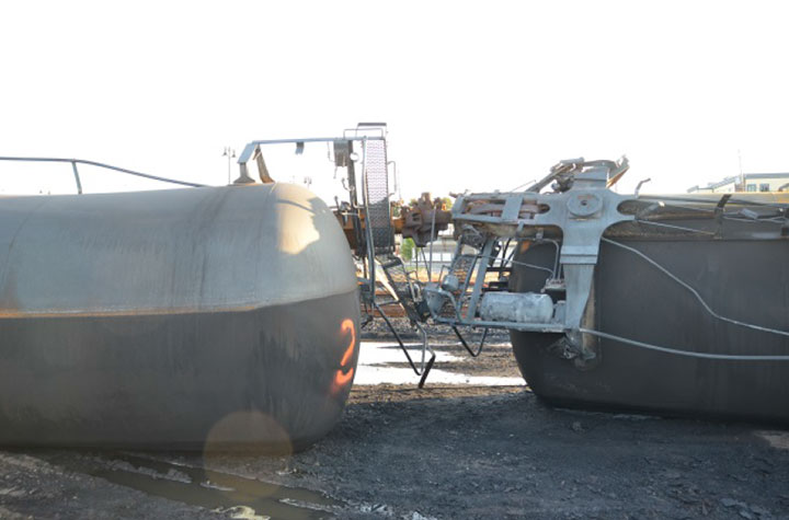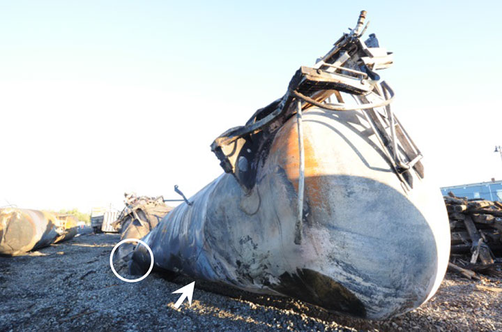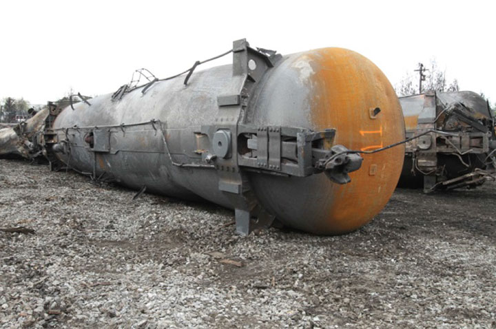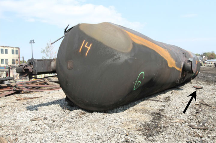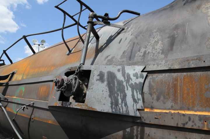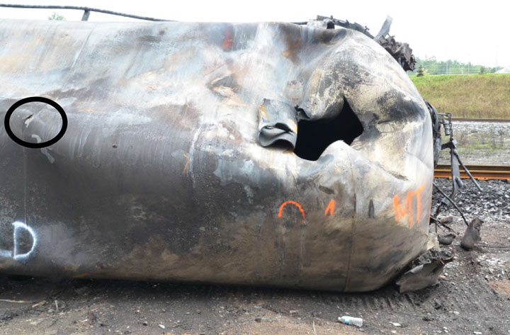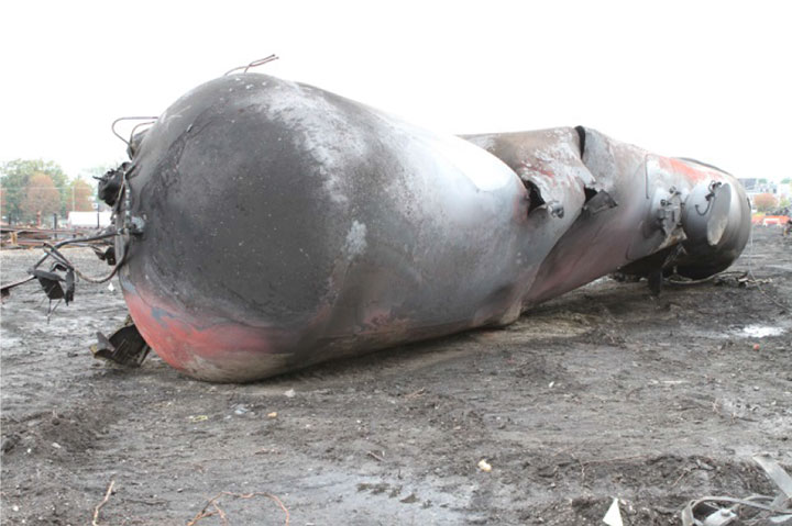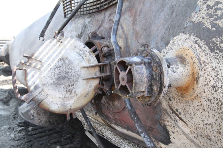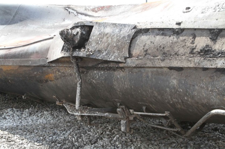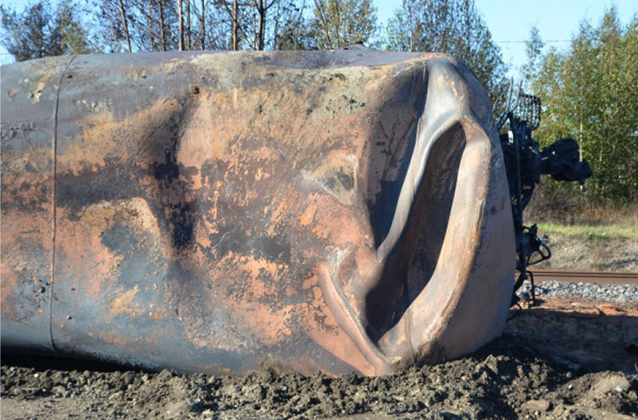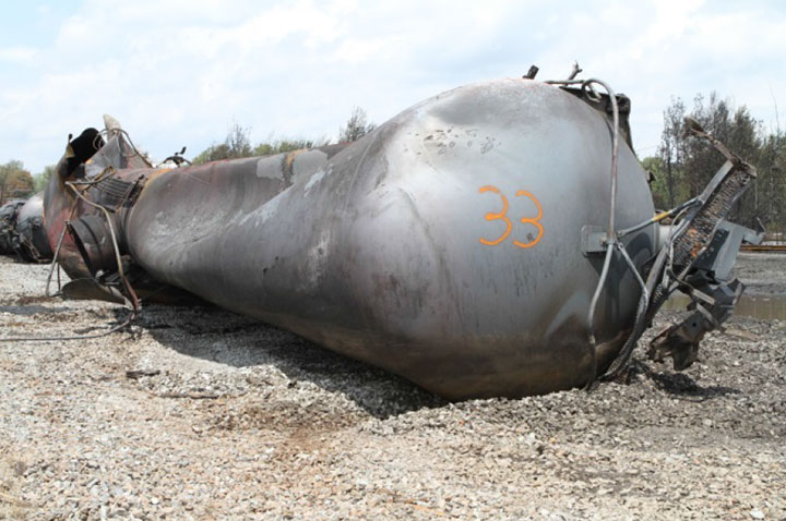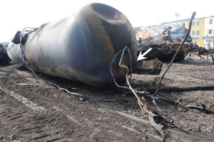In some Tank cars, a “liquid-vapour line” was noted. This liquid-vapour line corresponds to a difference in the extent of fire damage sustained by the top and bottom portions of the tank as it came to rest. The top portion would have been in the vapour space during the post-derailment fire and thus more oxidized. The bottom portion was in the liquid space and had less fire damage due to the cooling effect of the liquid.