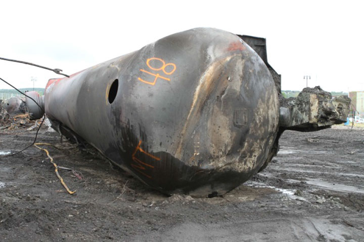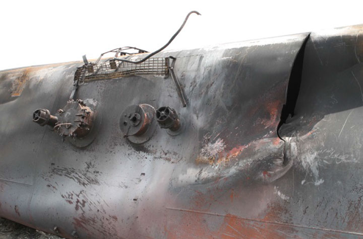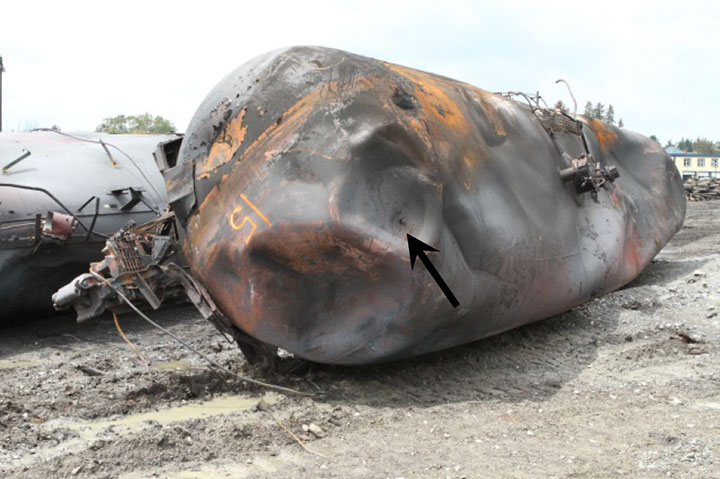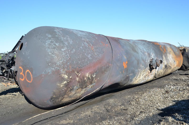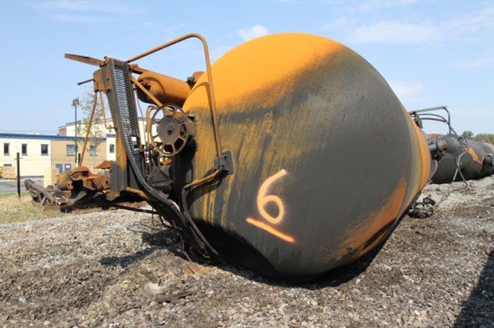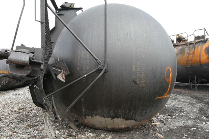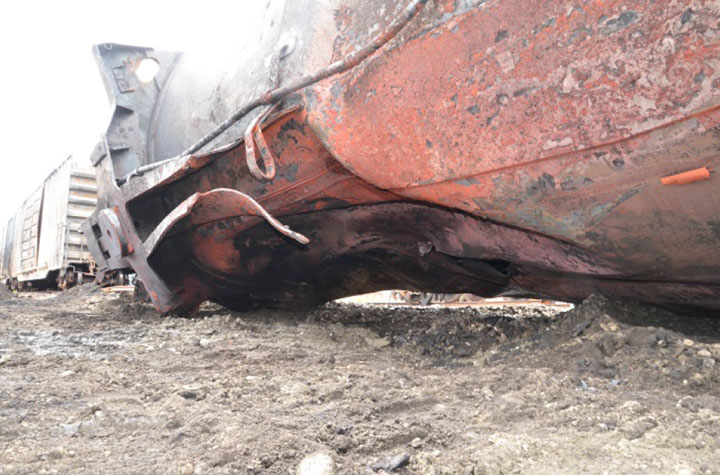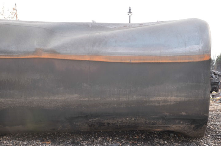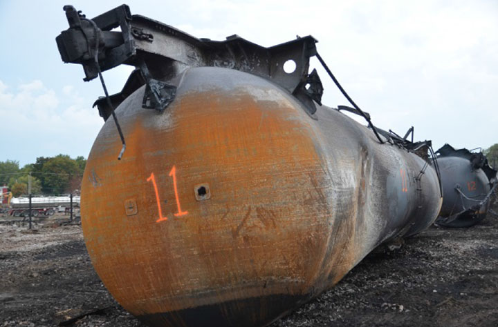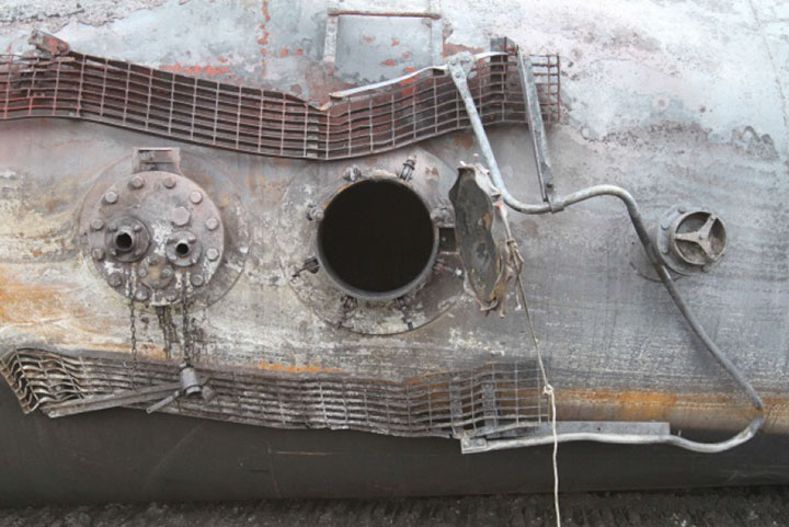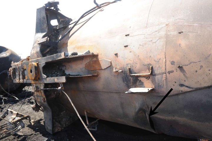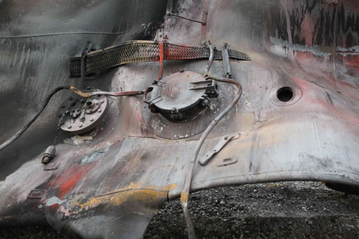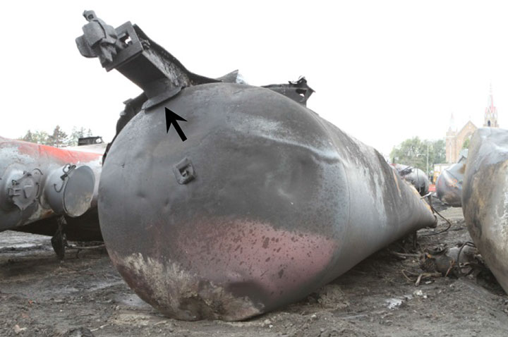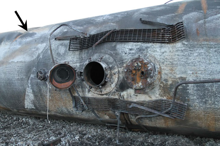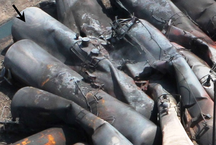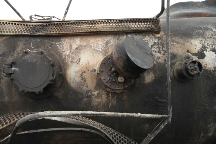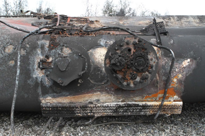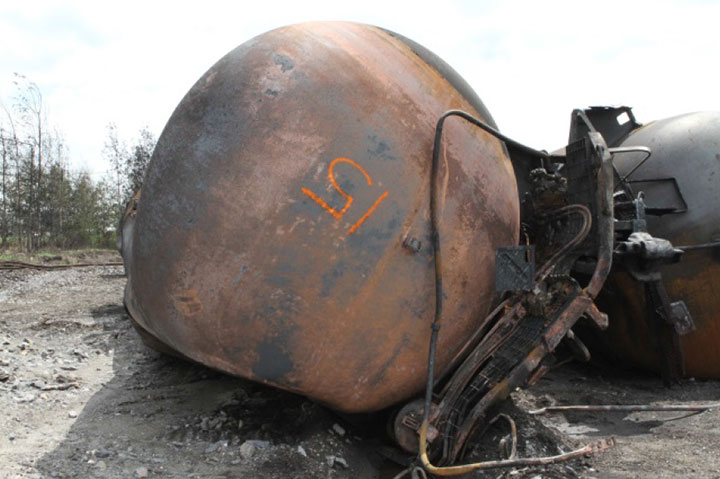 In some Tank cars, a “liquid-vapour line” was noted. This liquid-vapour line corresponds to a difference in the extent of fire damage sustained by the top and bottom portions of the tank as it came to rest. The top portion would have been in the vapour space during the post-derailment fire and thus more oxidized. The bottom portion was in the liquid space and had less fire damage due to the cooling effect of the liquid.