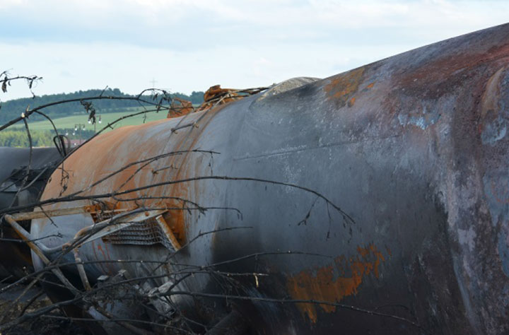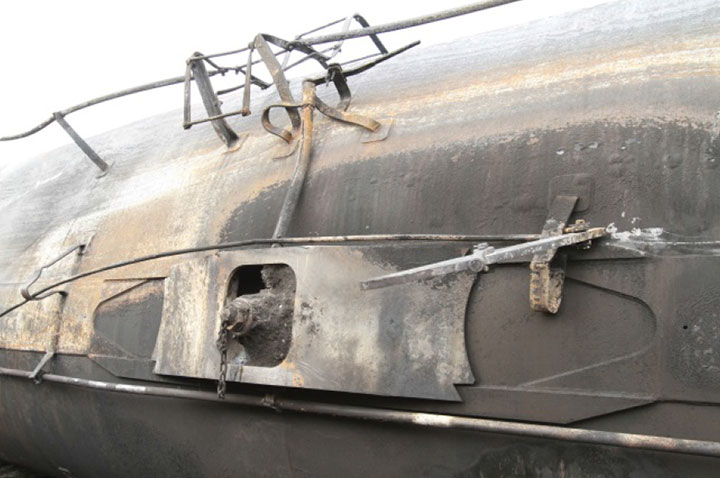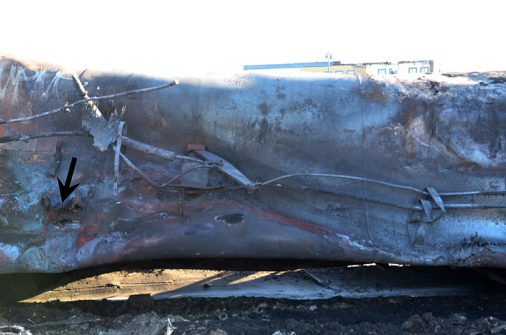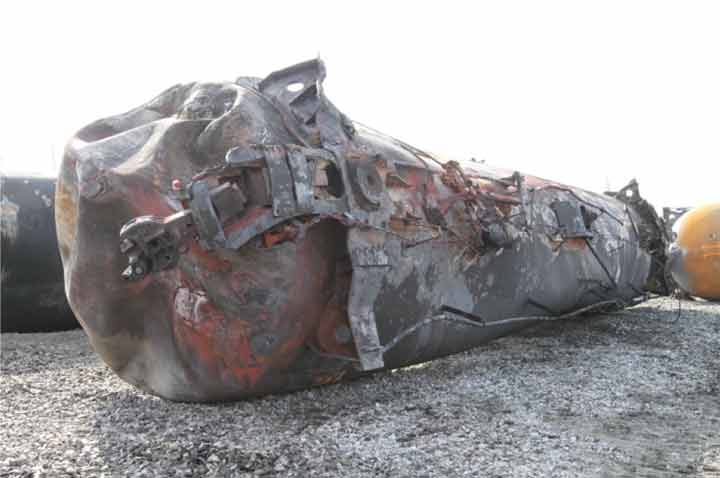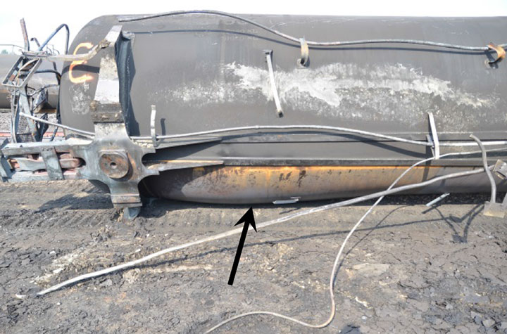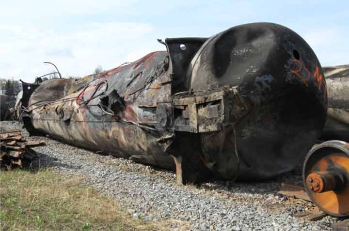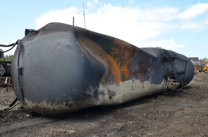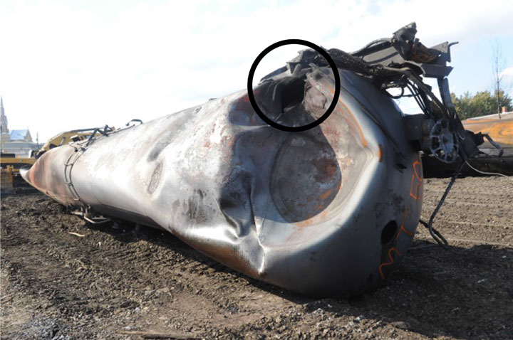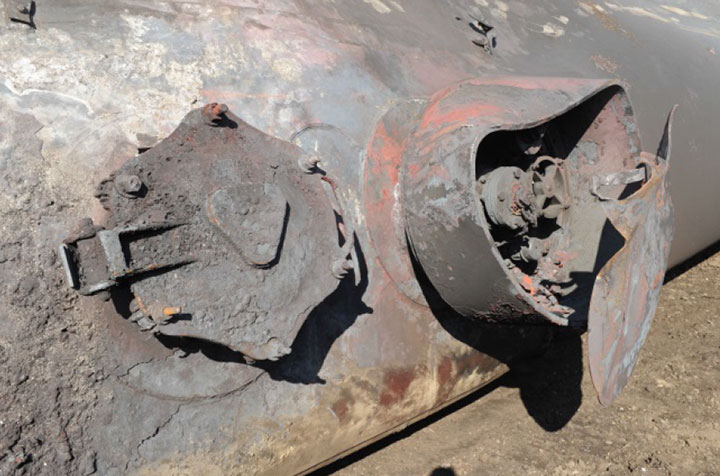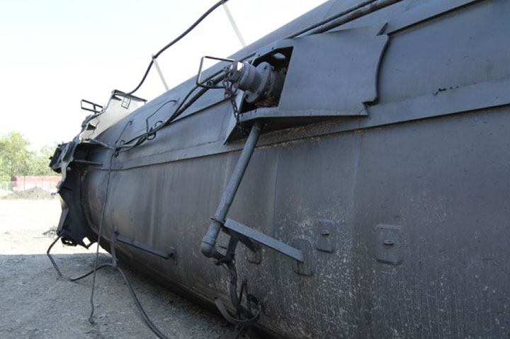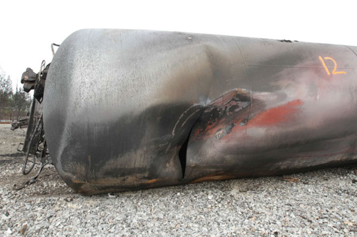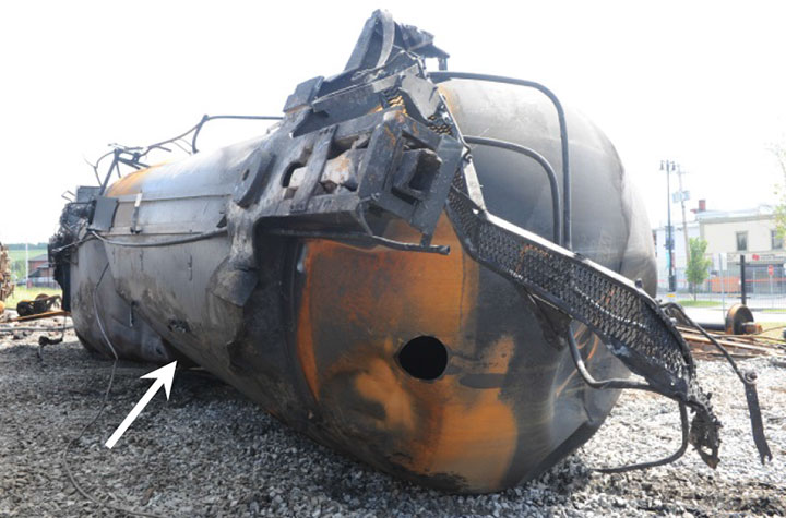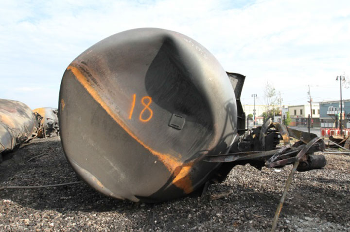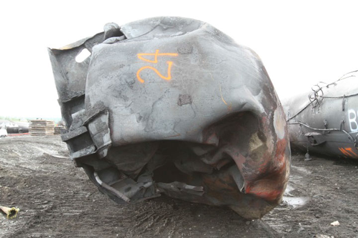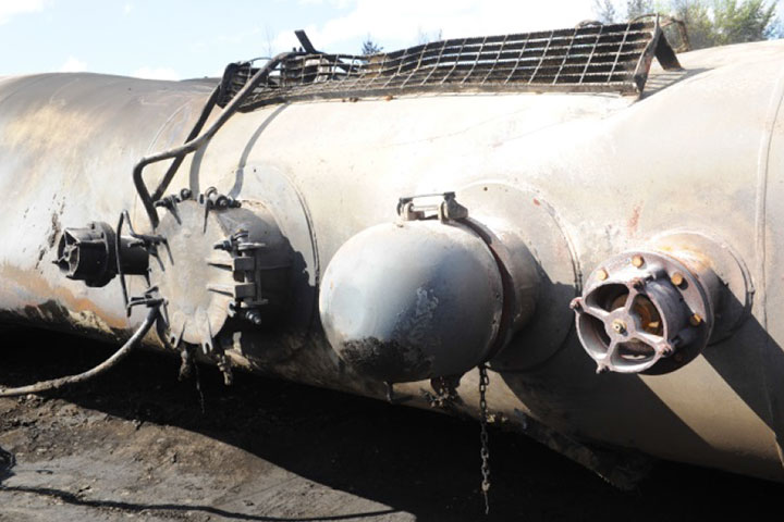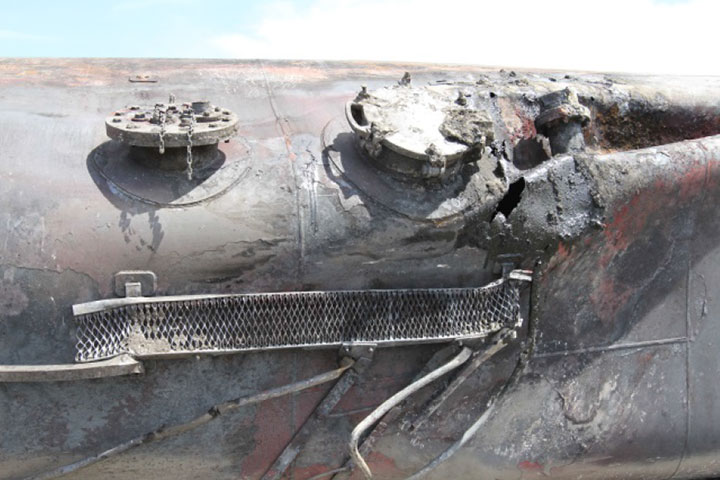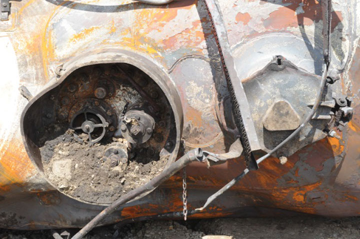 In some Tank cars, a “liquid-vapour line” was noted. This liquid-vapour line corresponds to a difference in the extent of fire damage sustained by the top and bottom portions of the tank as it came to rest. The top portion would have been in the vapour space during the post-derailment fire and thus more oxidized. The bottom portion was in the liquid space and had less fire damage due to the cooling effect of the liquid.