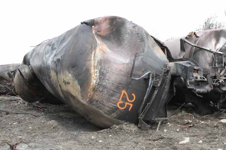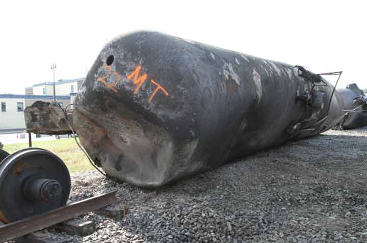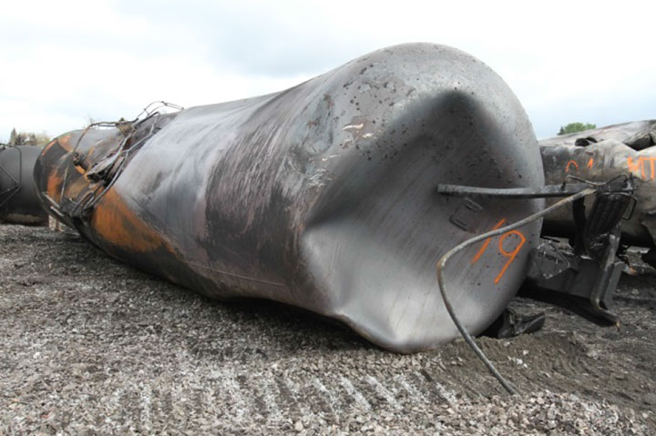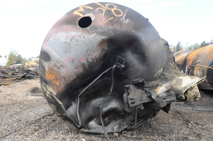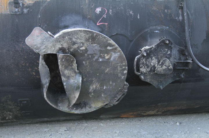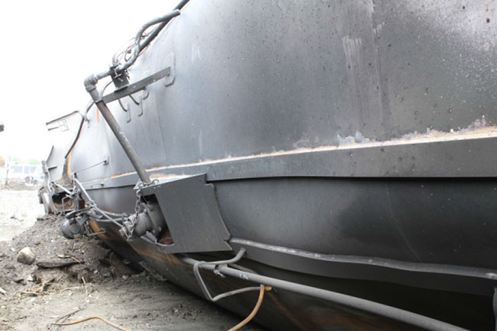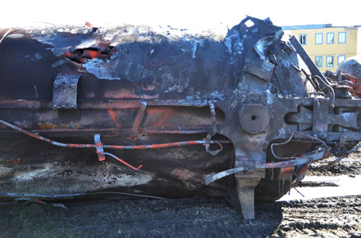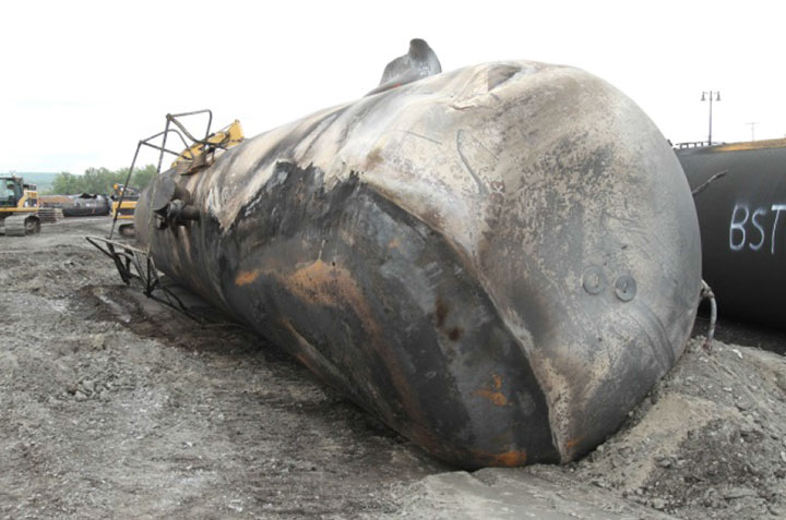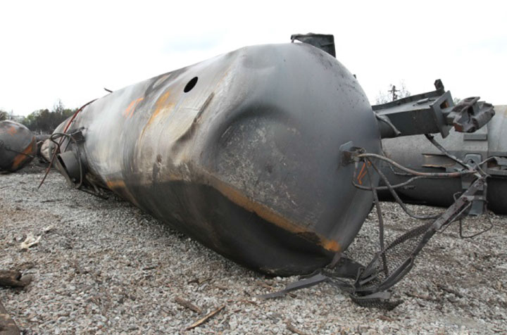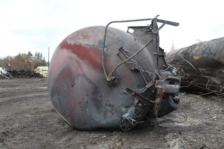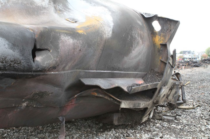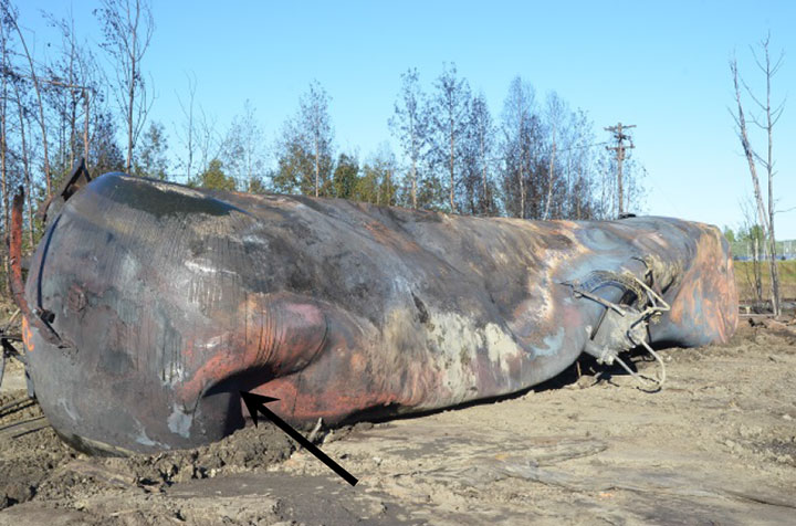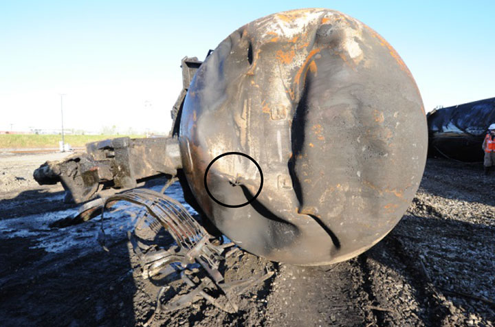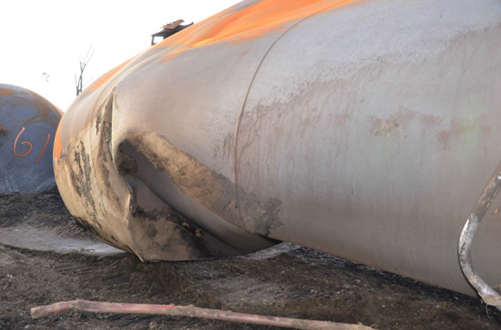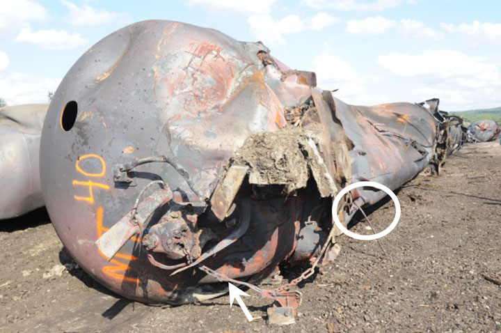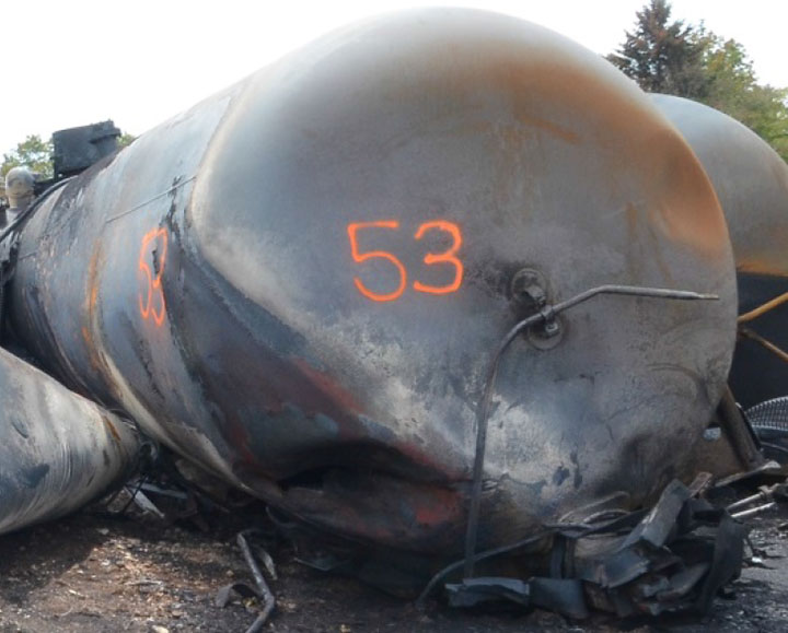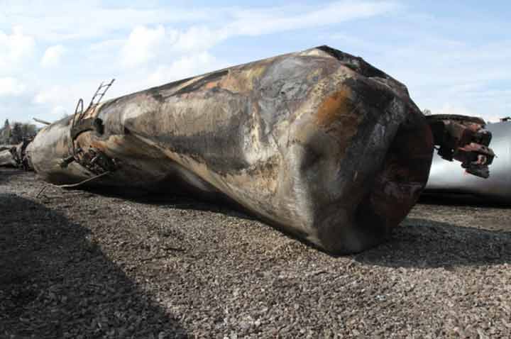 In some Tank cars, a “liquid-vapour line” was noted. This liquid-vapour line corresponds to a difference in the extent of fire damage sustained by the top and bottom portions of the tank as it came to rest. The top portion would have been in the vapour space during the post-derailment fire and thus more oxidized. The bottom portion was in the liquid space and had less fire damage due to the cooling effect of the liquid.