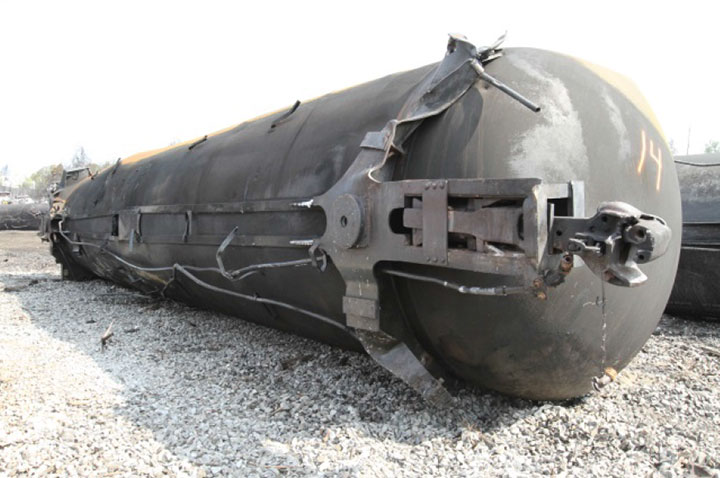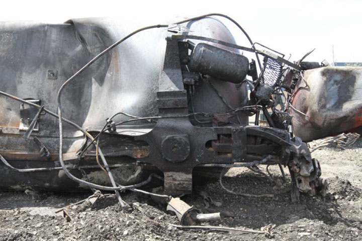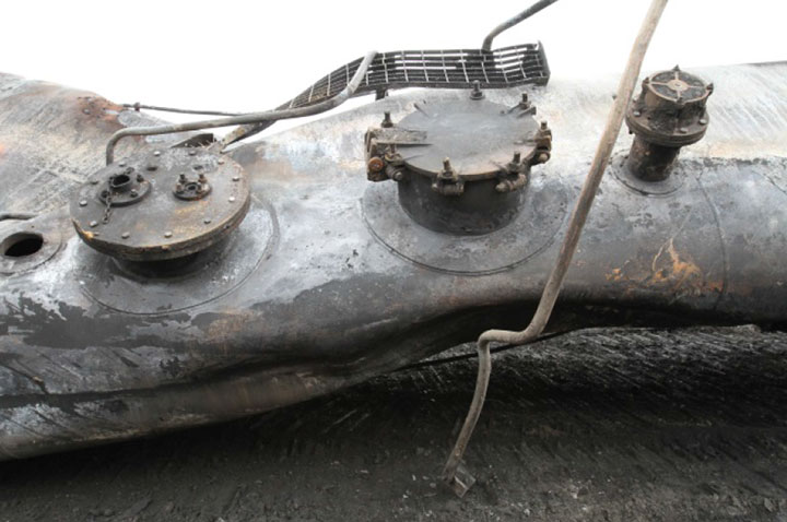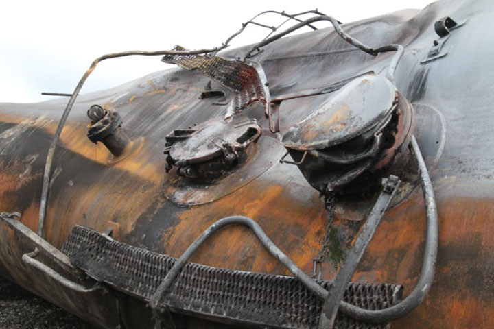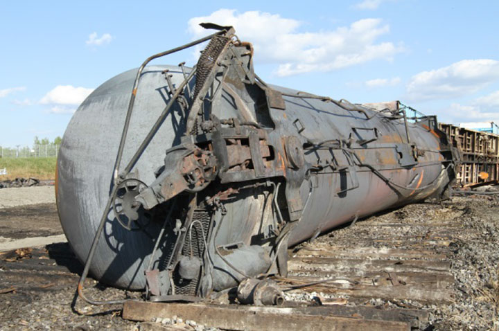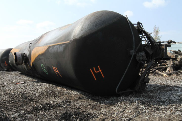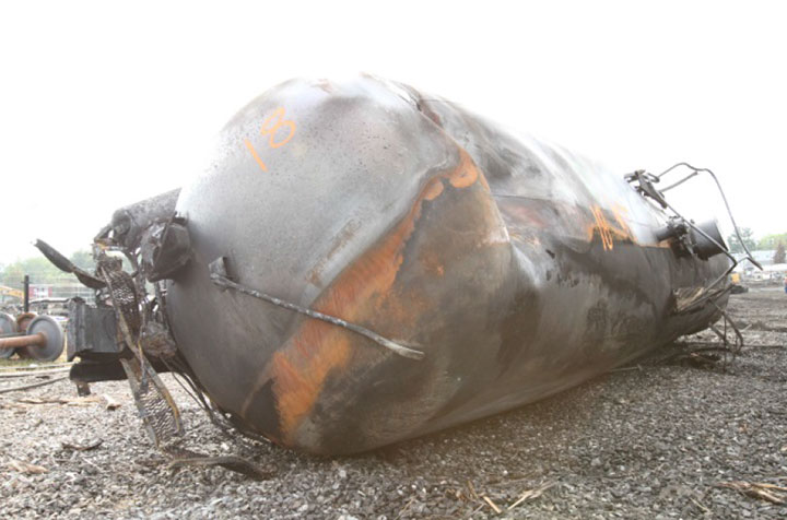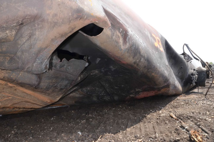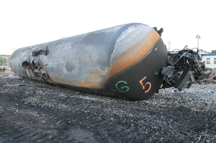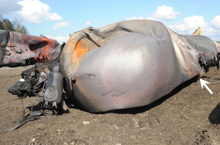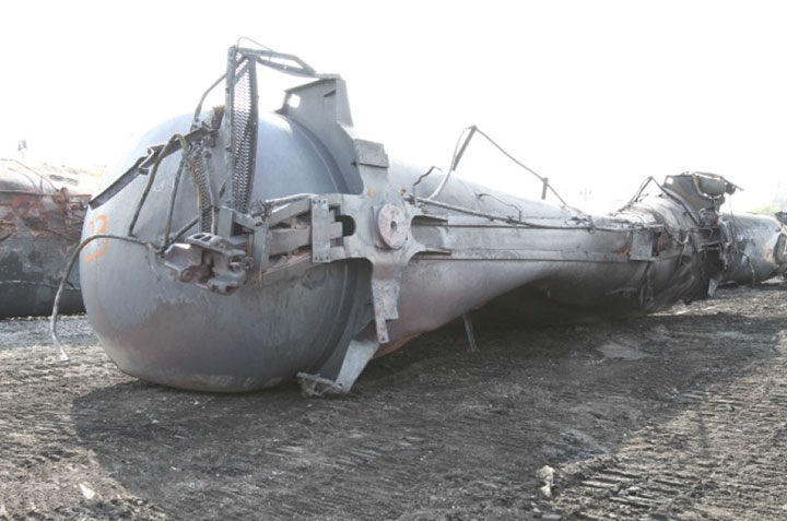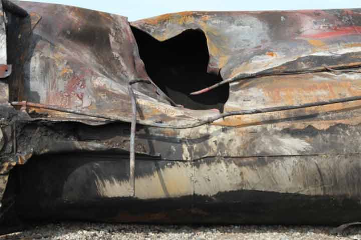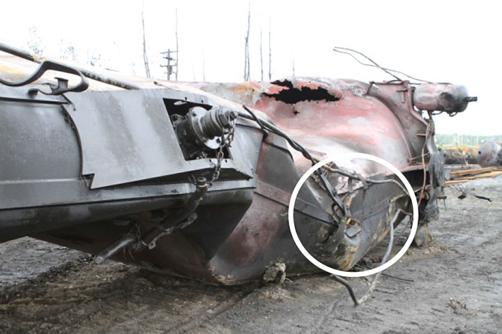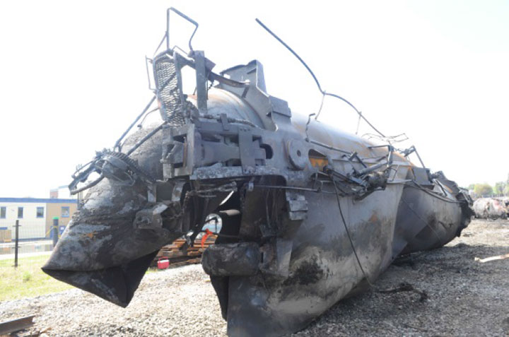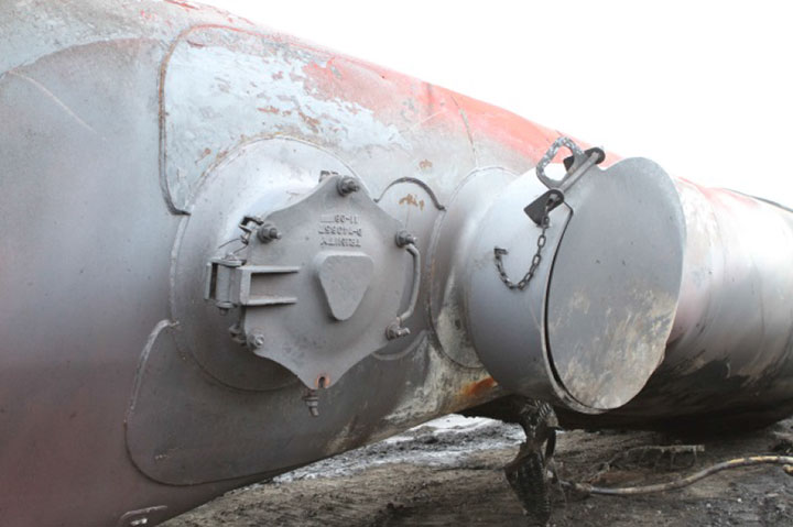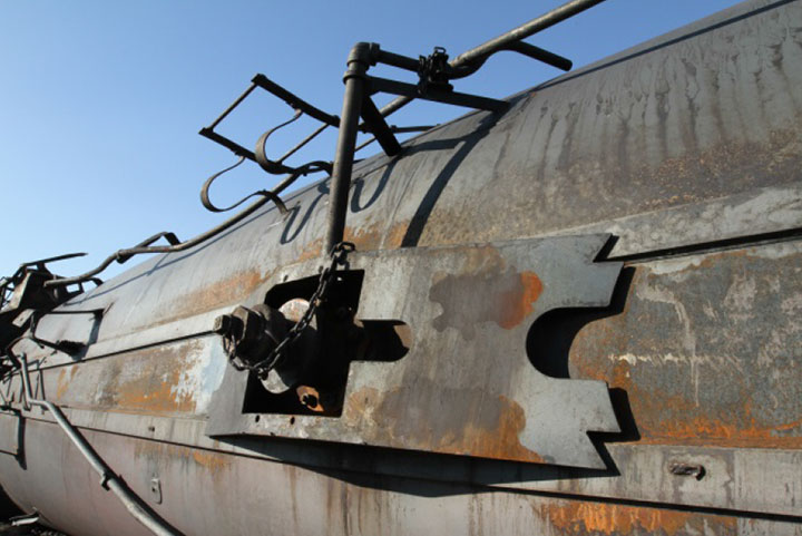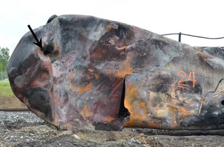 In some Tank cars, a “liquid-vapour line” was noted. This liquid-vapour line corresponds to a difference in the extent of fire damage sustained by the top and bottom portions of the tank as it came to rest. The top portion would have been in the vapour space during the post-derailment fire and thus more oxidized. The bottom portion was in the liquid space and had less fire damage due to the cooling effect of the liquid.