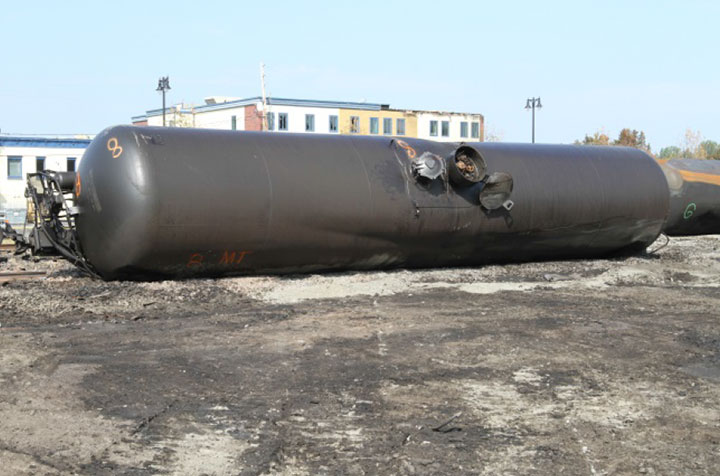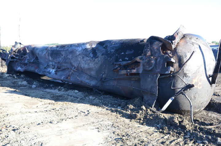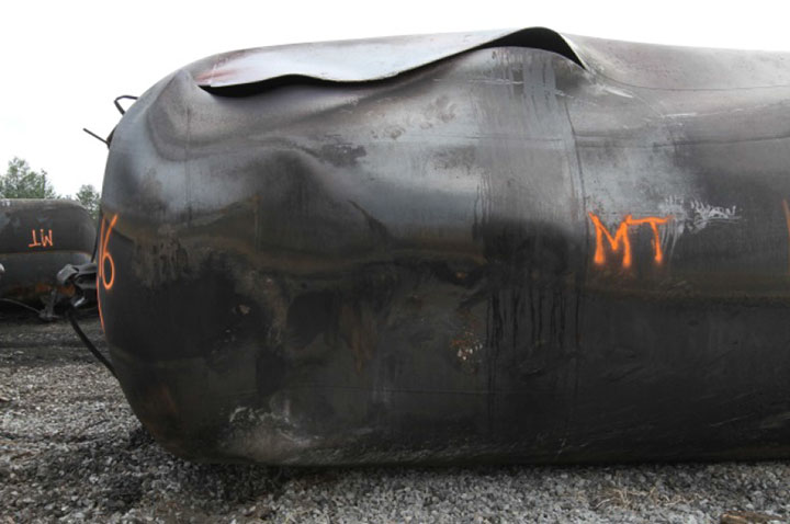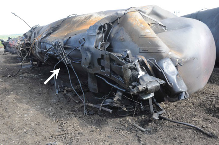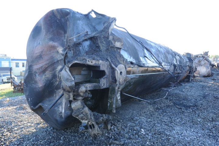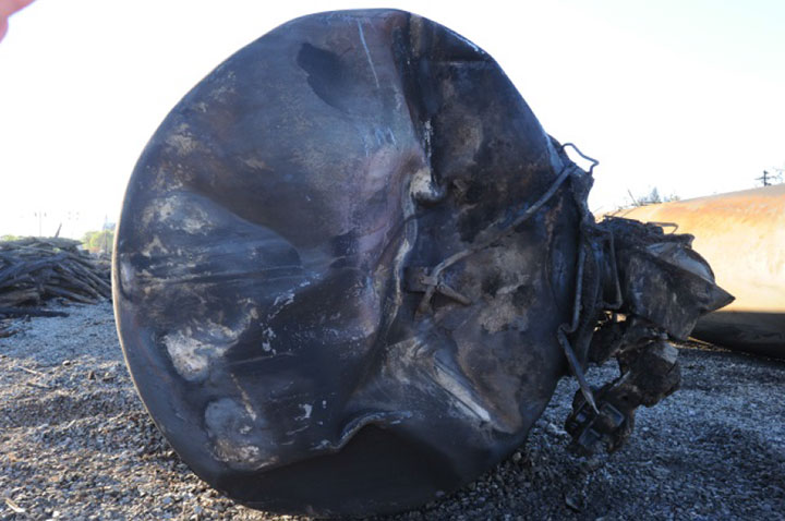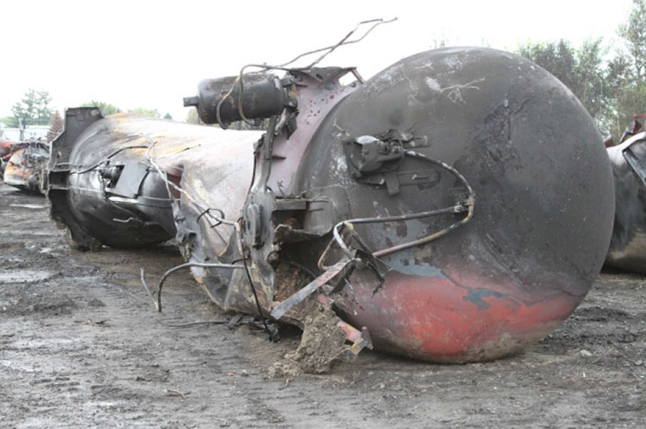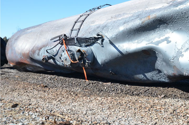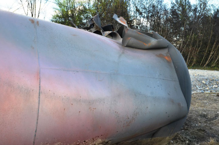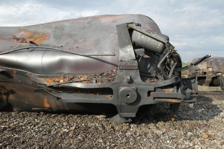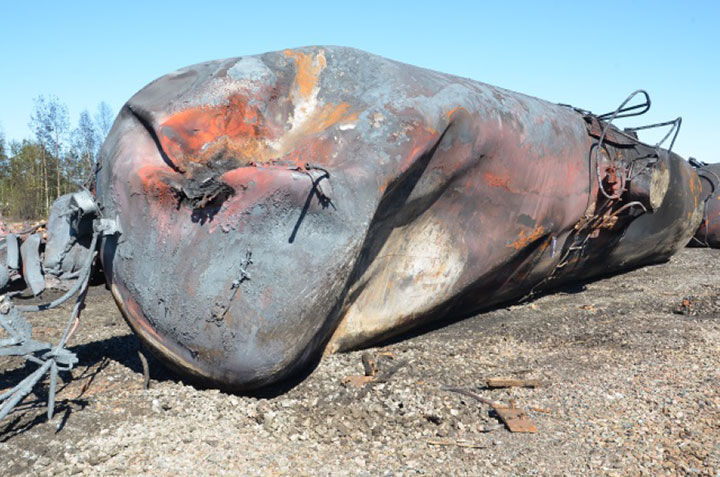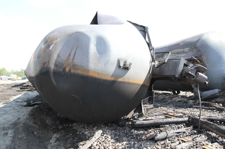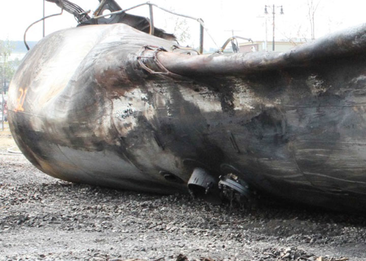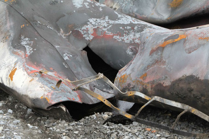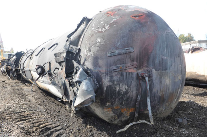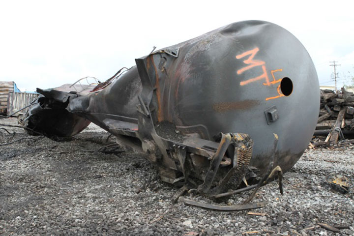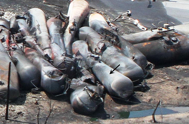 In some Tank cars, a “liquid-vapour line” was noted. This liquid-vapour line corresponds to a difference in the extent of fire damage sustained by the top and bottom portions of the tank as it came to rest. The top portion would have been in the vapour space during the post-derailment fire and thus more oxidized. The bottom portion was in the liquid space and had less fire damage due to the cooling effect of the liquid.