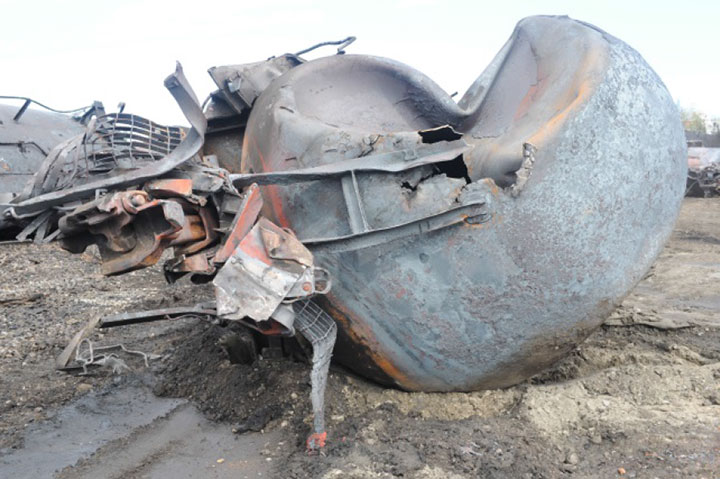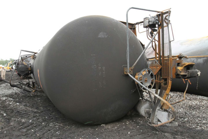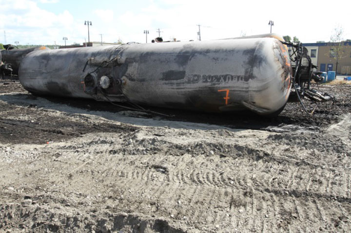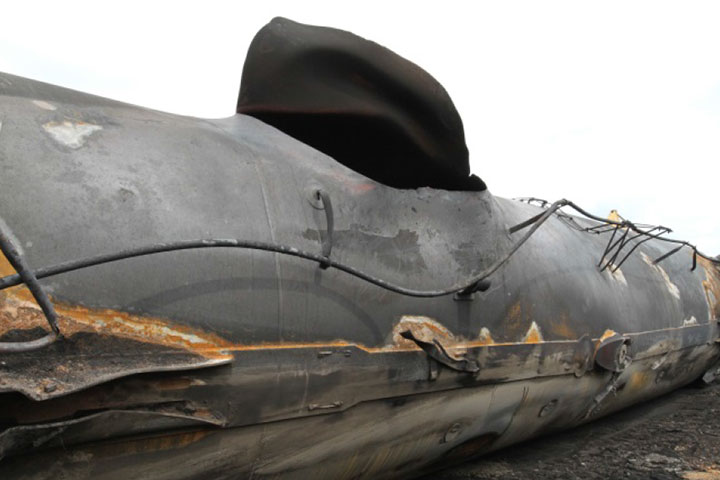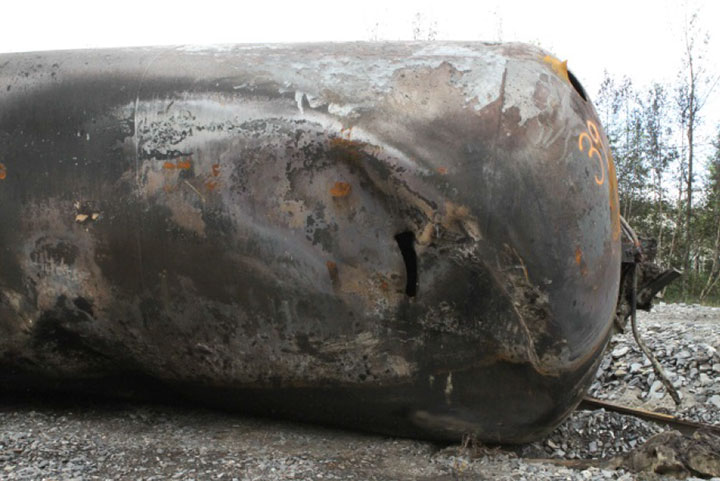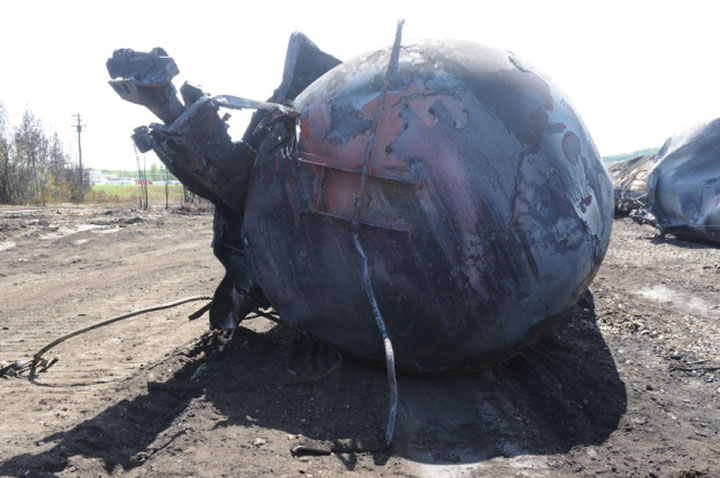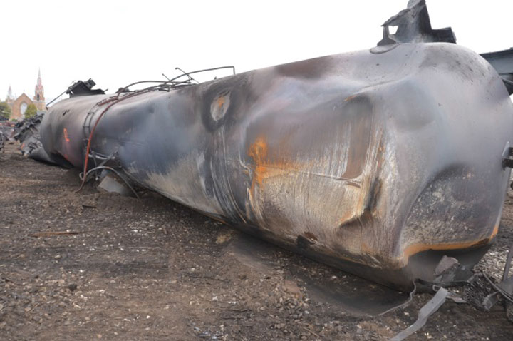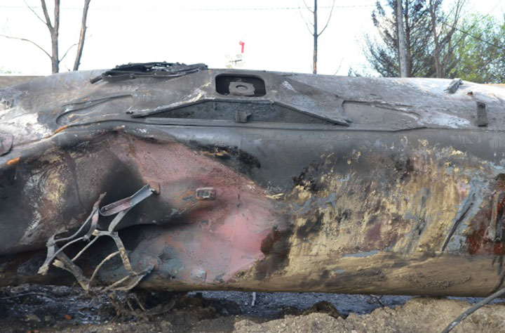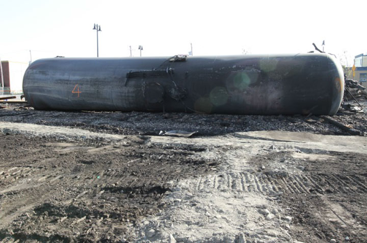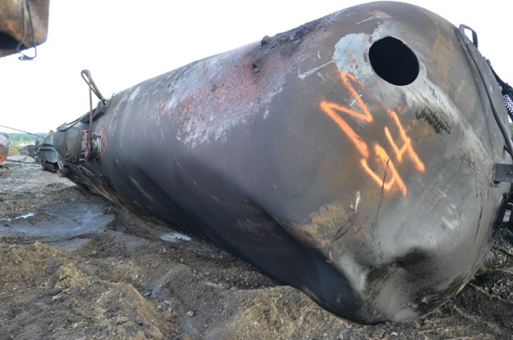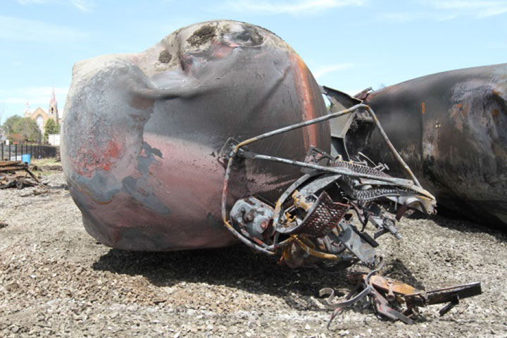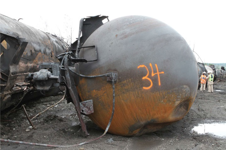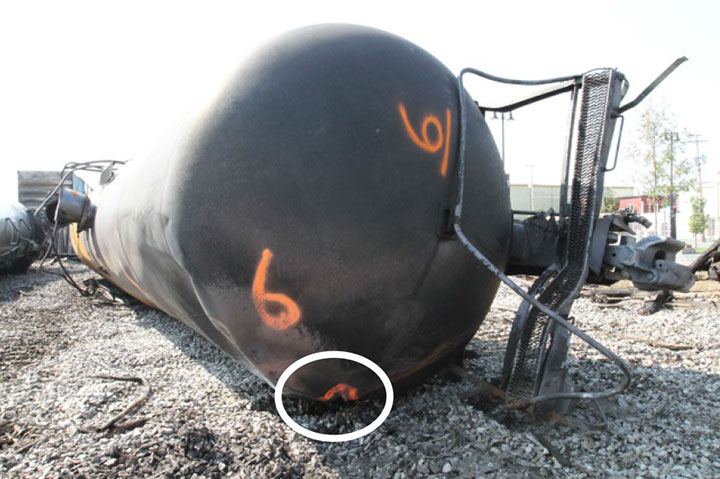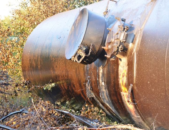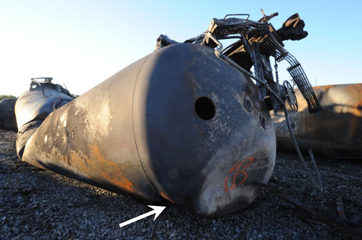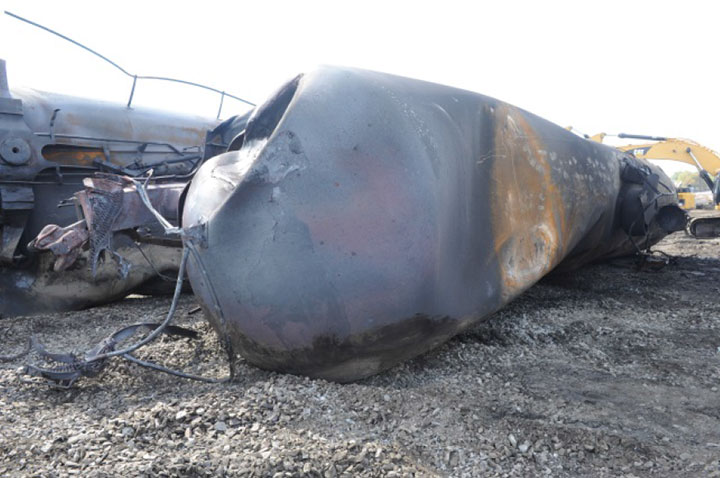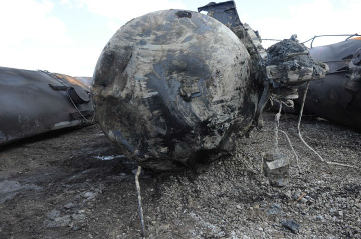 In some Tank cars, a “liquid-vapour line” was noted. This liquid-vapour line corresponds to a difference in the extent of fire damage sustained by the top and bottom portions of the tank as it came to rest. The top portion would have been in the vapour space during the post-derailment fire and thus more oxidized. The bottom portion was in the liquid space and had less fire damage due to the cooling effect of the liquid.