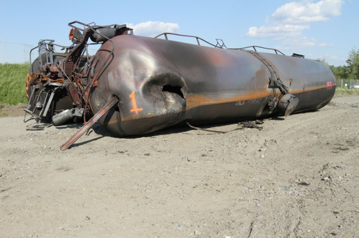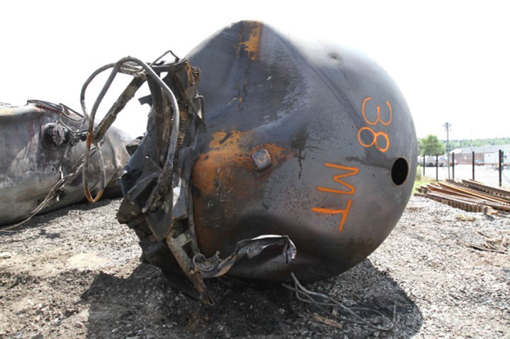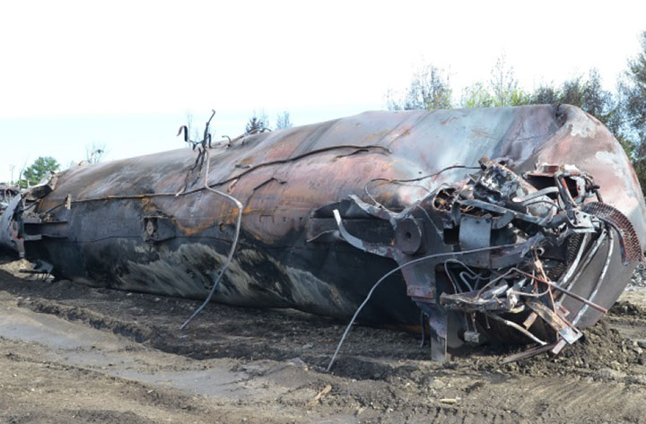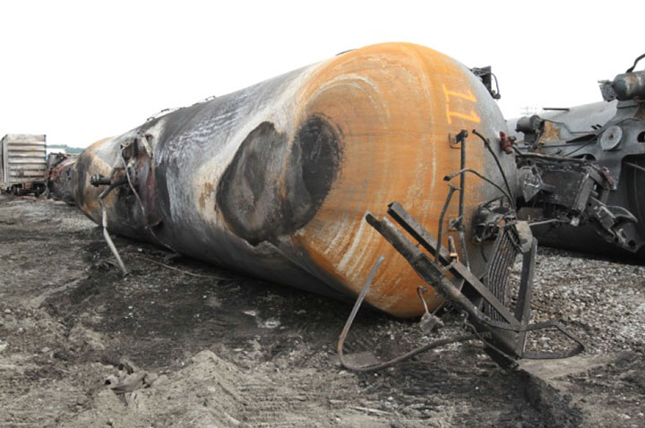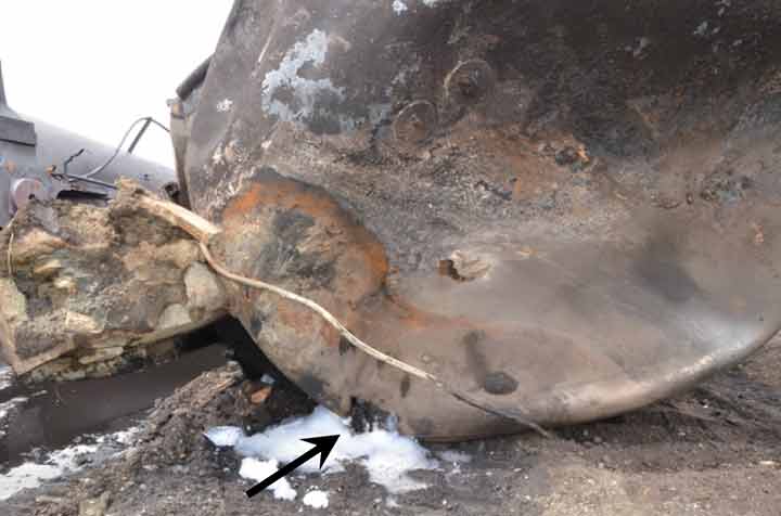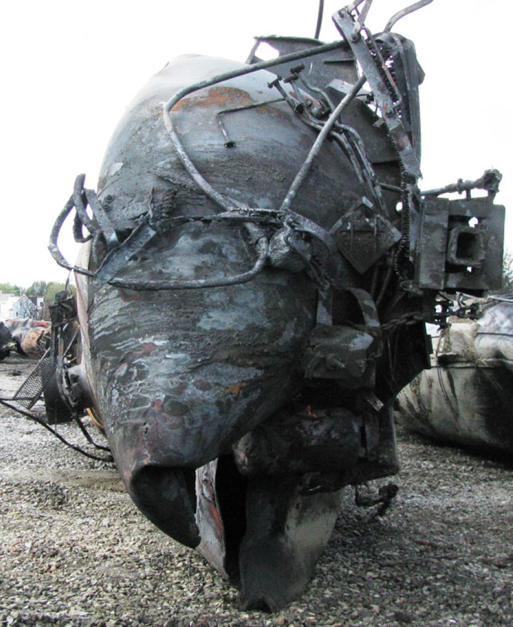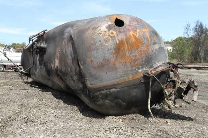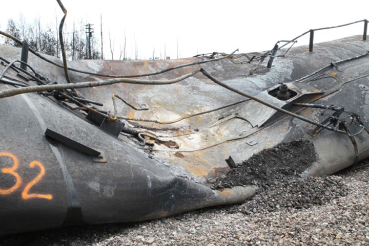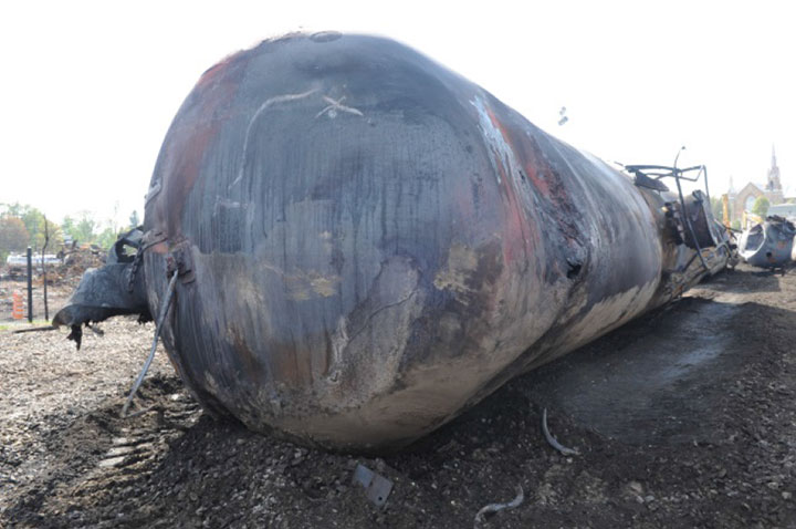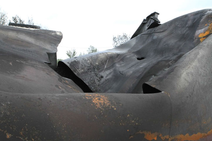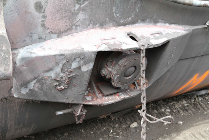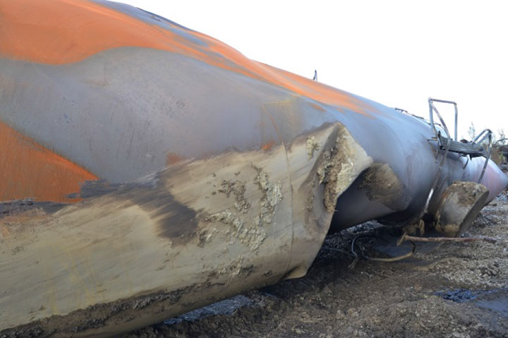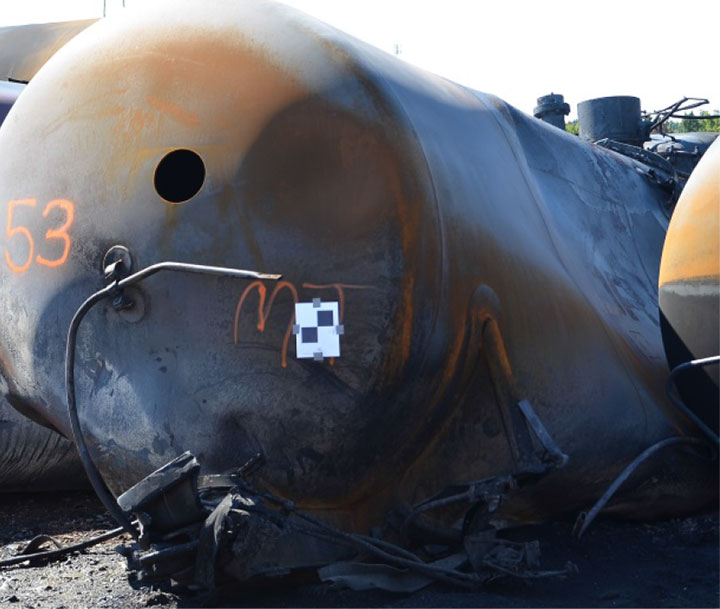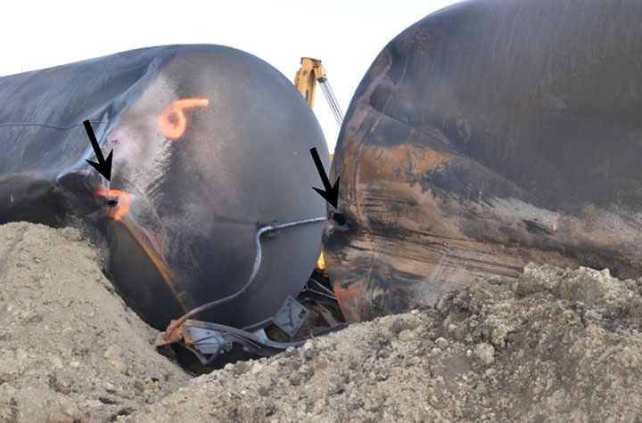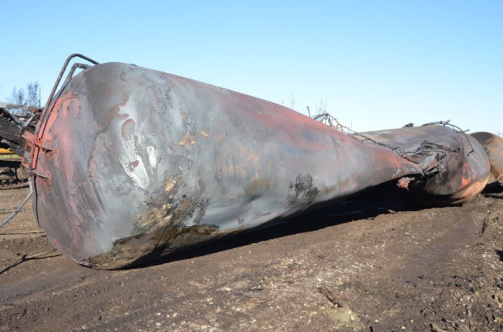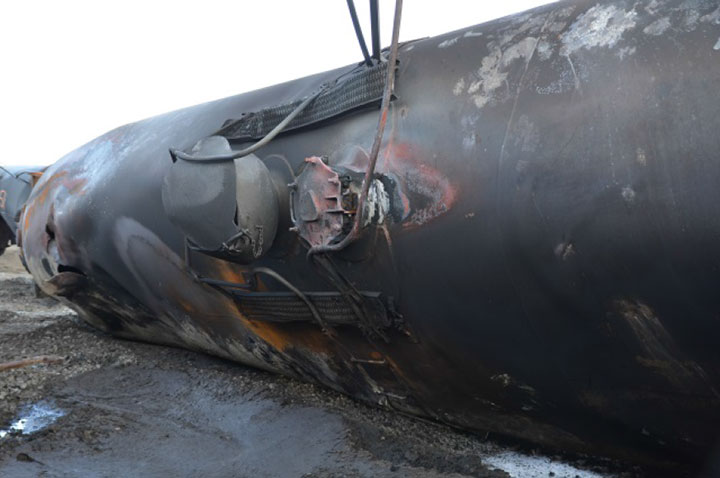 In some Tank cars, a “liquid-vapour line” was noted. This liquid-vapour line corresponds to a difference in the extent of fire damage sustained by the top and bottom portions of the tank as it came to rest. The top portion would have been in the vapour space during the post-derailment fire and thus more oxidized. The bottom portion was in the liquid space and had less fire damage due to the cooling effect of the liquid.