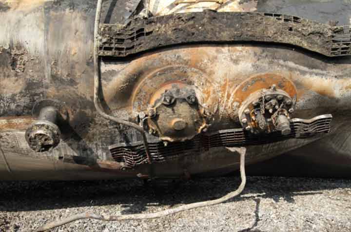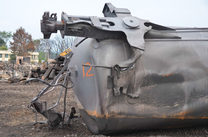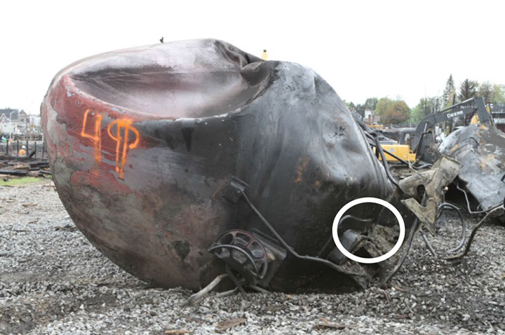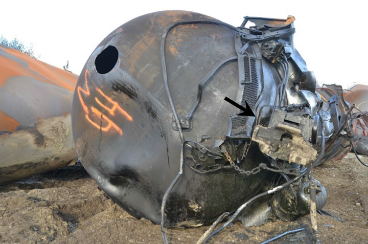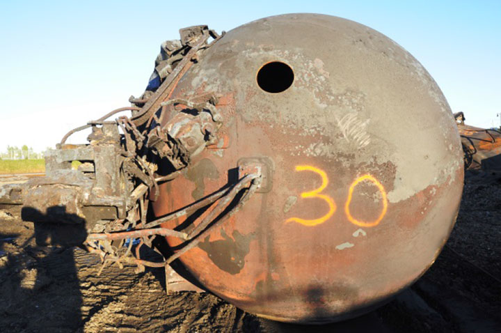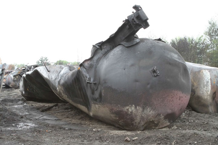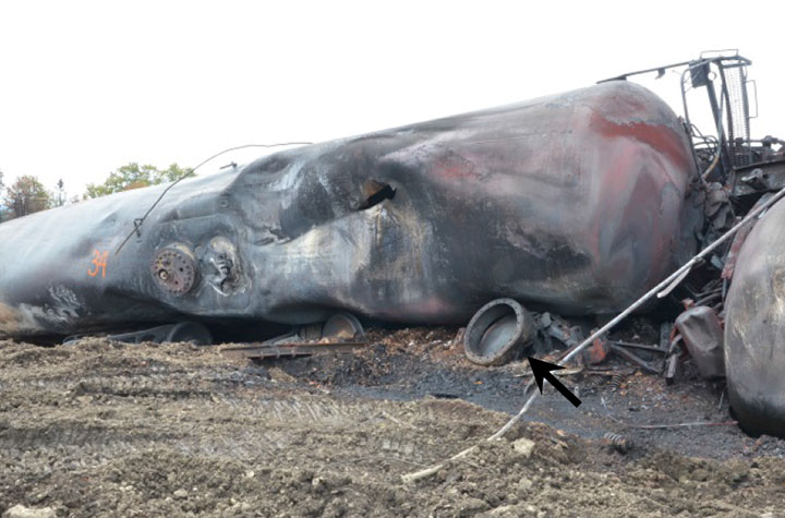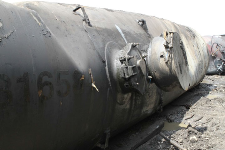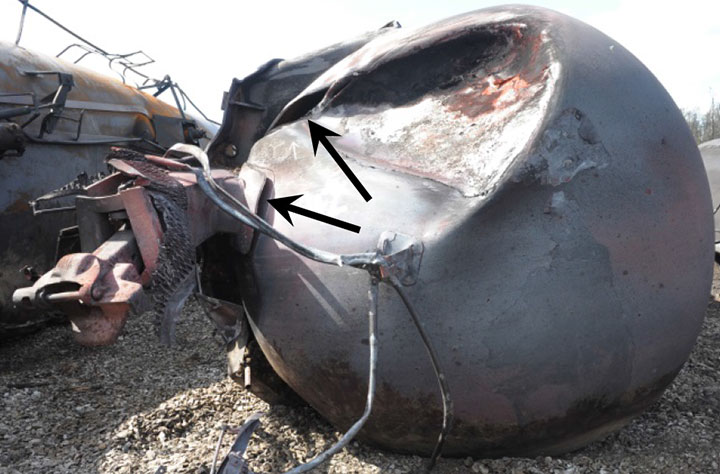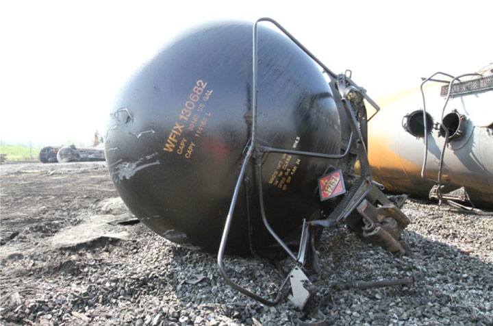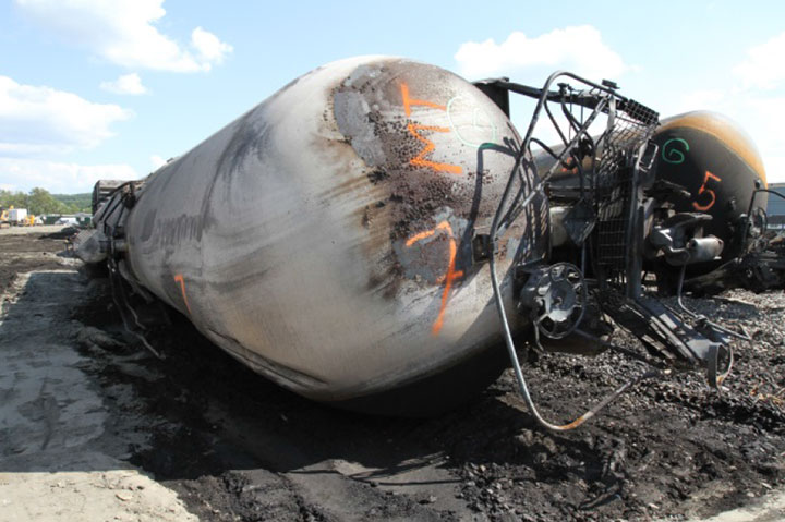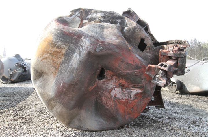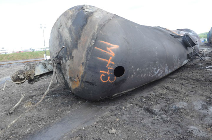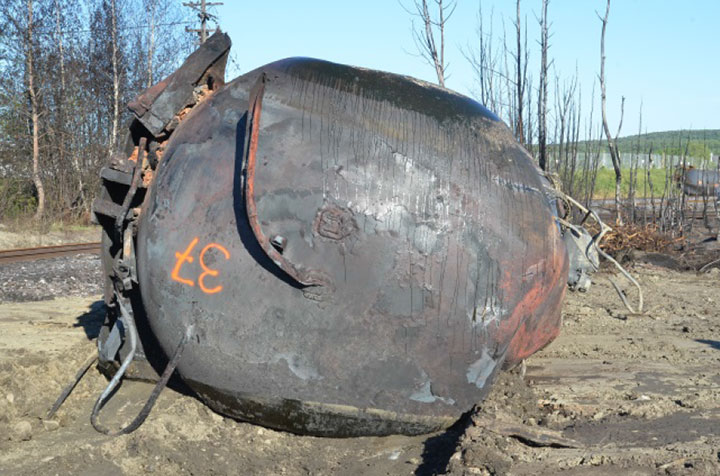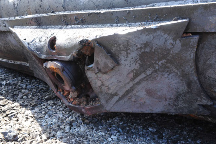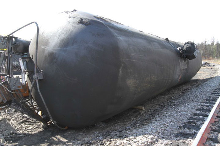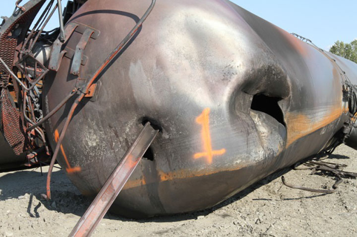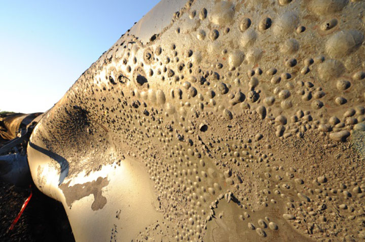In some Tank cars, a “liquid-vapour line” was noted. This liquid-vapour line corresponds to a difference in the extent of fire damage sustained by the top and bottom portions of the tank as it came to rest. The top portion would have been in the vapour space during the post-derailment fire and thus more oxidized. The bottom portion was in the liquid space and had less fire damage due to the cooling effect of the liquid.