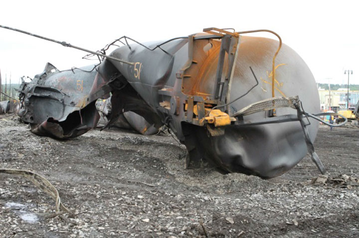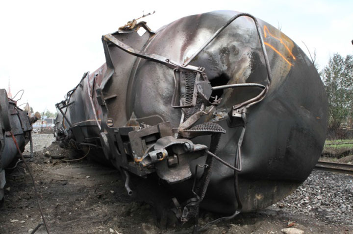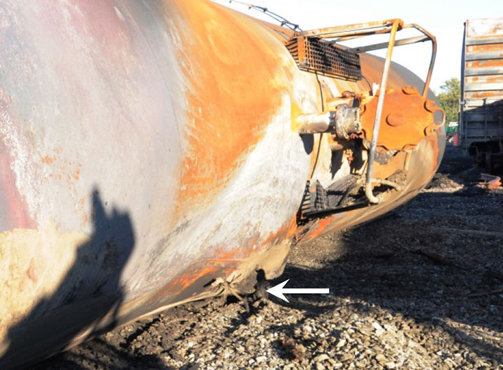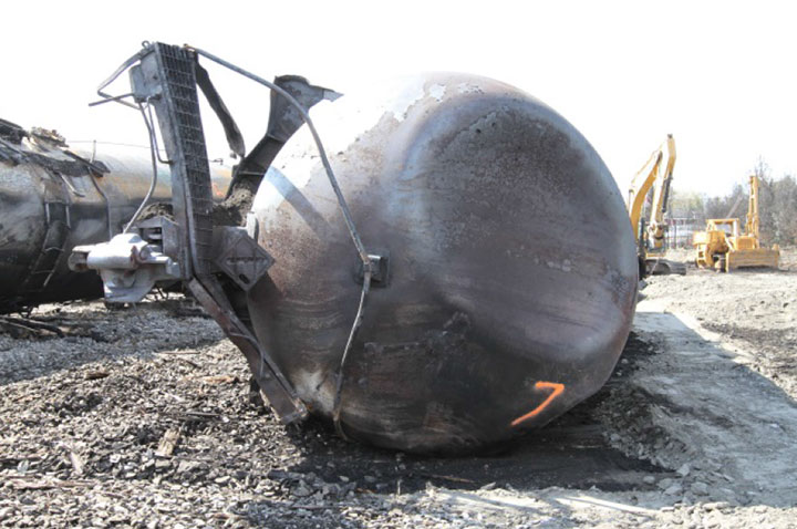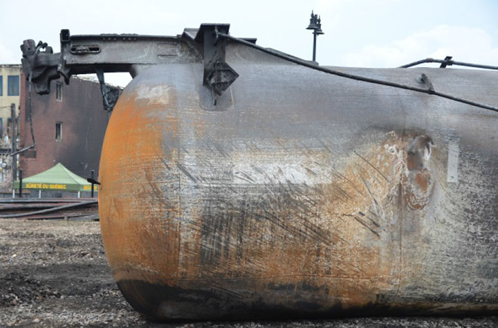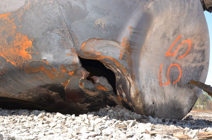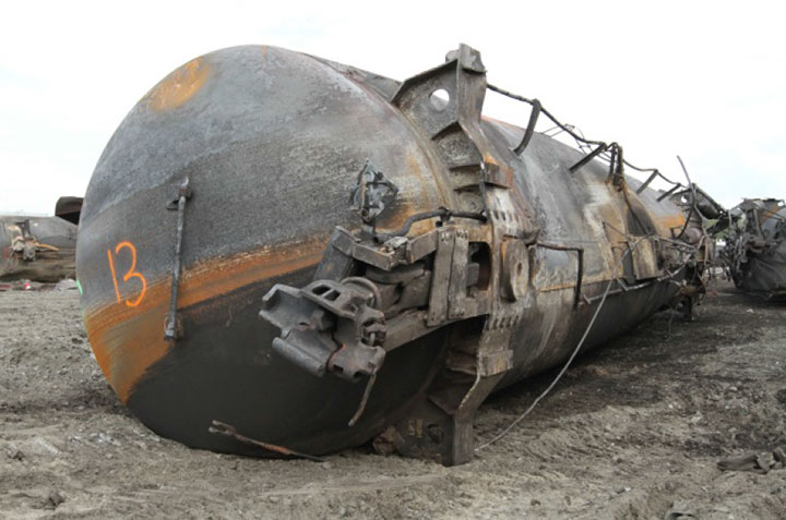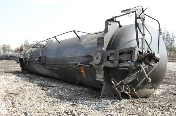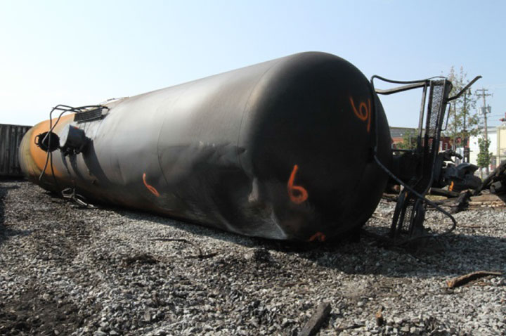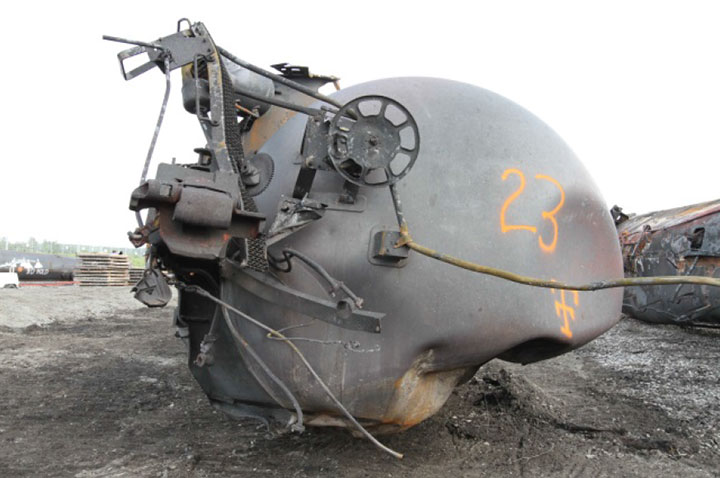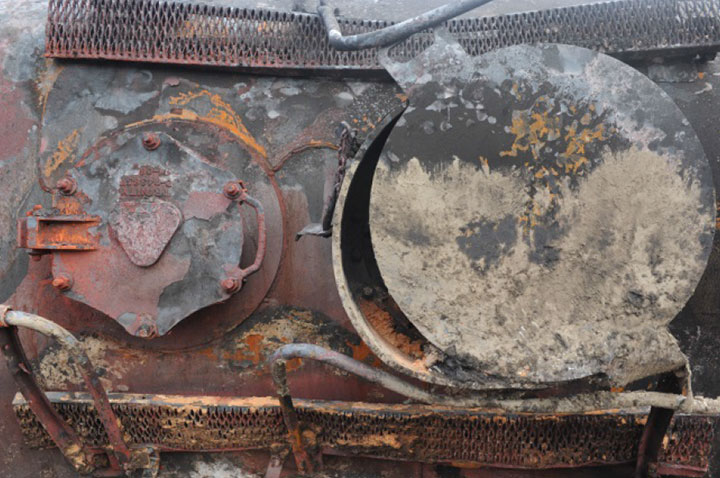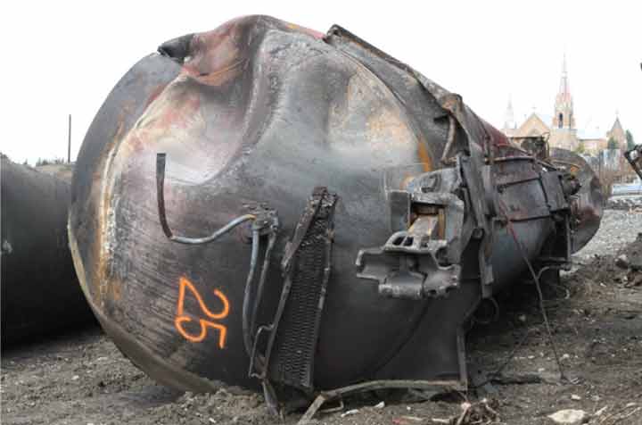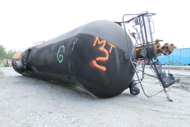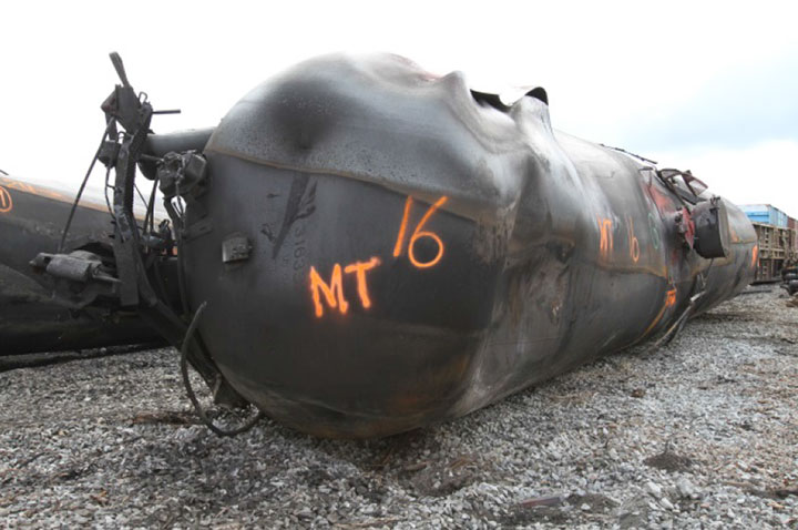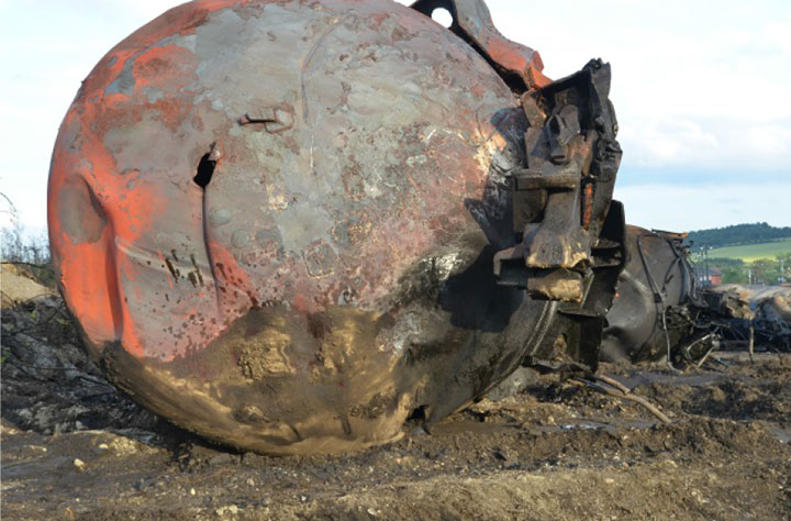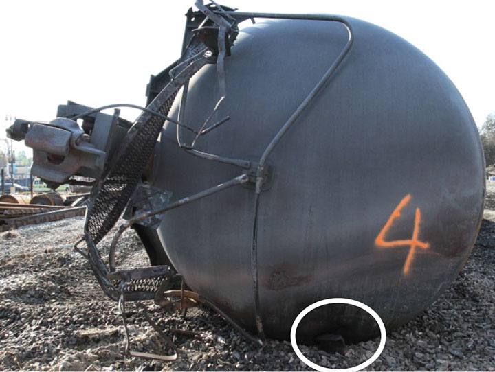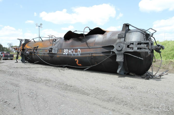 In some Tank cars, a “liquid-vapour line” was noted. This liquid-vapour line corresponds to a difference in the extent of fire damage sustained by the top and bottom portions of the tank as it came to rest. The top portion would have been in the vapour space during the post-derailment fire and thus more oxidized. The bottom portion was in the liquid space and had less fire damage due to the cooling effect of the liquid.