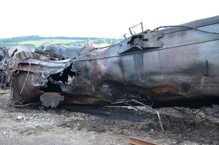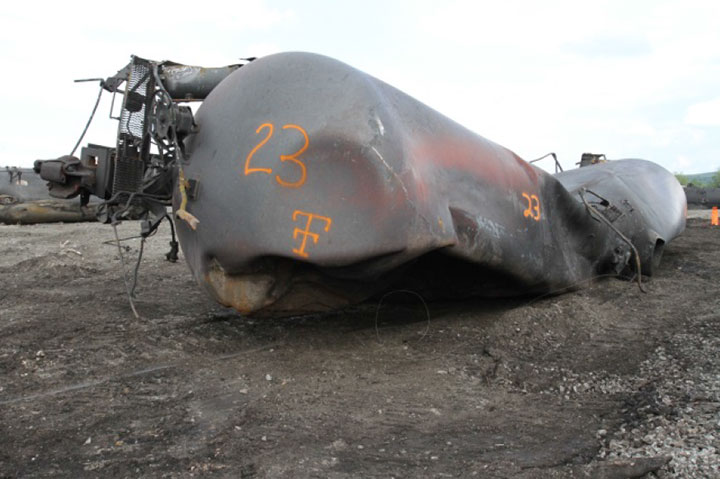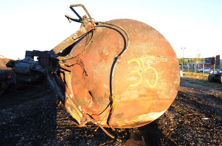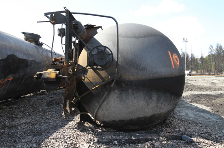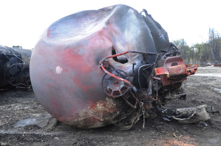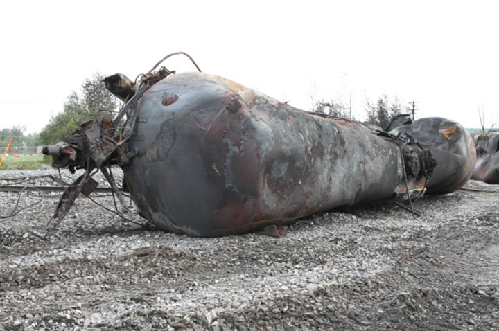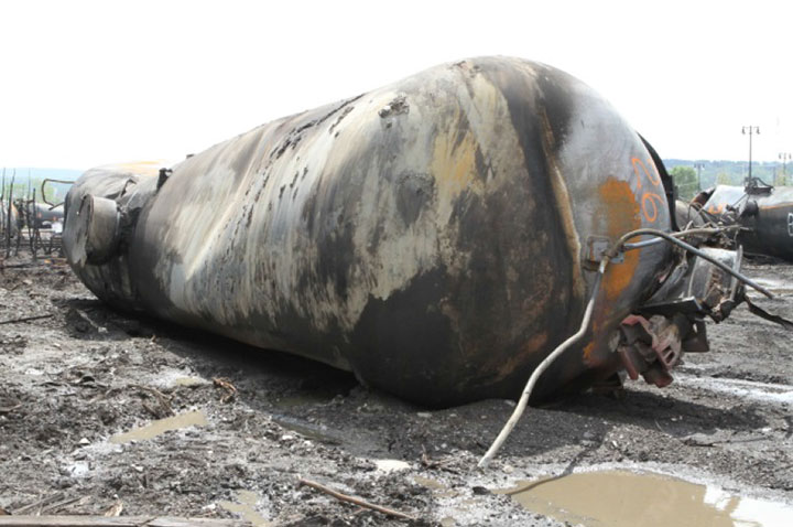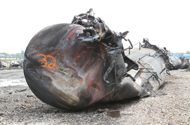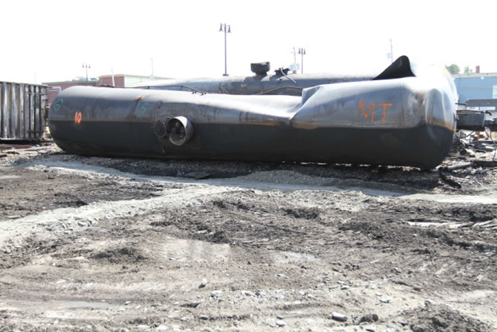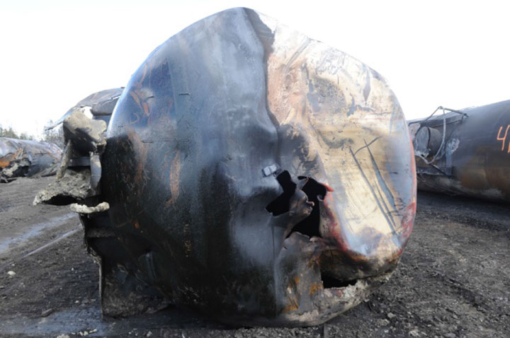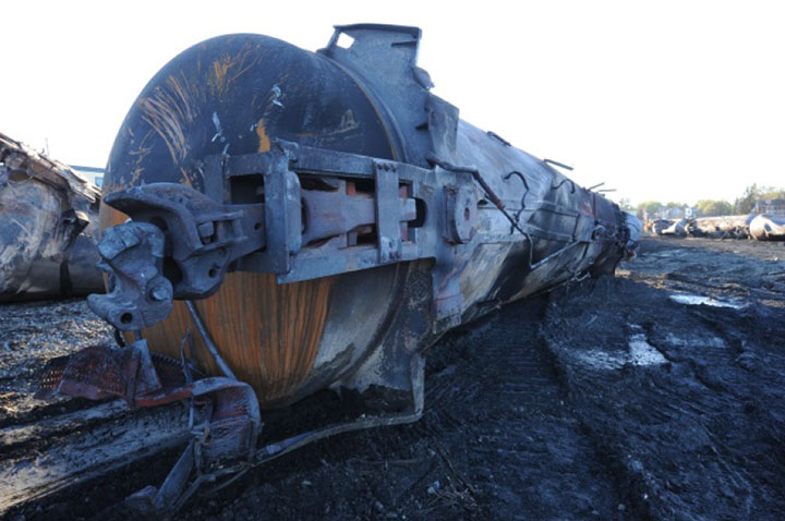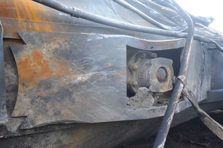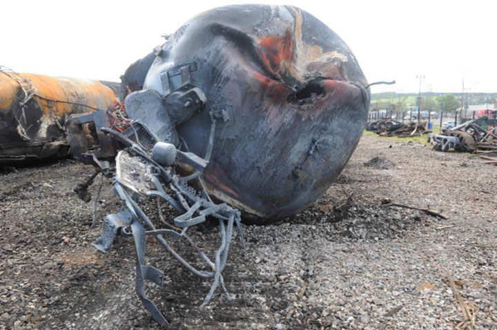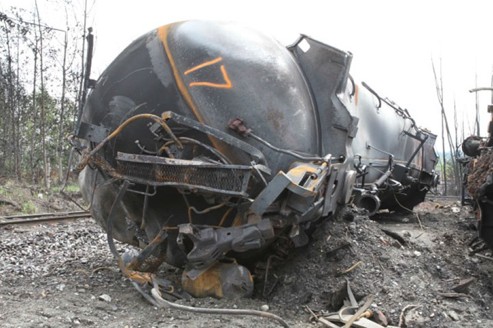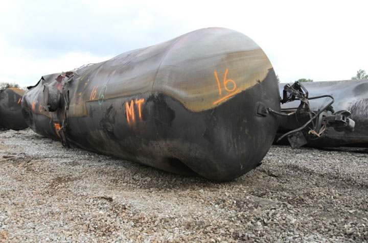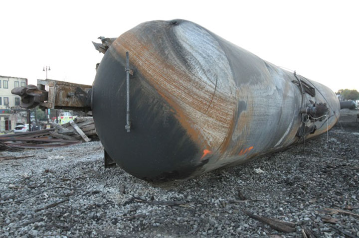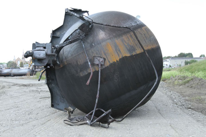 In some Tank cars, a “liquid-vapour line” was noted. This liquid-vapour line corresponds to a difference in the extent of fire damage sustained by the top and bottom portions of the tank as it came to rest. The top portion would have been in the vapour space during the post-derailment fire and thus more oxidized. The bottom portion was in the liquid space and had less fire damage due to the cooling effect of the liquid.
