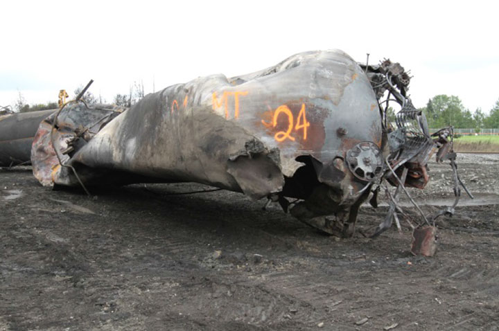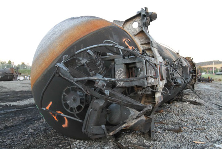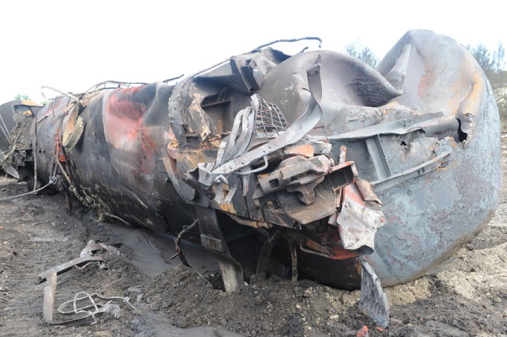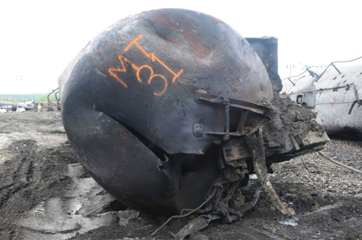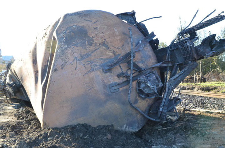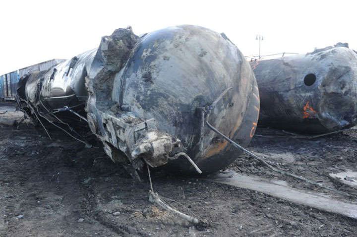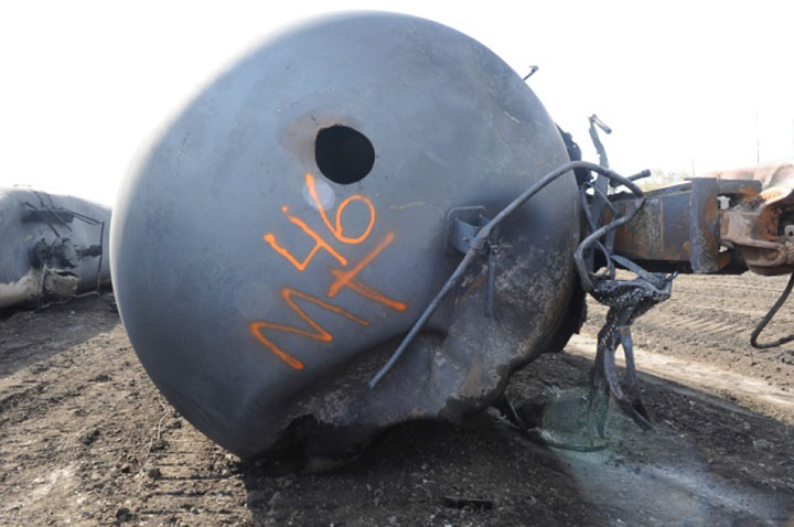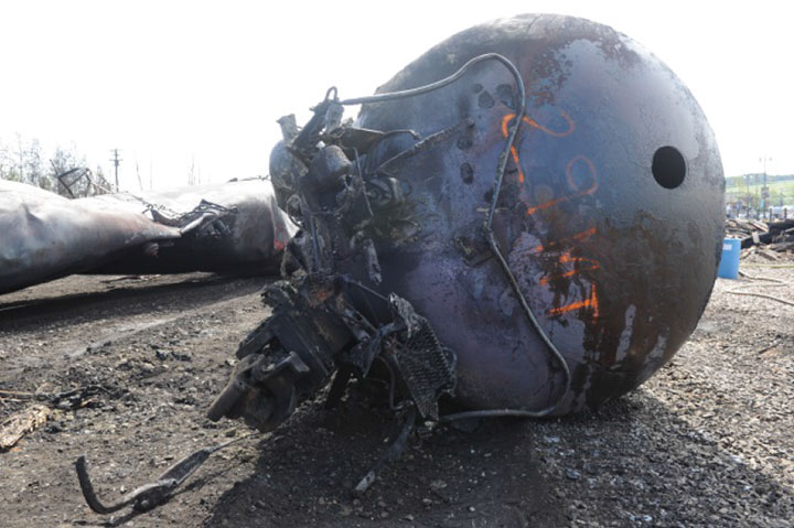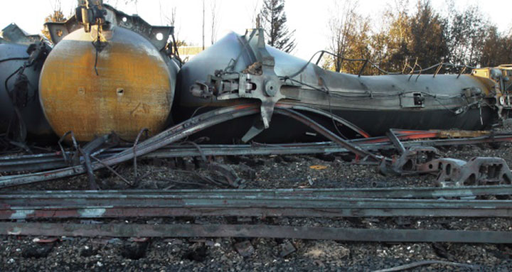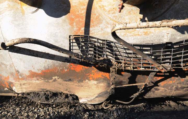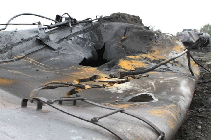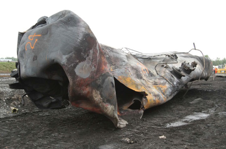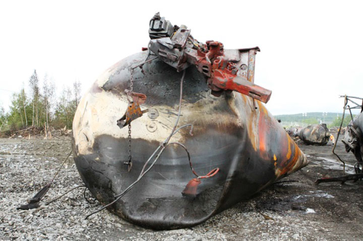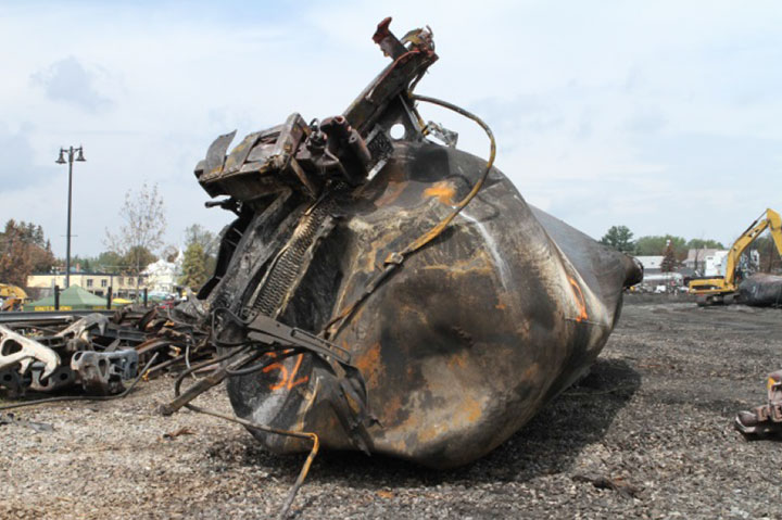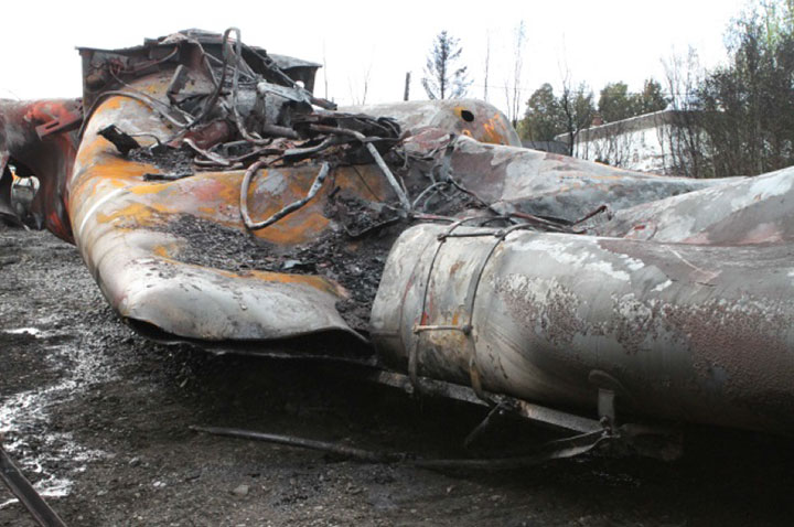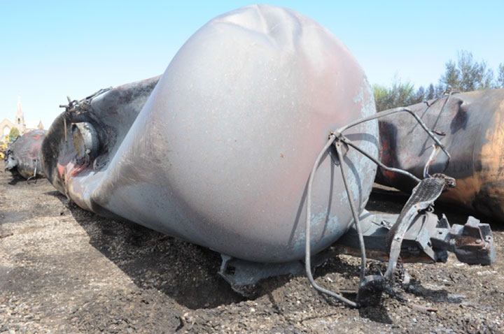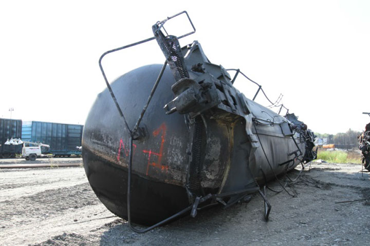 In some Tank cars, a “liquid-vapour line” was noted. This liquid-vapour line corresponds to a difference in the extent of fire damage sustained by the top and bottom portions of the tank as it came to rest. The top portion would have been in the vapour space during the post-derailment fire and thus more oxidized. The bottom portion was in the liquid space and had less fire damage due to the cooling effect of the liquid.
