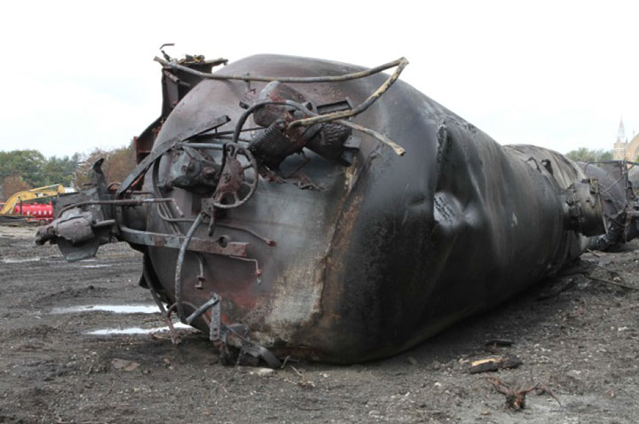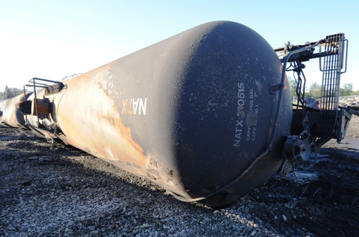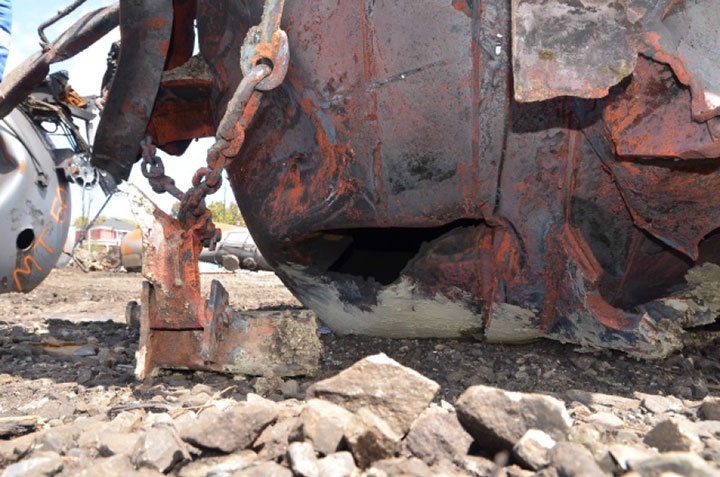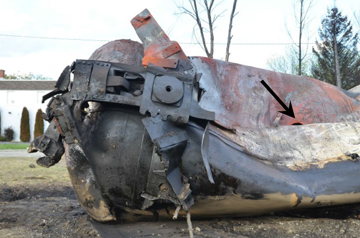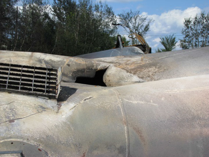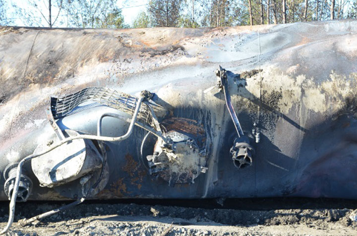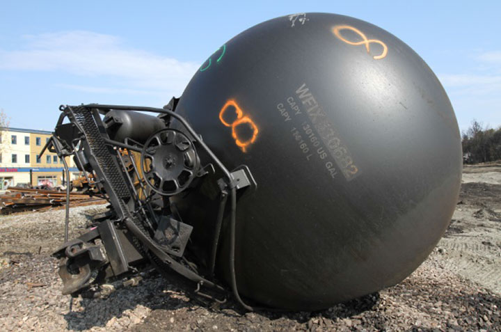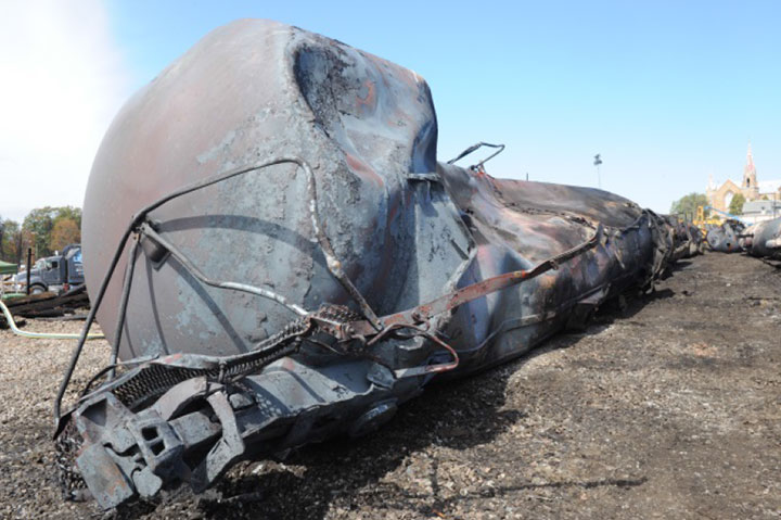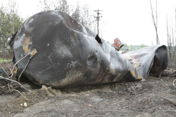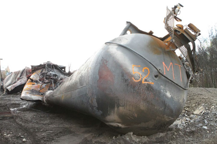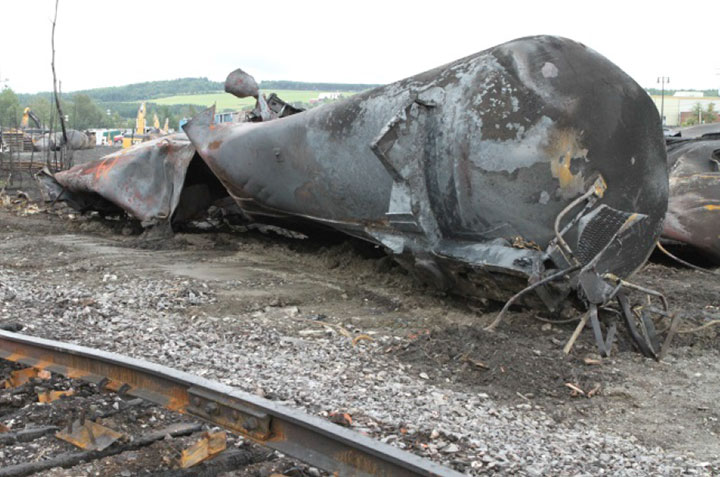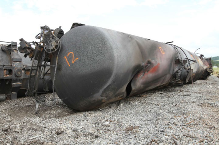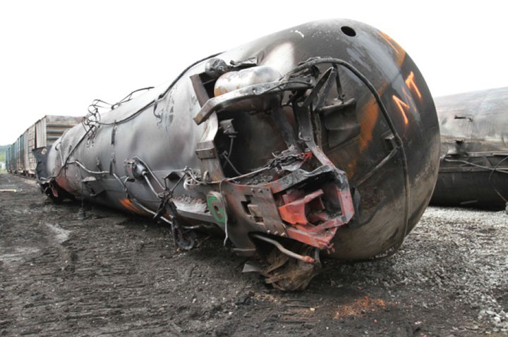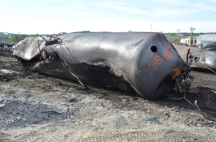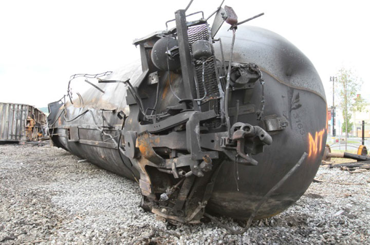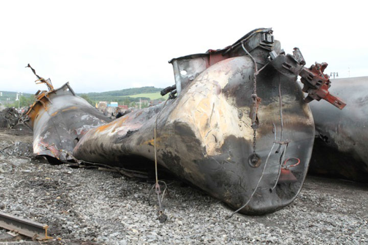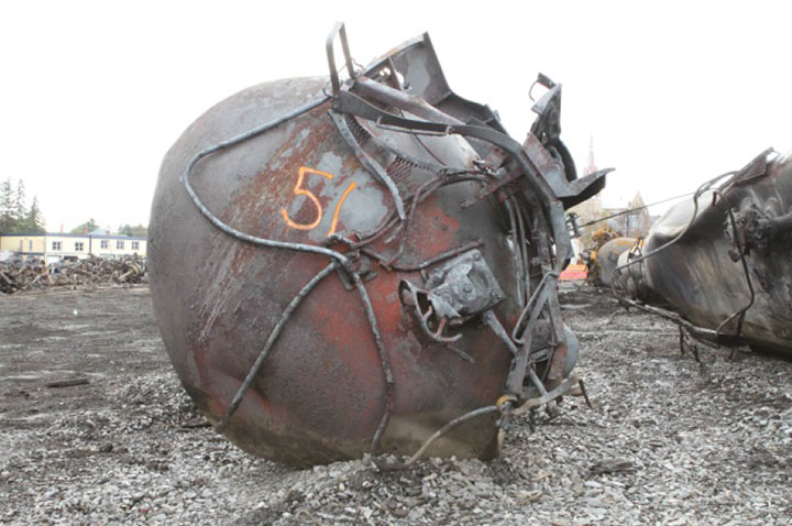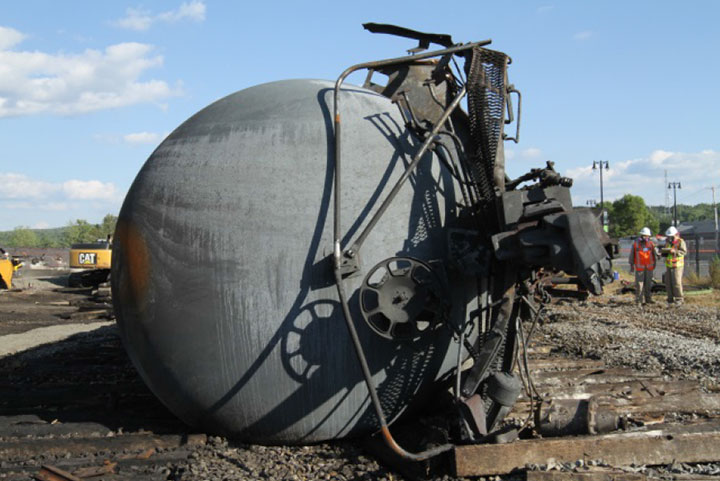 In some Tank cars, a “liquid-vapour line” was noted. This liquid-vapour line corresponds to a difference in the extent of fire damage sustained by the top and bottom portions of the tank as it came to rest. The top portion would have been in the vapour space during the post-derailment fire and thus more oxidized. The bottom portion was in the liquid space and had less fire damage due to the cooling effect of the liquid.