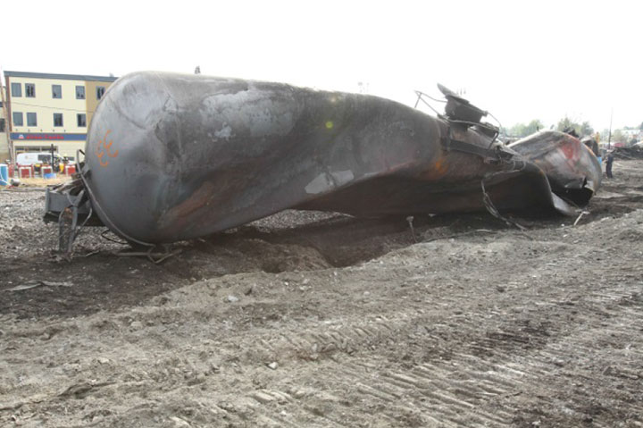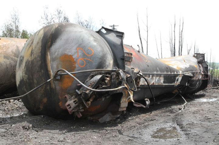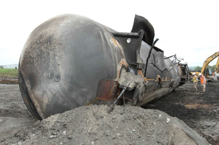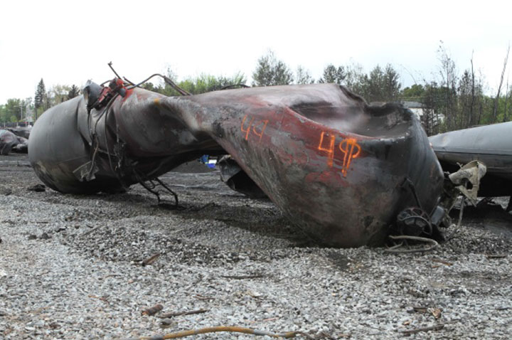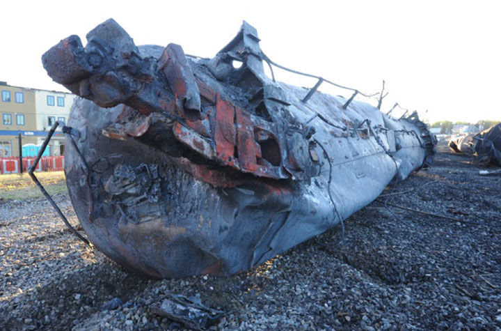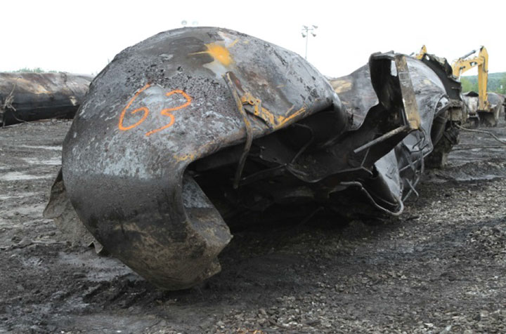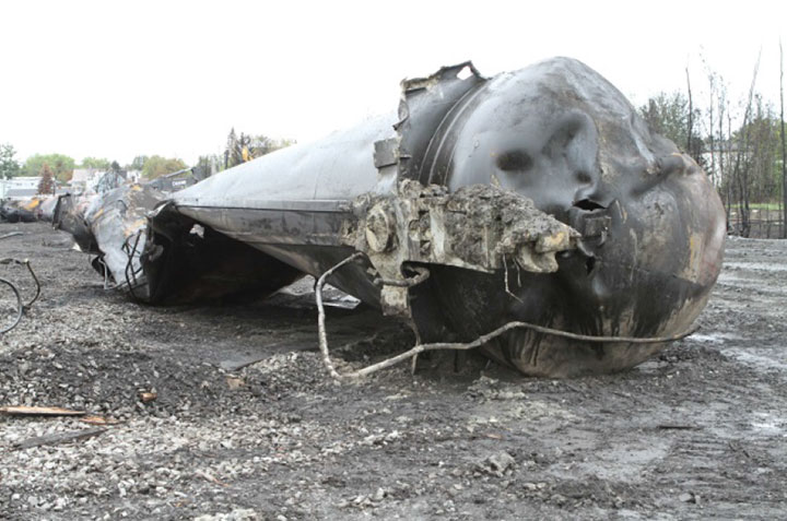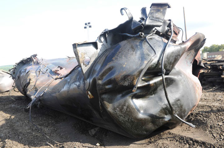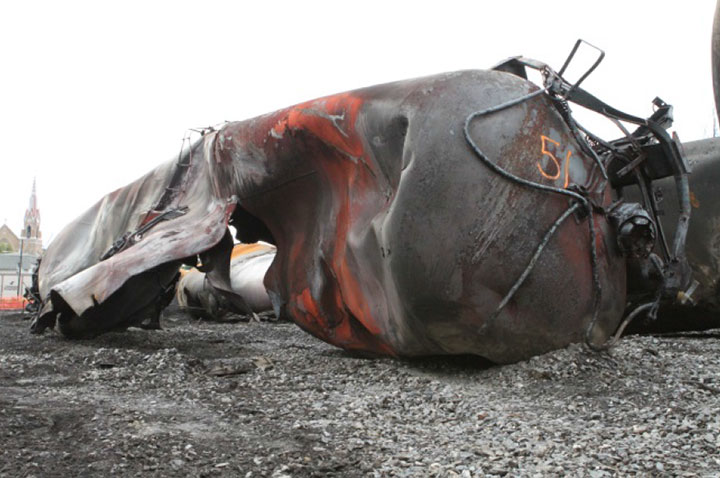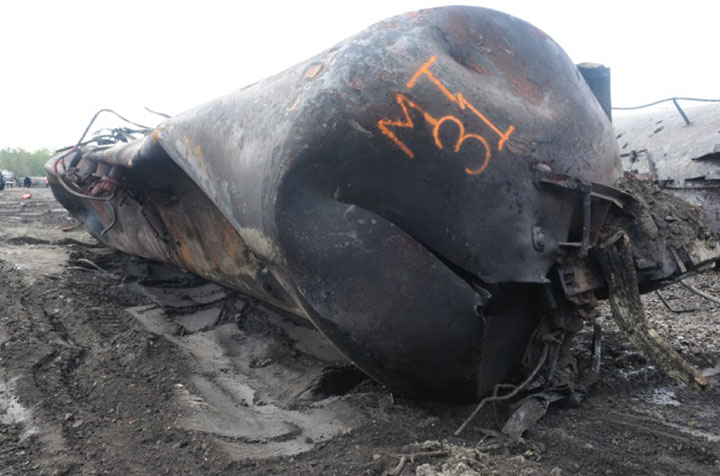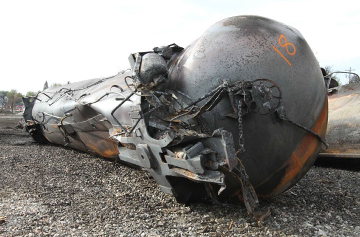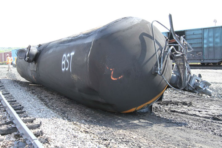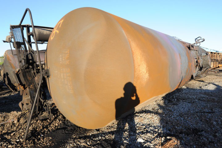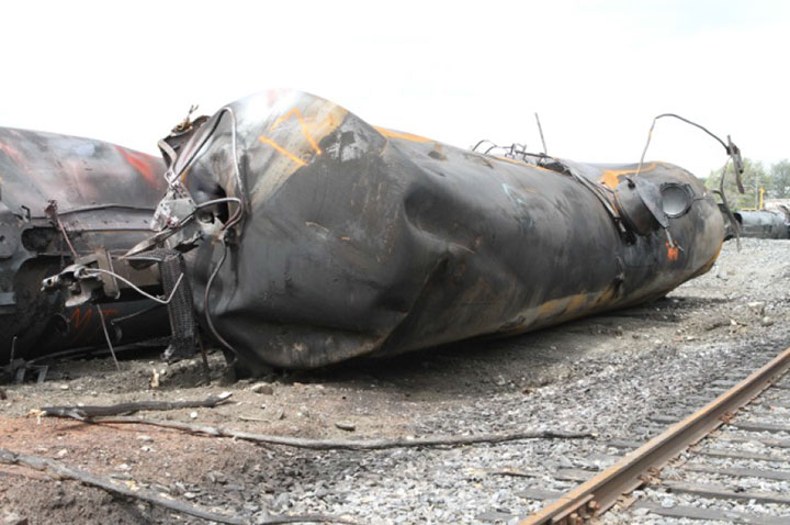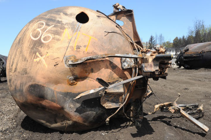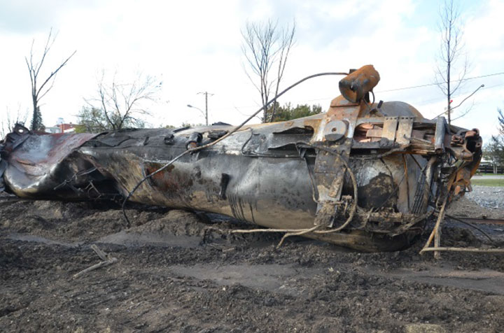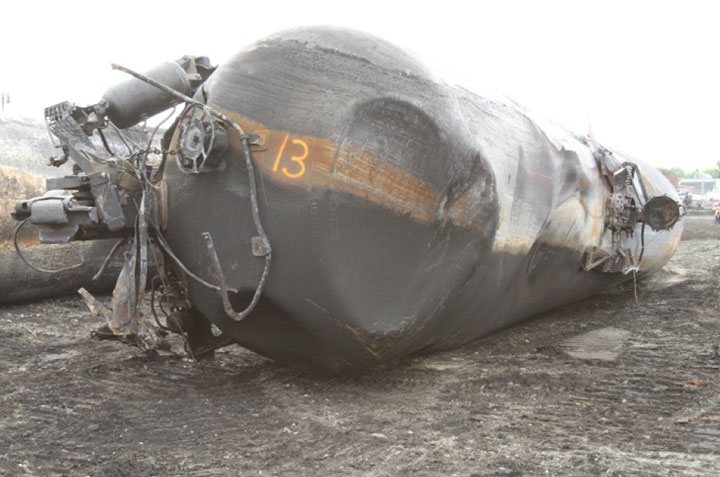 In some Tank cars, a “liquid-vapour line” was noted. This liquid-vapour line corresponds to a difference in the extent of fire damage sustained by the top and bottom portions of the tank as it came to rest. The top portion would have been in the vapour space during the post-derailment fire and thus more oxidized. The bottom portion was in the liquid space and had less fire damage due to the cooling effect of the liquid.