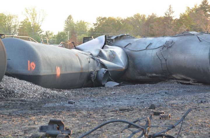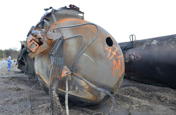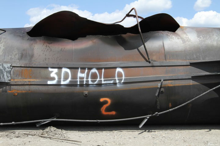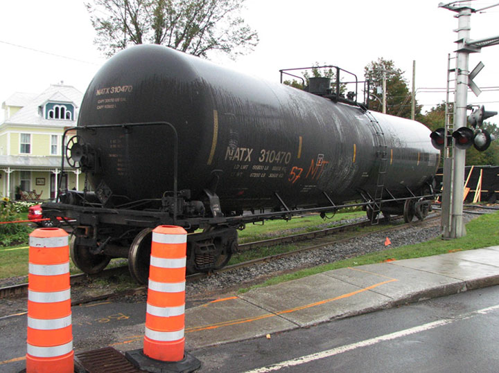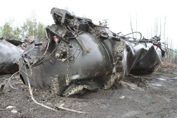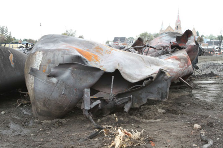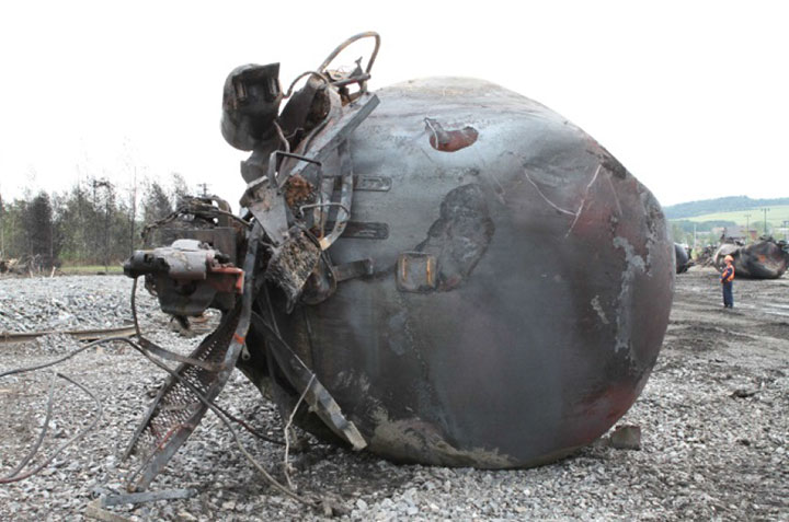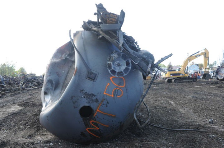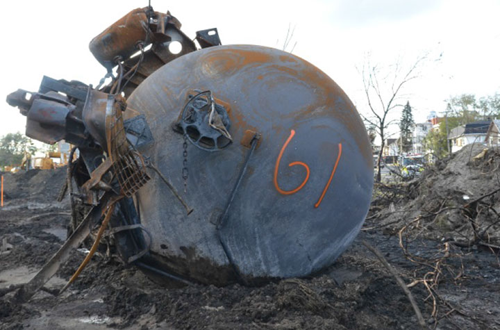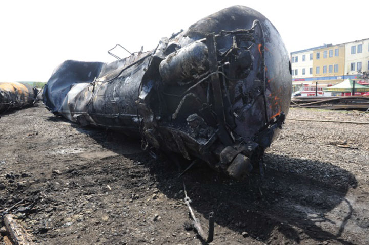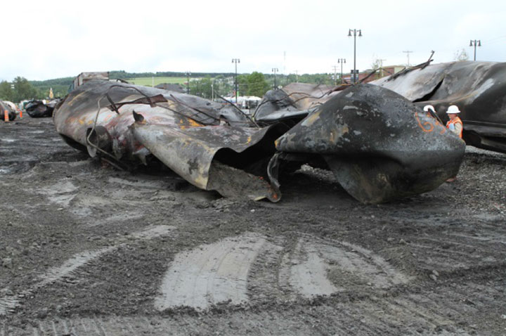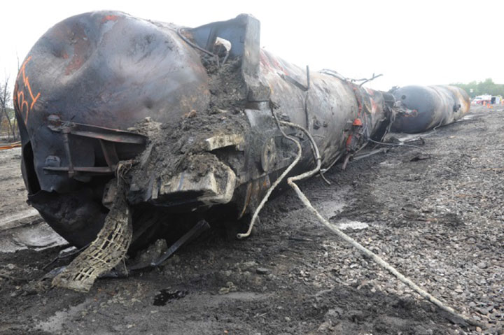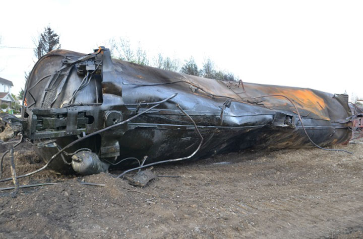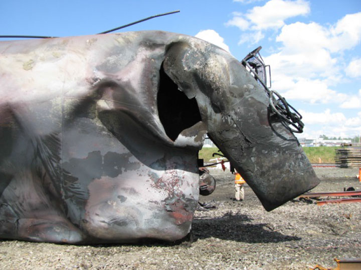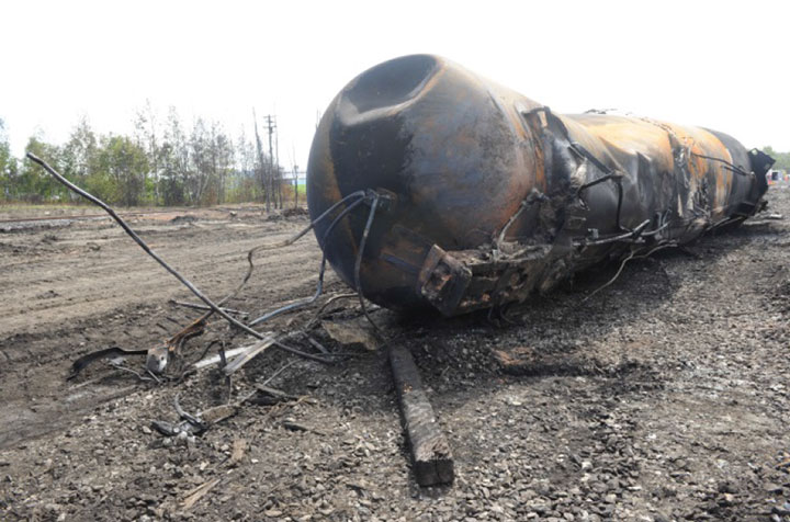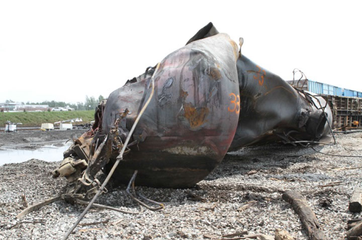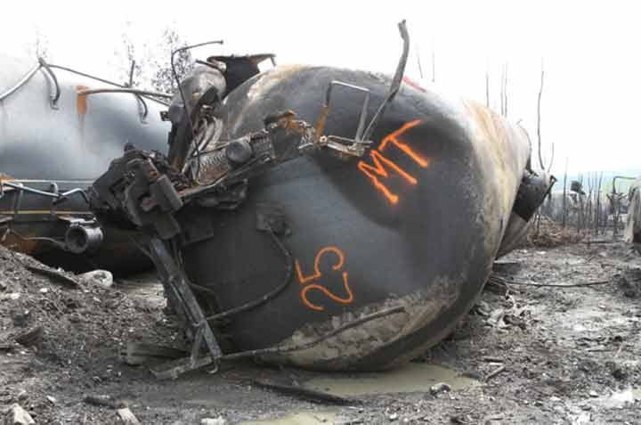 In some Tank cars, a “liquid-vapour line” was noted. This liquid-vapour line corresponds to a difference in the extent of fire damage sustained by the top and bottom portions of the tank as it came to rest. The top portion would have been in the vapour space during the post-derailment fire and thus more oxidized. The bottom portion was in the liquid space and had less fire damage due to the cooling effect of the liquid.