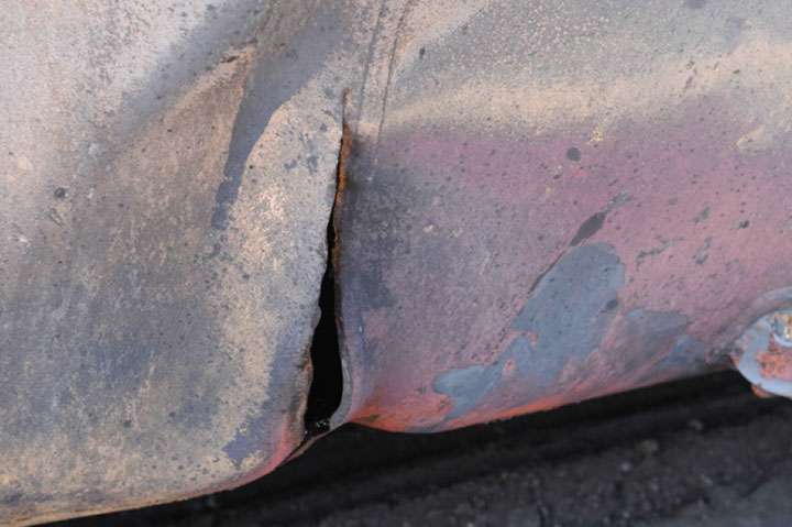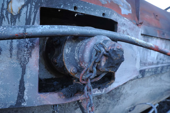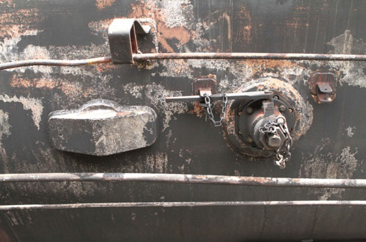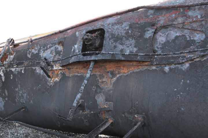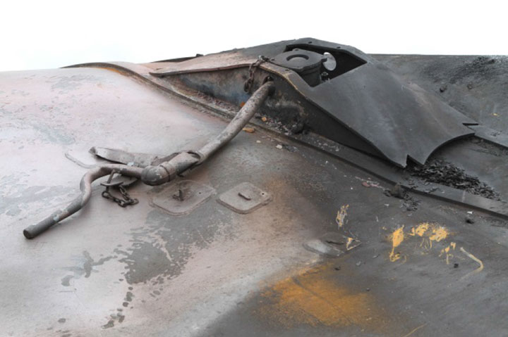 | Extent of fire damage | The exterior finish of this car was oxidized with a rusty discolouration and extensive fire damage above an inclined liquid/vapour line going from about 1/2 of the height at the A end to 2/3 of the height at the B end. There was a burn-through on the left side between the A end and the top fittings. |