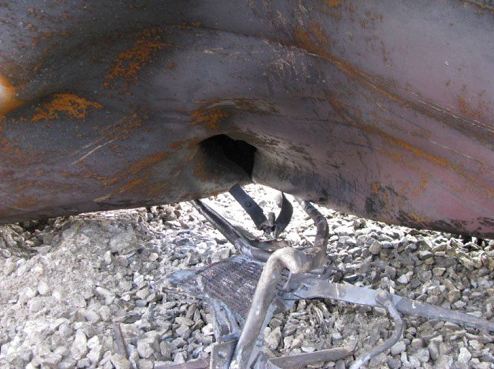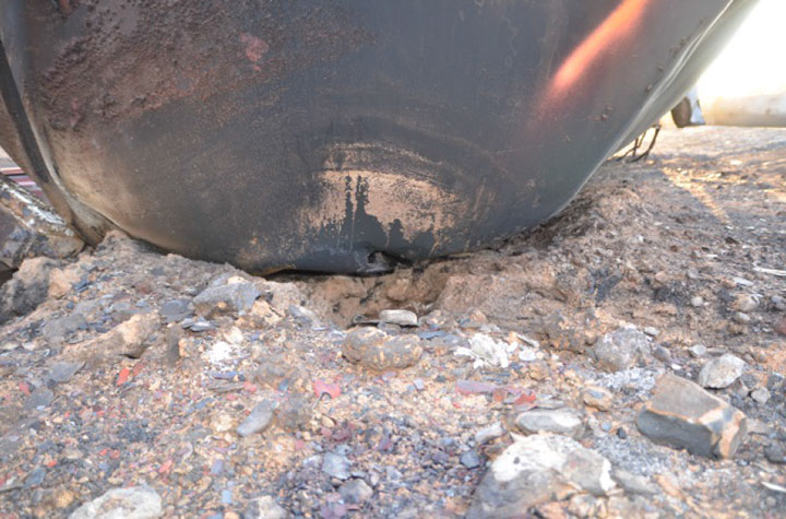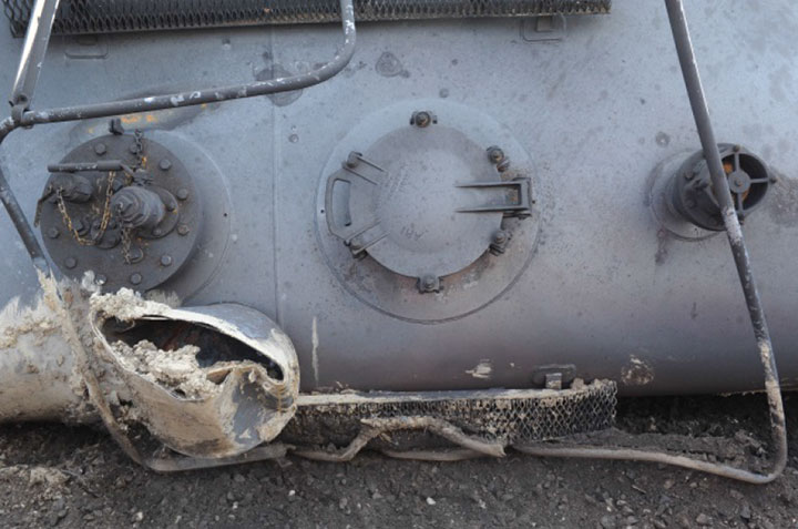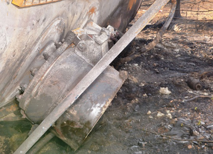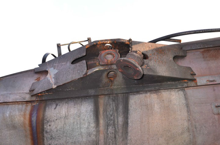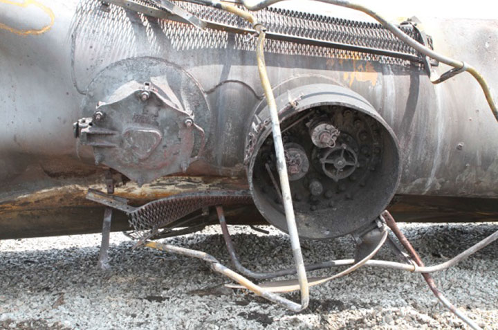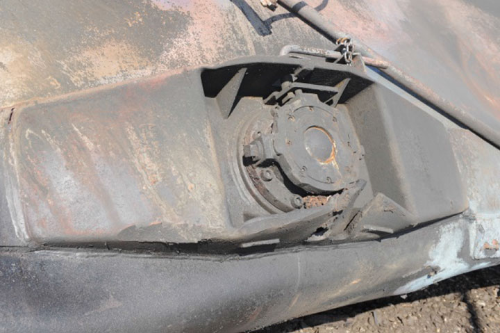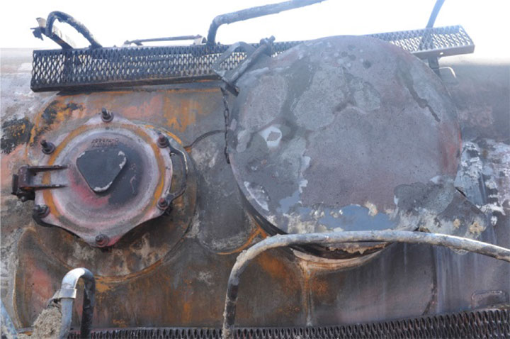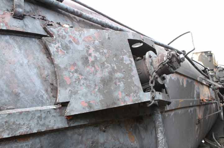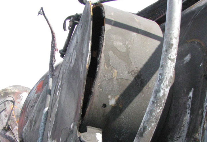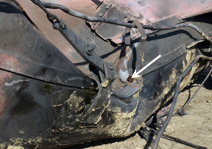 | Shell | The sides of the shell were deformed inward with a larger dent on the left side in the middle with a puncture in it. The body-mounted brake cylinder was torn off at the weld to the shell, with the crack breaching the tank. |