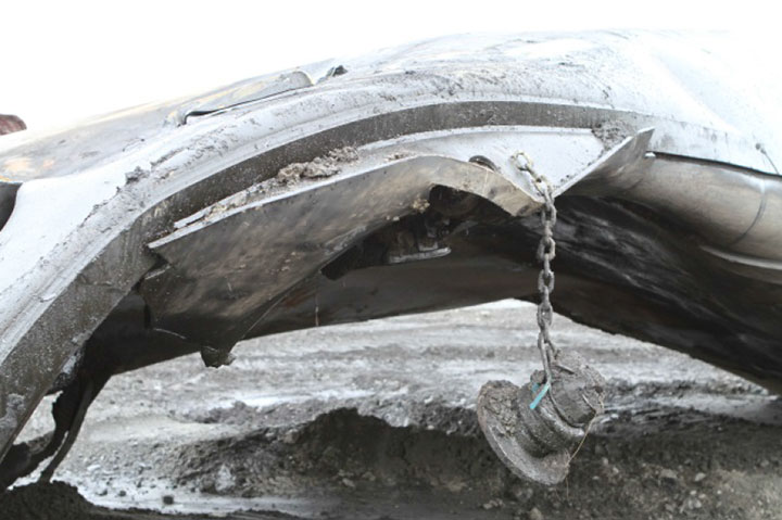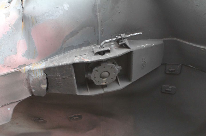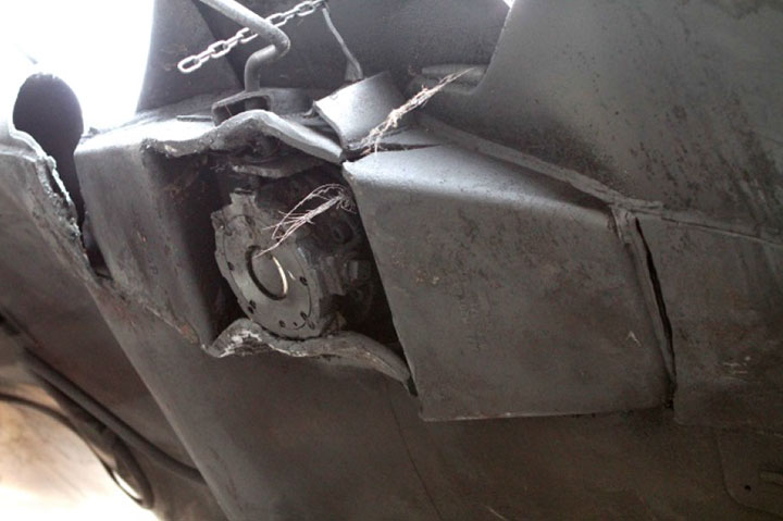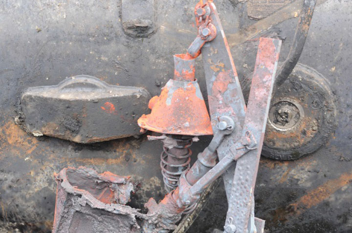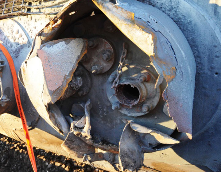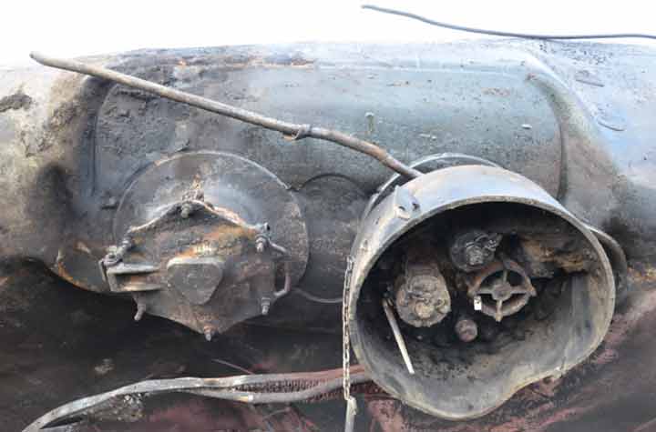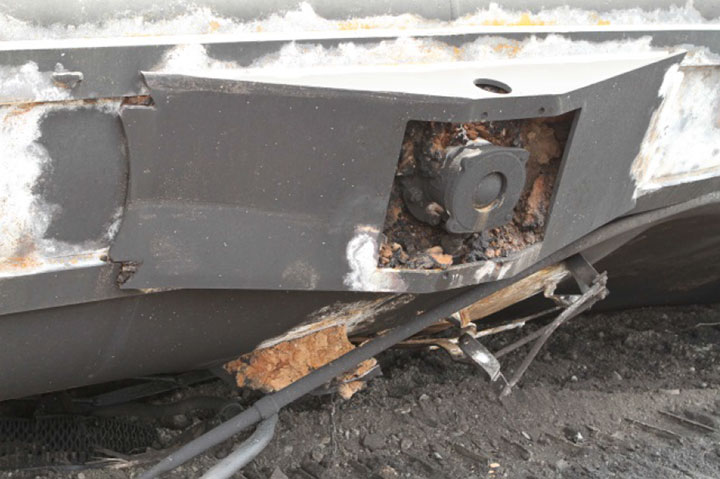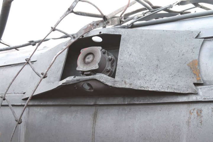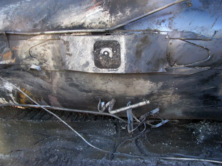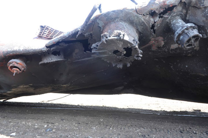 | Shell | The sides of the shell were deformed inward with a larger dent on the left side in the middle with a puncture in it. The body-mounted brake cylinder was torn off at the weld to the shell, with the crack breaching the tank. |