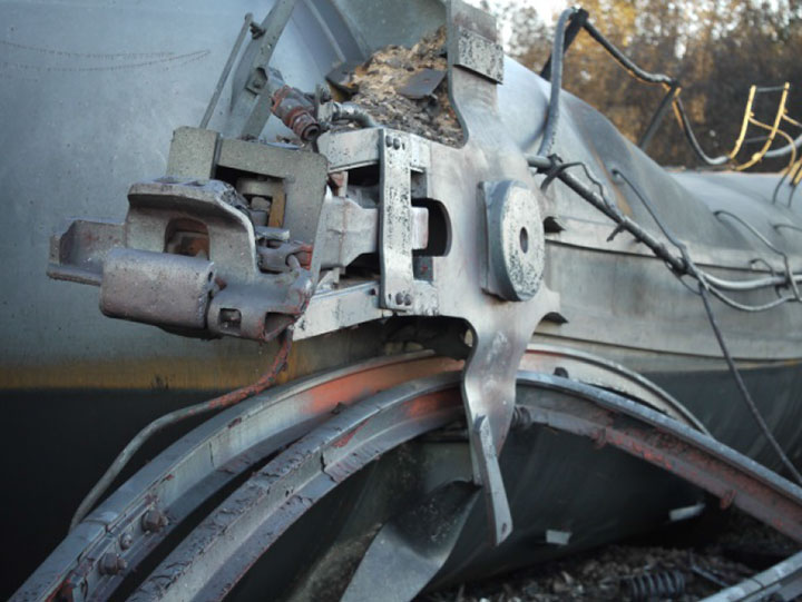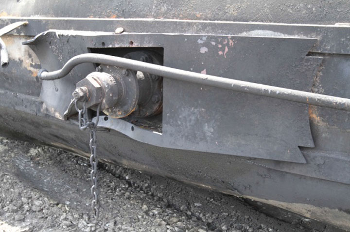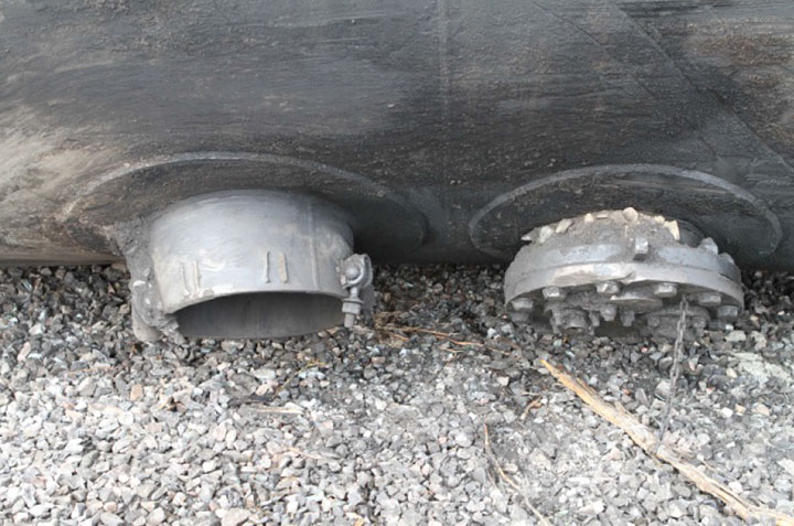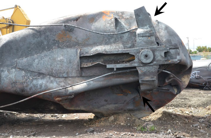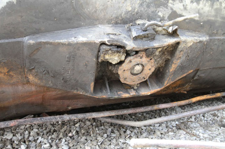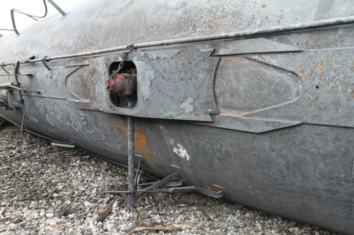 | Top fittings | The housing cover was open when examined by TSB but photographs taken by the RSI-AAR Safety Project team indicate it was closed and secured when the car came to rest. The fittings inside had no visible impact damage. It was noted that the housing was partly filled with product after the derailment, suggesting some fittings may have released product. |