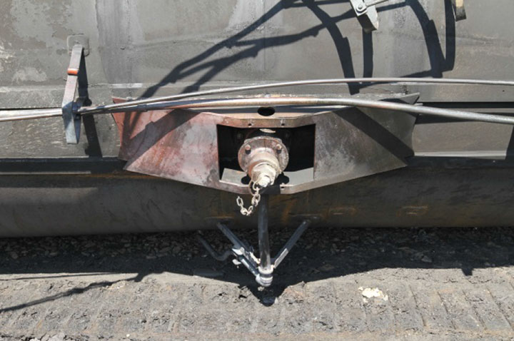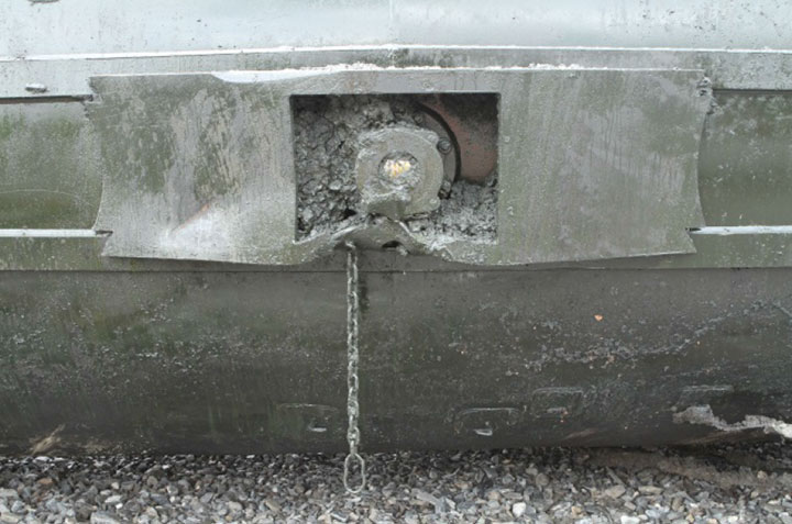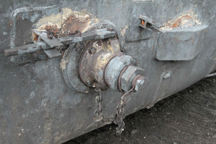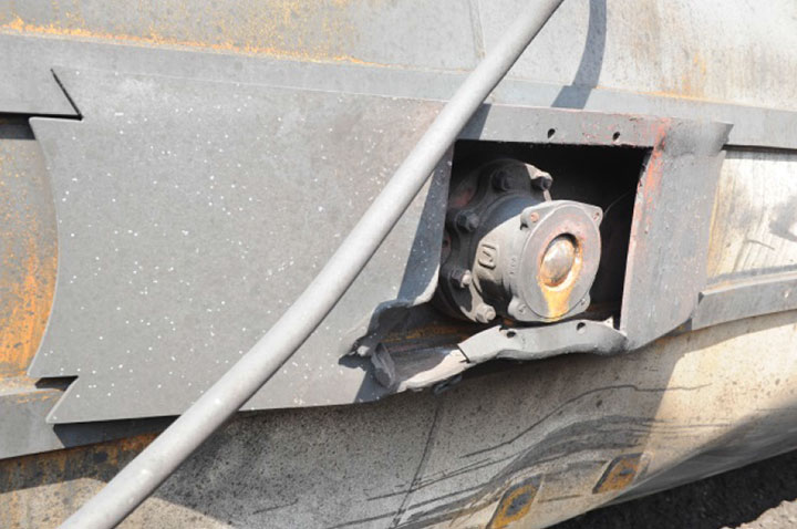 | Bottom outlet valve | This car did not have a skid; impact protection was provided by the BOV saddle. The base, handle and cap assembly had sheared off at the saddle as designed, exposing a closed plug. |