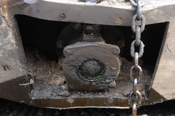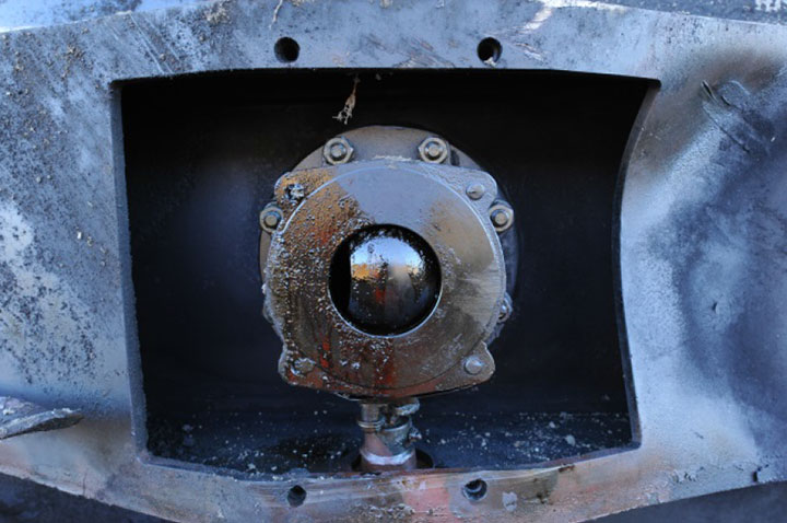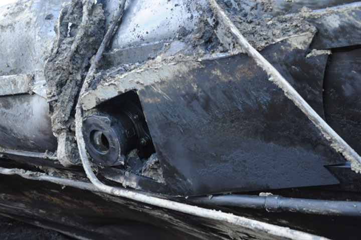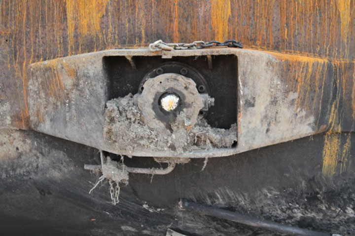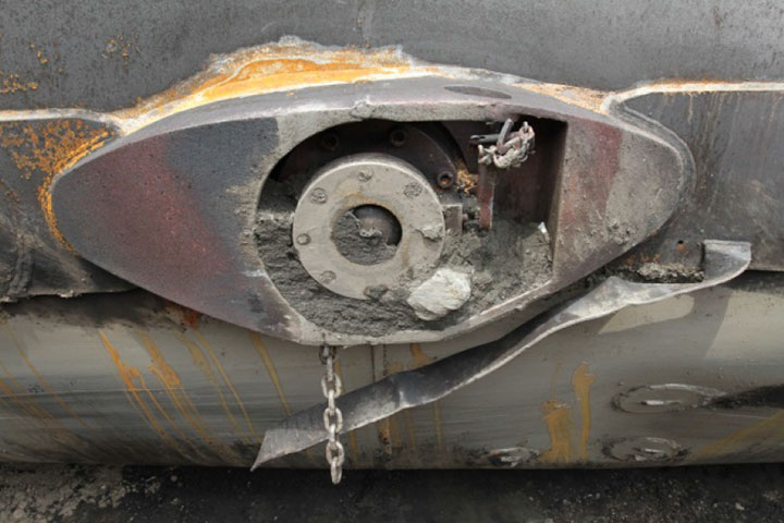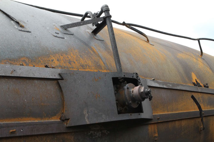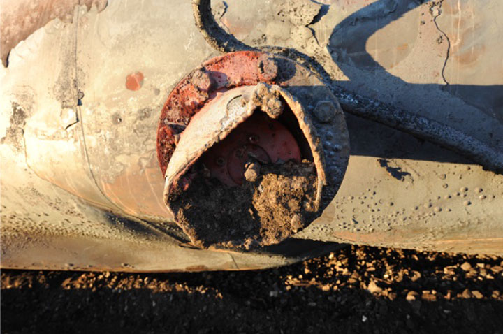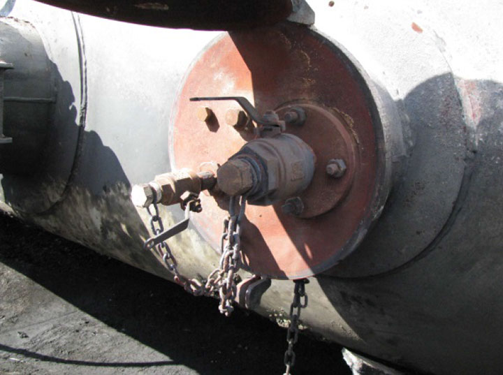 | Bottom outlet valve | The fabricated skid was unremarkable. The BOV nozzle and chain were still attached but covered with product residue. The BOV handle was deformed and had pulled out of its connection with the valve just inside the skid. |