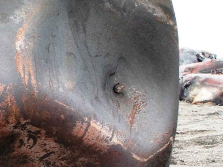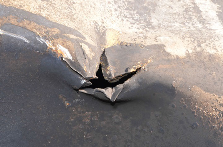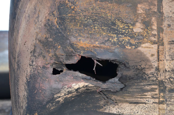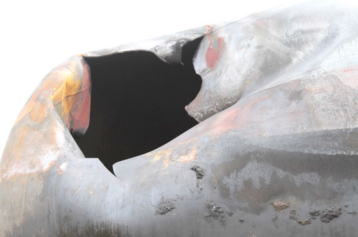 | Heads | The B end head had a deep dent in the top-left quadrant. It was punctured at the top-left edge near the head-to-shell weld. The A end head had no impact damage. |