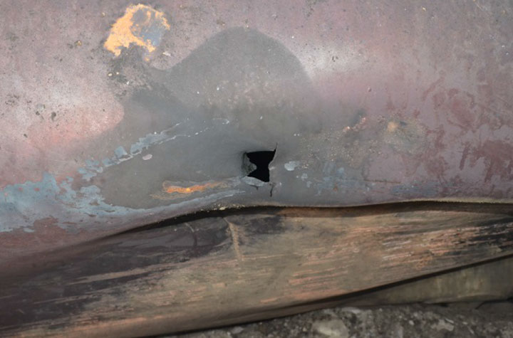 | Heads | The B end head had a shallow dent on its right side and a deep dent with a puncture at the left-bottom edge. The A end head was not inspected. |