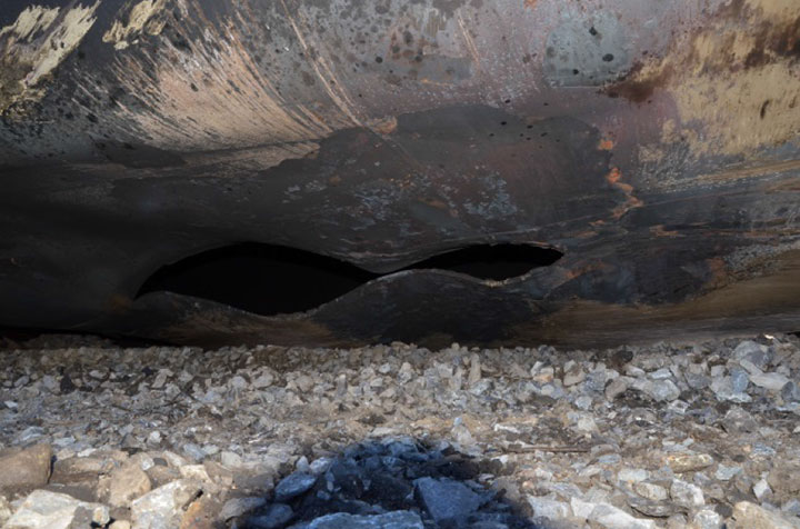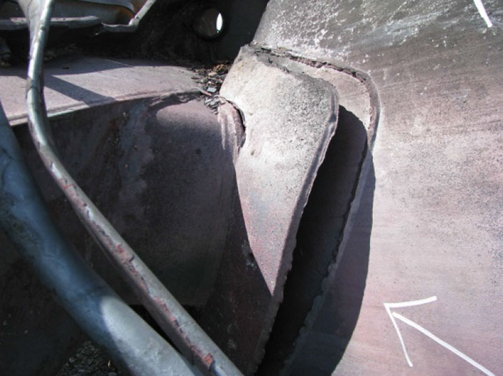| Shell | The top and bottom of the shell were extremely compressed by adjacent cars. This extreme deformation resulted in large transverse ruptures located between the B end and top fittings that nearly separated the shell into two portions. There was also a transverse buckle on the bottom near the A end and a deep dent on the top-left near the B end. |