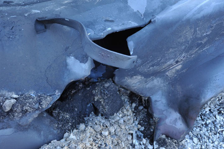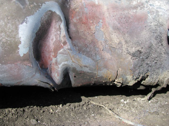 | Shell | The top-left side of the shell adjacent to the B end exhibited a large dent with a rectangular depressed area and an approximately 2-foot long puncture in the middle. |