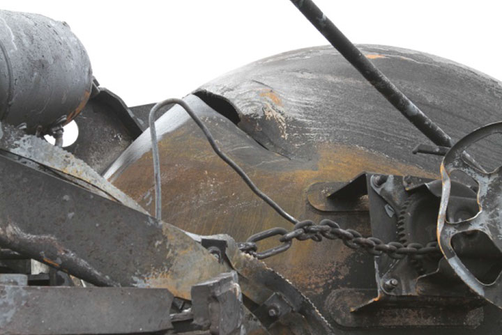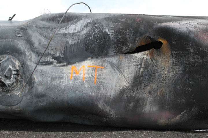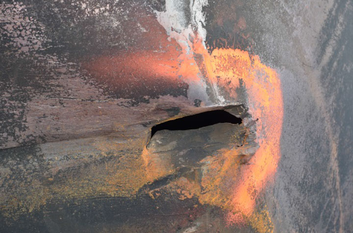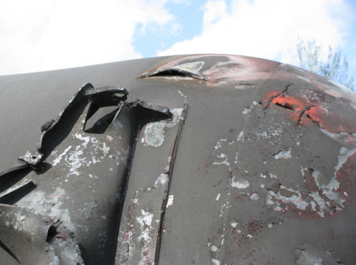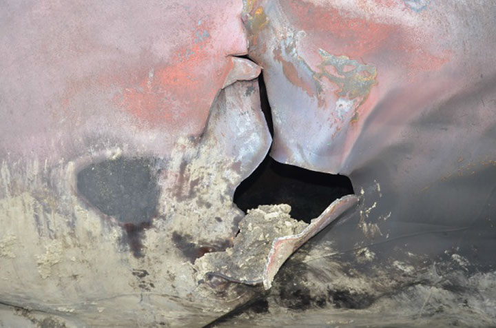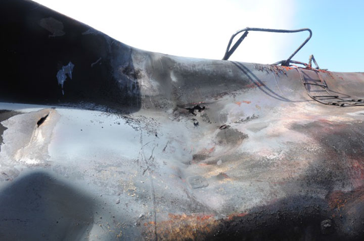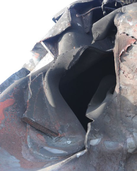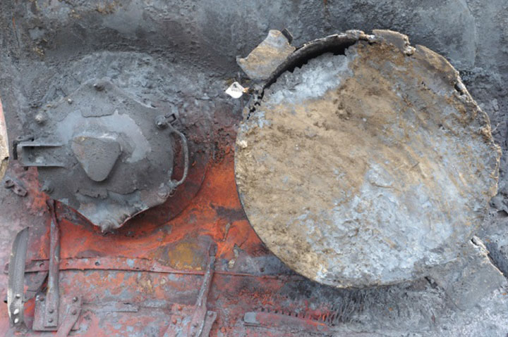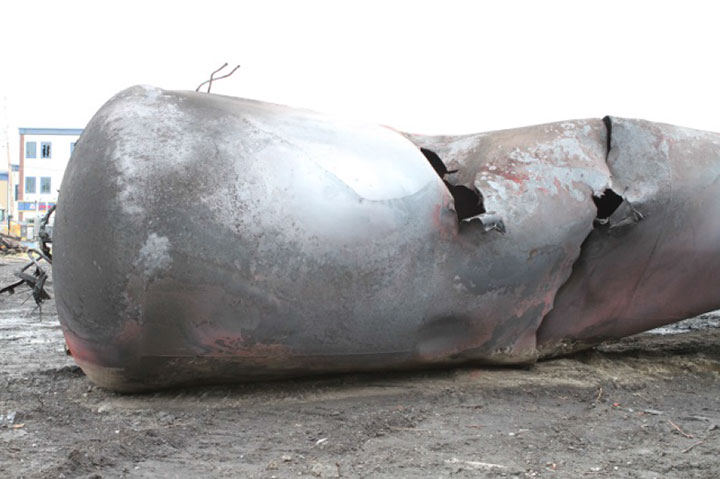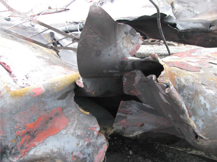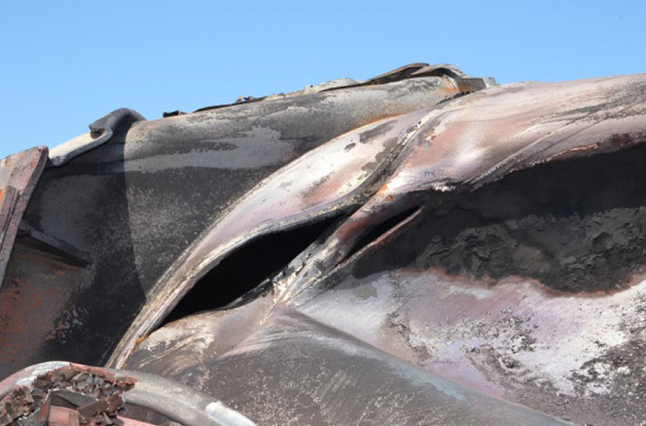 | Extent of fire damage | The area around the rupture and the bottom portion of the shell had extensive fire damage (red discolouration, flaking and metal loss). The rest was oxidized. |