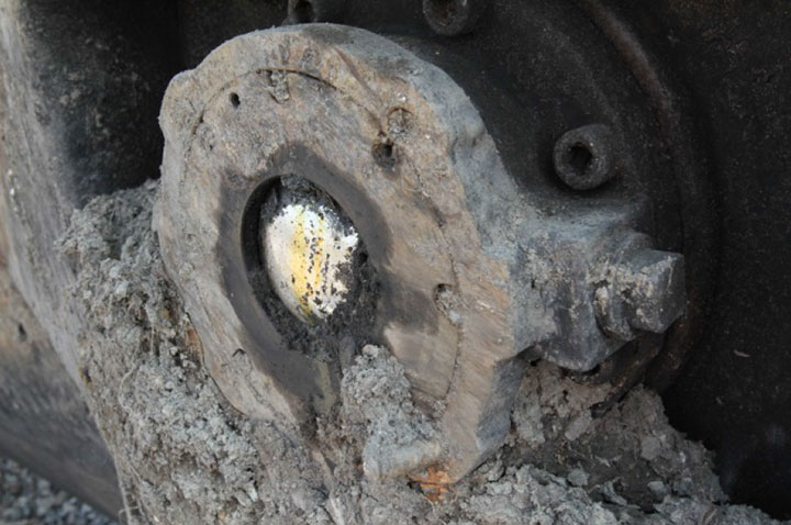 | Heads | The A end head had no impact damage. The top-left quadrant of the B end head contained a puncture with a piece of rail embedded in it. There was a second puncture of similar size adjacent to this puncture and a linear depression above it. Another piece of rail was stuck in a puncture in the BR bolster. |