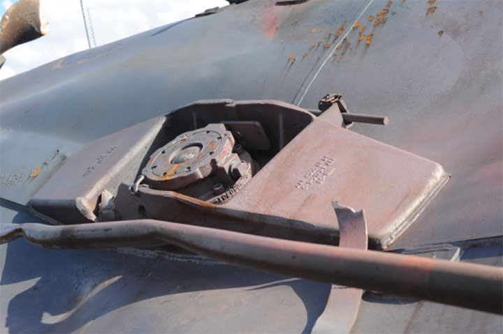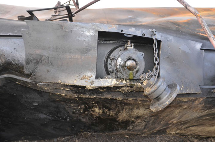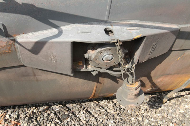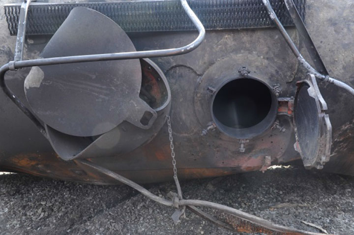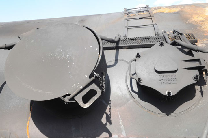 | Top fittings | The housing was deformed, torn and hanging from one side of the hinge. The fittings had no visible impact. A 2-inch ball valve had been removed after the derailment and was hanging from its chain. |