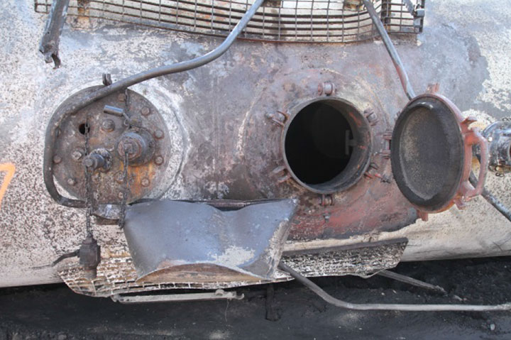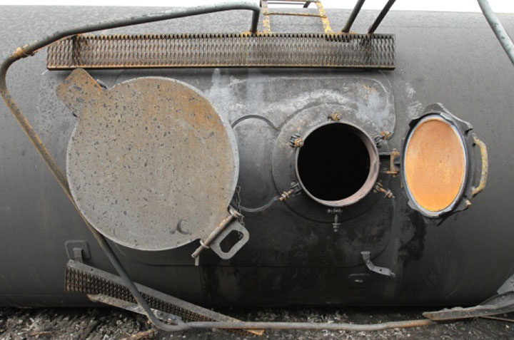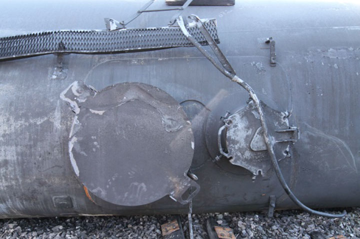 | Manway | The manway cover was open with 1 of the 6 bolts missing. The gasket was burnt. The cover was closed on aerial photographs of the derailment site indicating that it was opened during recovery operations. |