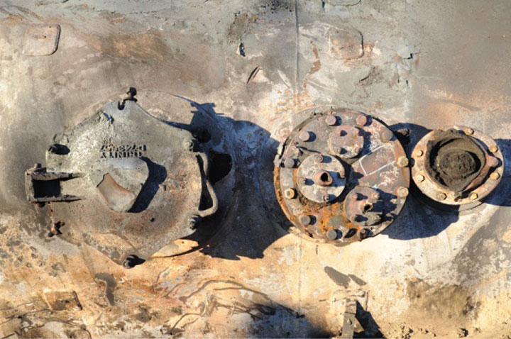 | Top fittings | The housing assembly and its closed cover were partially consumed by fire damage. There was no visible impact damage. The top fittings were only partially visible for inspection. The one fitting that was visible had no impact damage. The housing was partially filled with product residue, some of which had spilled out onto the shell. This indicates that product was released from inside the housing assembly. |