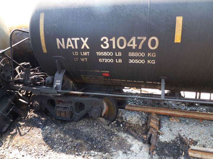 | Position and orientation of derailed car | This car came to rest on its left side, crushed between cars NATX 310508 and ACFX 79383 (consist no. 56 and 58) in the main pile-up and perpendicular to the direction of movement. |
