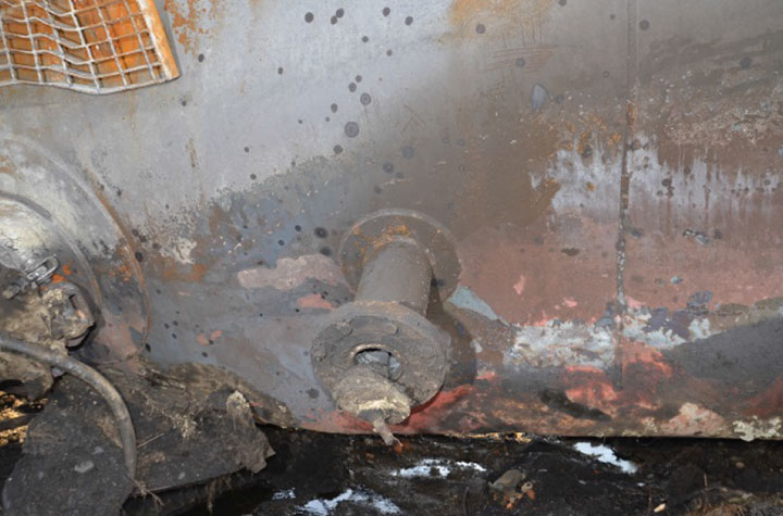 | Bottom outlet valve | The cast skid was broken at the side pointing towards the B end. The crack extended to the skid-to-shell weld and into the rupture in the shell. The BOV adaptor had sheared off at the flange, exposing a closed and oxidized BOV ball. The handle was closed and secured. |