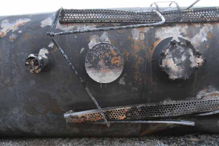 | Extent of fire damage | The exterior finish of the car exhibited fire damage throughout. The tank surface was more oxidized above a liquid/vapour line located at about 2/3 of the head height. |