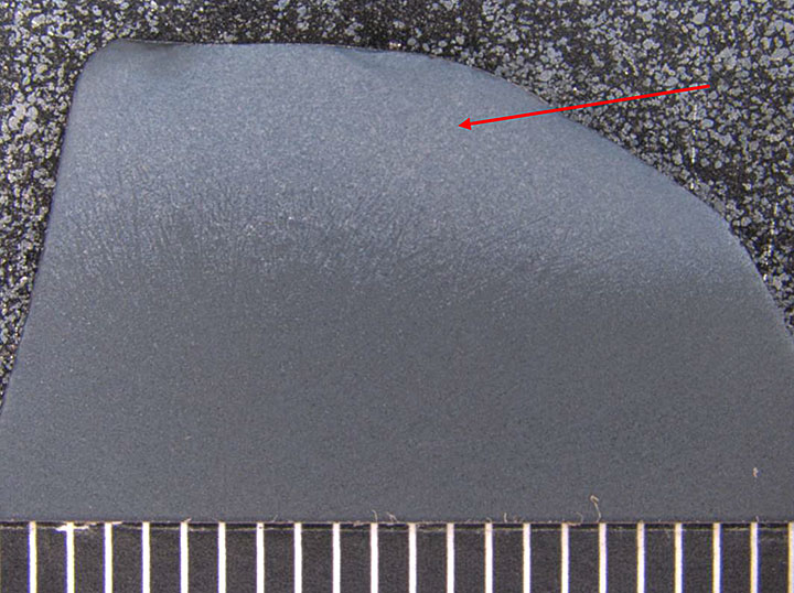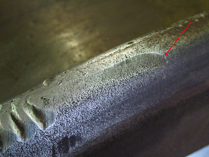 Examination of the mating wheel also revealed a similar feature on the wheel flange (Figures 6 and 7). This feature was located approximately 180 degrees from the feature on the subject wheel. Similar to the other wheel, the feature on this wheel had worn edges and an overall worn appearance.