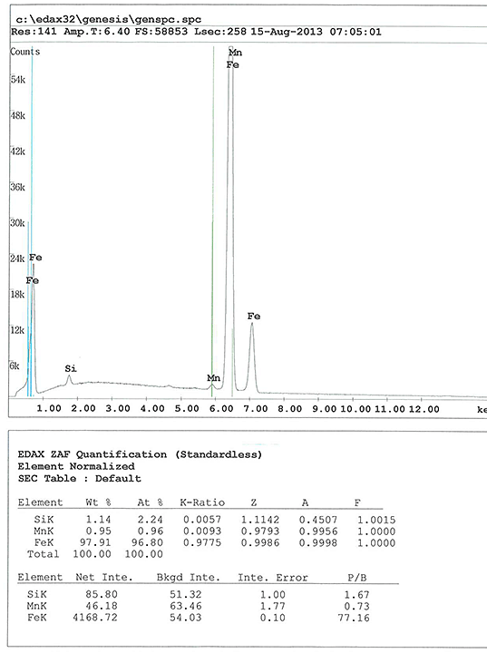 Energy dispersive spectroscopy (EDS) was performed on the metallurgical section taken from the subject wheel and the standard less results show the subject wheel gave manganese and silicon contents consistent with the AAR specification. The amount of carbon, phosphorus, and sulphur could not be measured. A representative spectrum is shown in Figure 14.