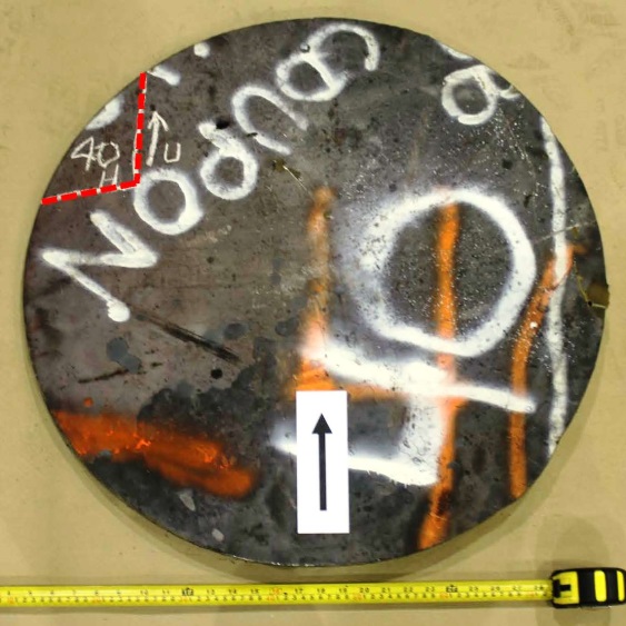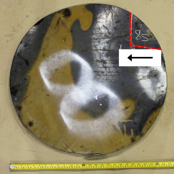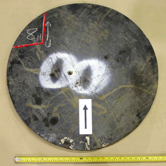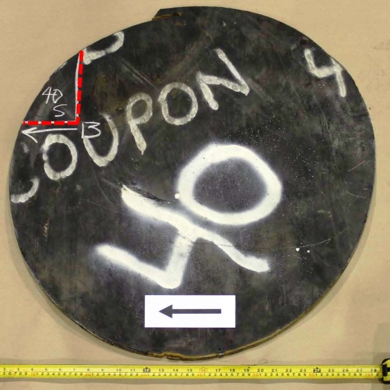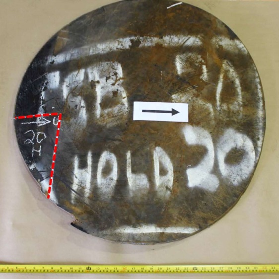 Figures 1 through 9 are photographs that show the coupons as marked on the cars. Coupons were taken from locations with as little impact and fire damage as possible, except for car WFIX 130571 from which a coupon was purposely taken from an area with extensive fire damage that contained a burn-throughFootnote 4 (Figure 6). The marked sections of cars were cut out using hydraulic shears before the cars were scrapped. Since hot work was not permitted on the occurrence site due to the fire hazard, an external company was contracted to cut circular coupons from the sheared-off sections of tank car using water-jet equipment. Figure 1a is a representative example of a sheared-off section of tank car after the circular coupon was cut out. Table 2 summarizes the identification and origin of each coupon. Figure 10 shows the water jet–cut coupons as received at the TSB Engineering Laboratory.