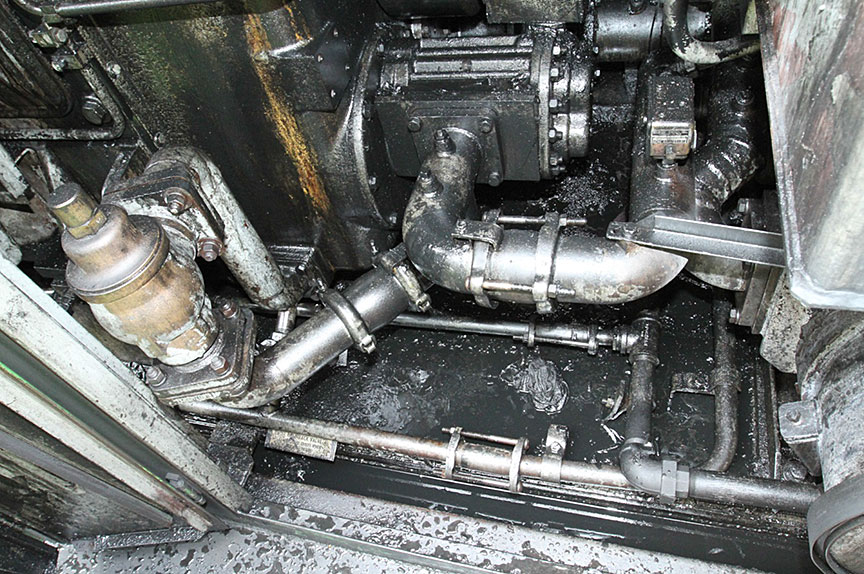 Initial field examination of the engine bay of MMA 5017 showed that engine oil had been dispersed inside the engine covers as well as outside, primarily near the turbocharger end of the engine. It could not be determined how much engine oil had been present in the engine bay prior to the fire, nor the extent to which this oil was disturbed in the act of extinguishing the fire. However, a significant amount of engine oil was observed all around the forward end of the engine (Figure 1).