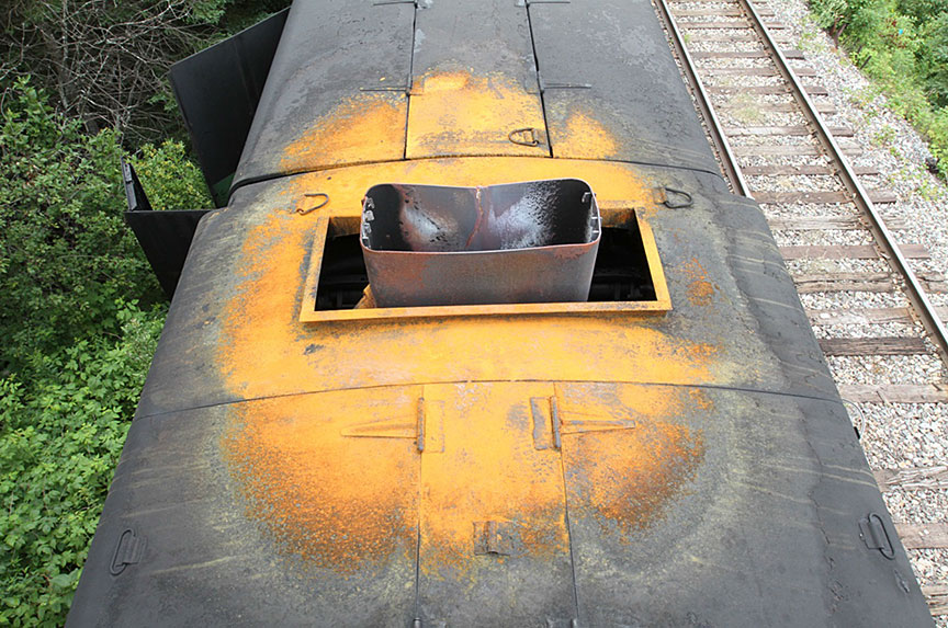 To facilitate further engine examination and a partial engine teardown, the locomotive consist was moved from Lac-Mégantic, Quebec to a maintenance facility in Saint John, New Brunswick. MMA 5017 was moved indoors and prepared for teardown. Removal of the exhaust stack allowed suction draining of the turbocharger body which contained approximately 10 liters of engine oil and 10 liters of water. The water was considered to have entered the turbocharger body as a result of firefighting operations.